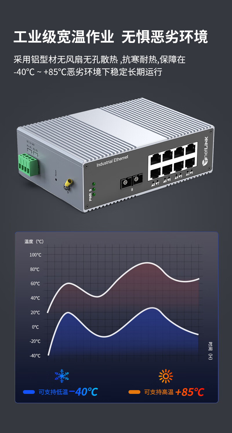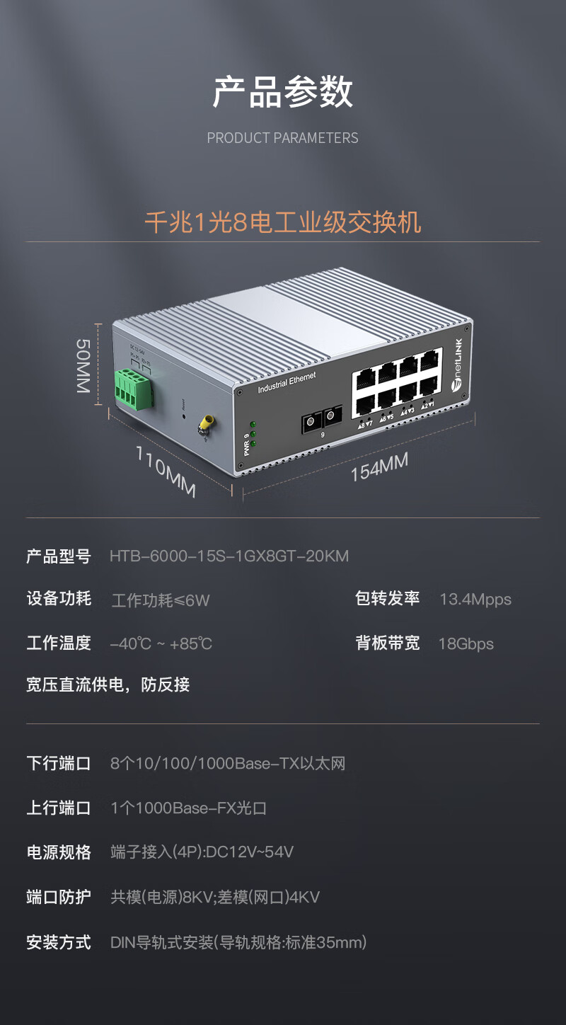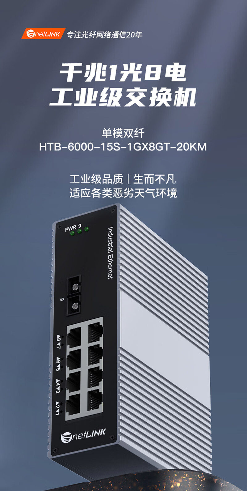 NetLINK industrial-grade optical fiber transceiver, Gigabit 1 optical 8 electrical single-mode dual-fiber optical-to-electrical converter, one rail-type industrial switch HTB-6000-15S-1GX8GT-20KM