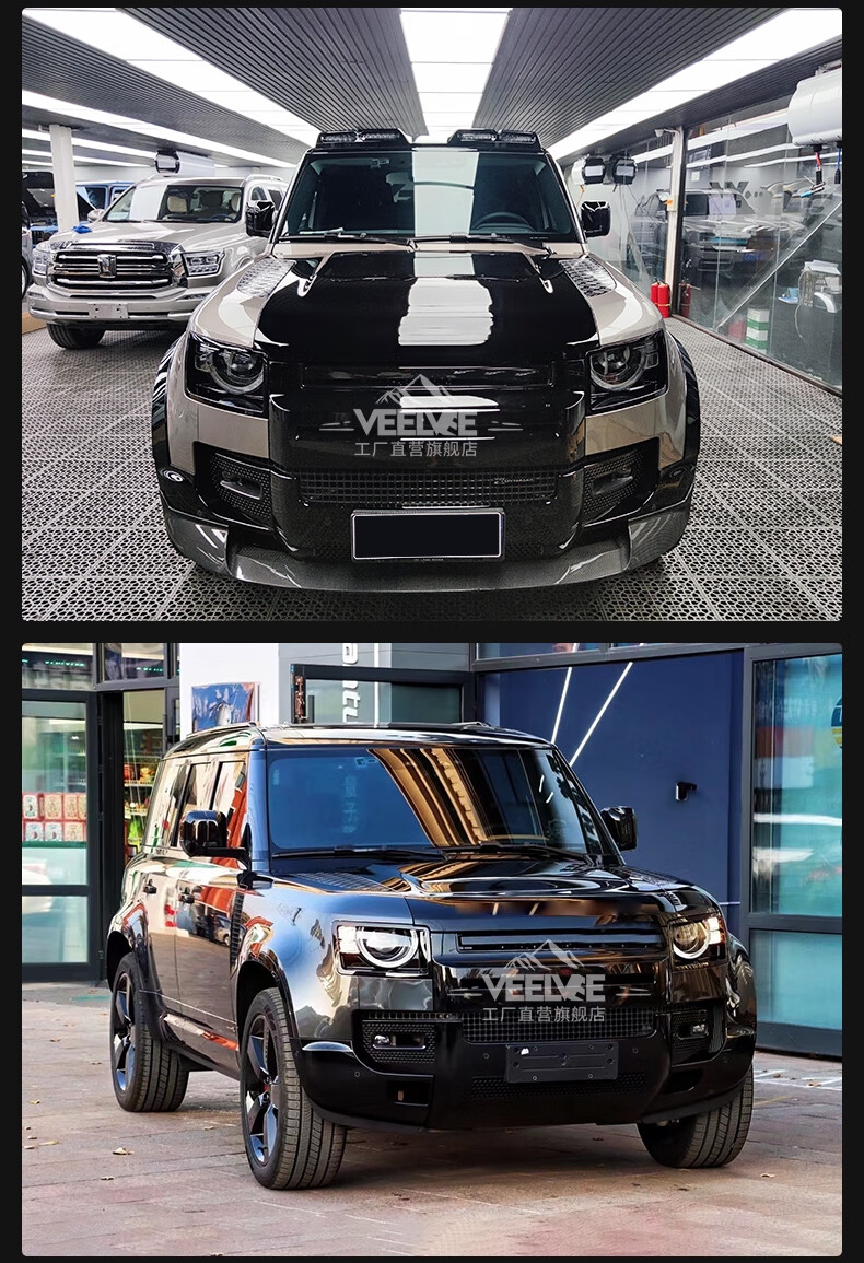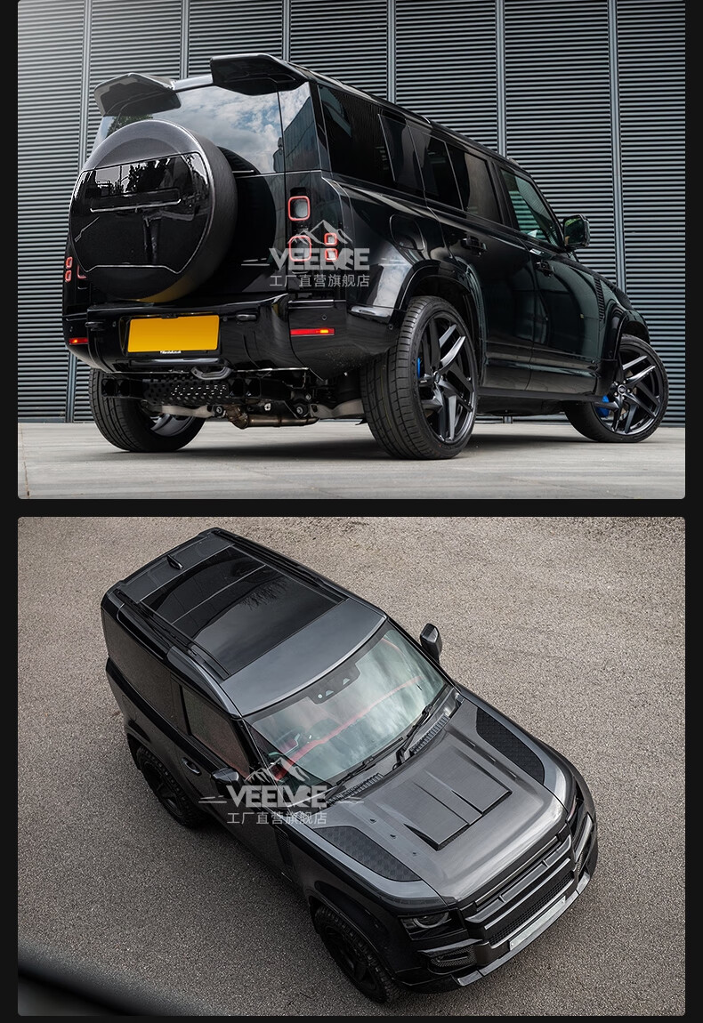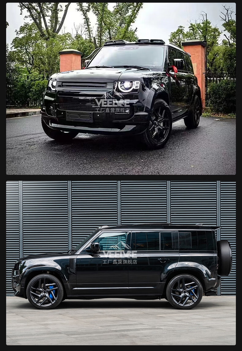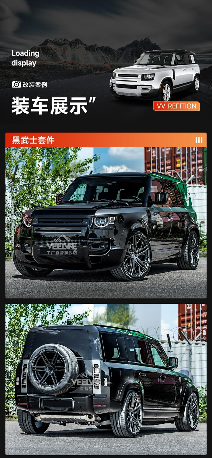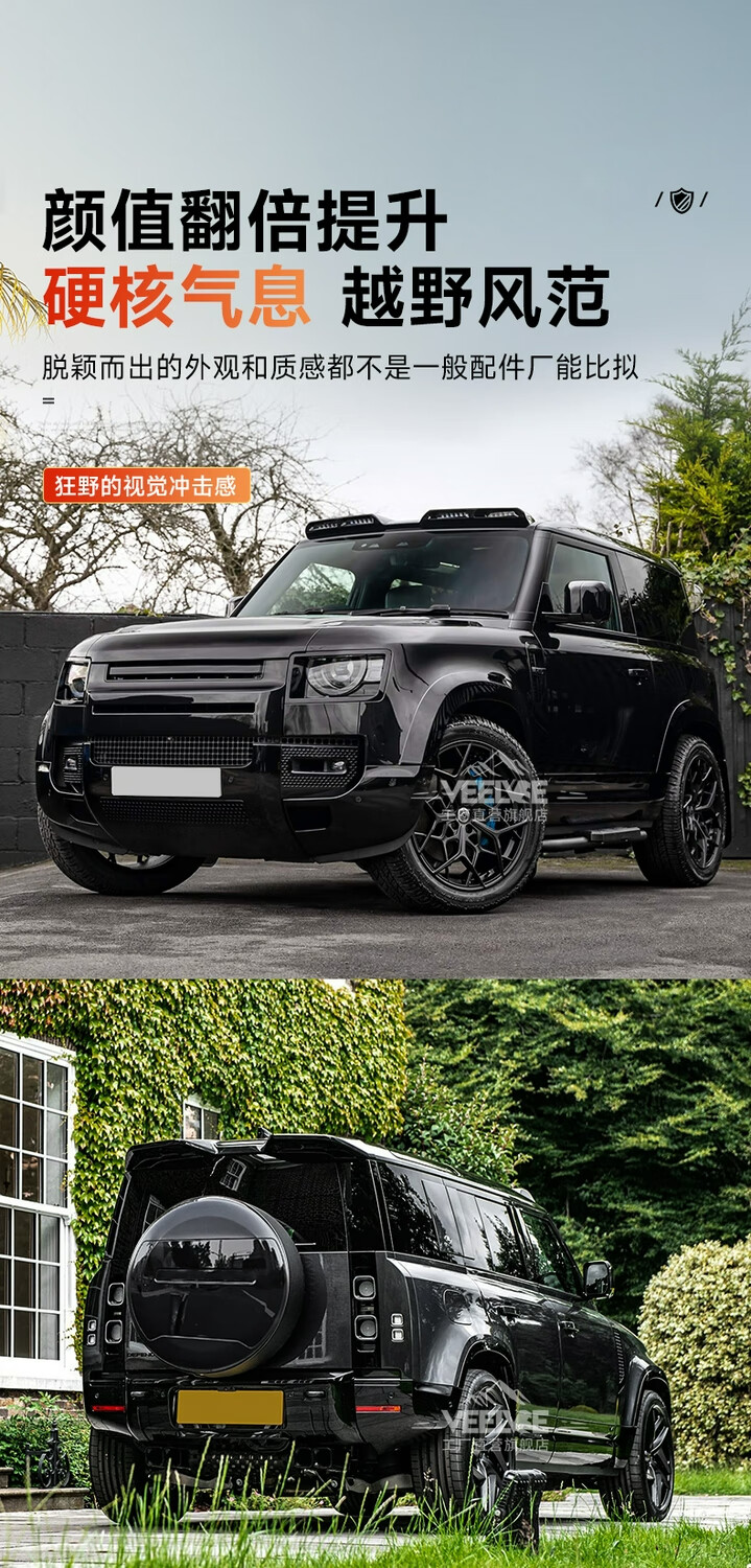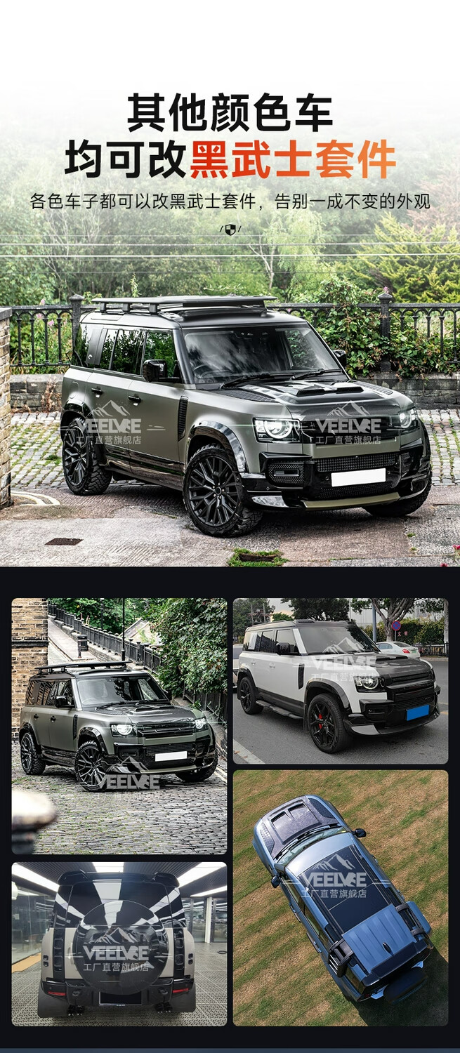 Yusenyi is suitable for Land Rover's new Defender Black Warrior Kit 007. The front and rear surrounds, rear wings and tail throats are blackened. Black Warrior hood air outlet/gloss black/replacement model