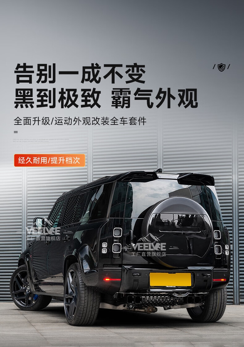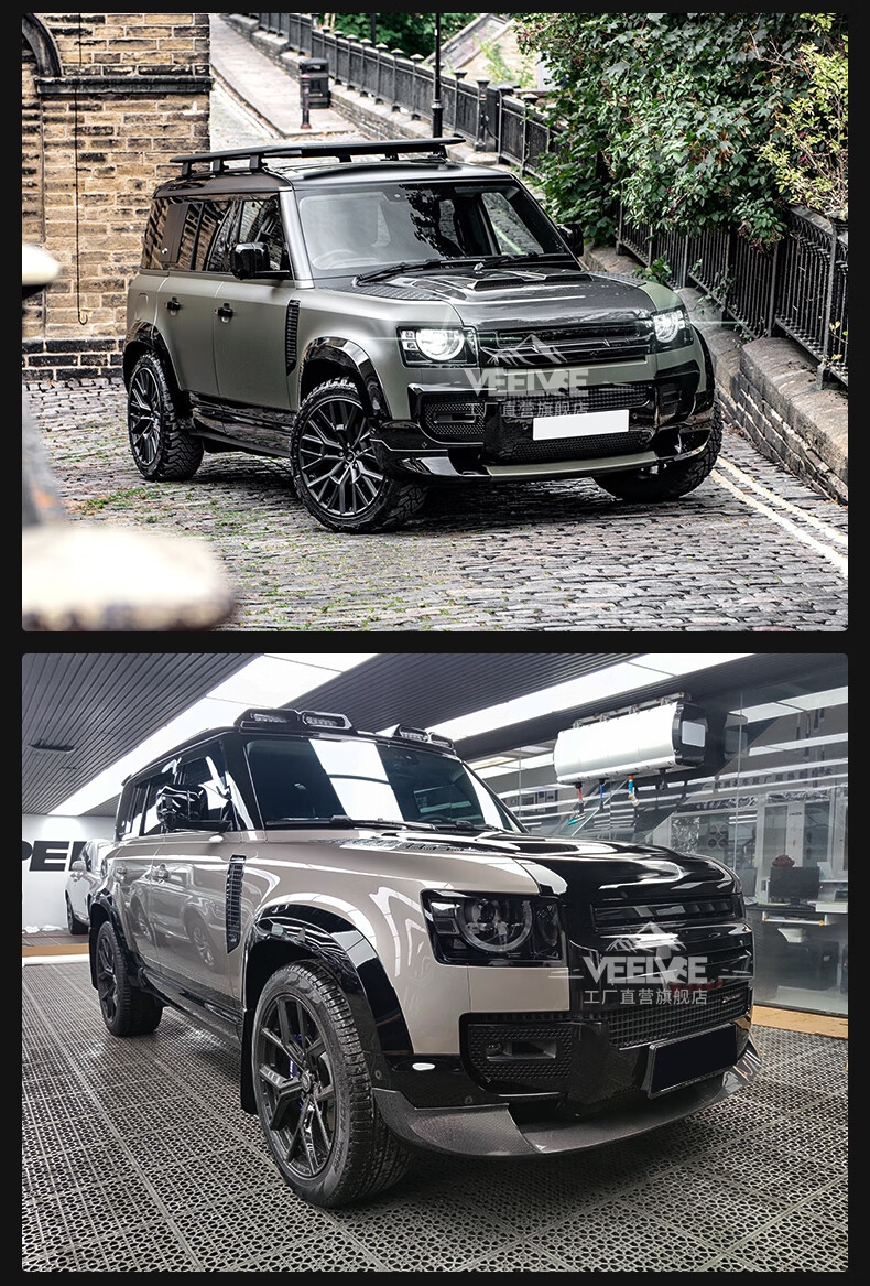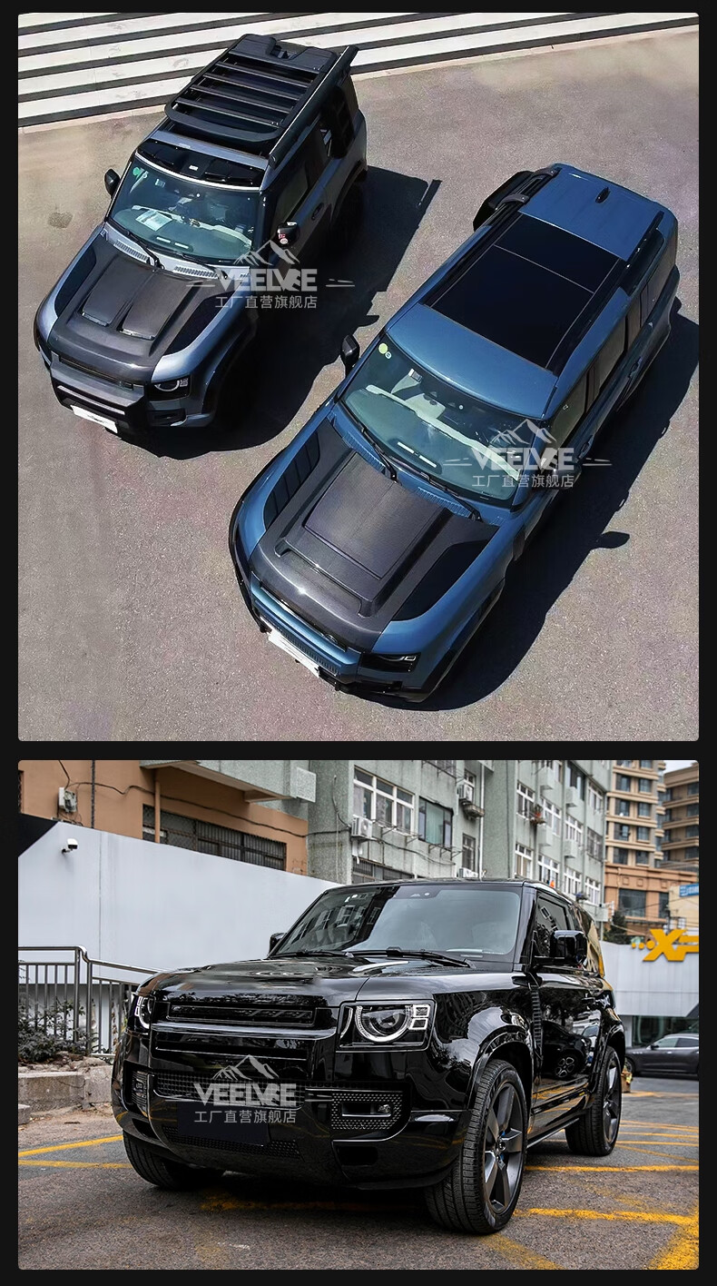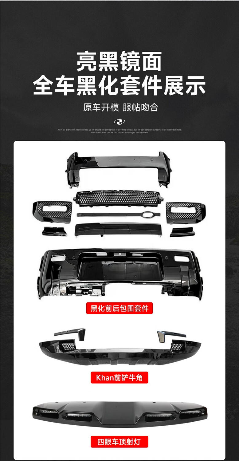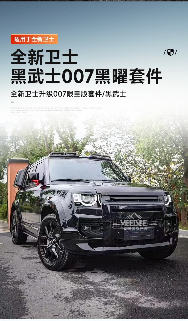 Yusenyi is suitable for Land Rover's new Defender Black Warrior Kit 007. The front and rear surrounds, rear wings and tail throats are blackened. Black Warrior hood air outlet/gloss black/replacement model