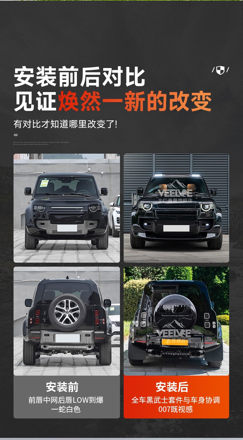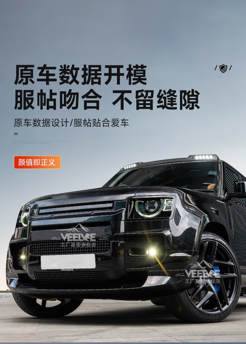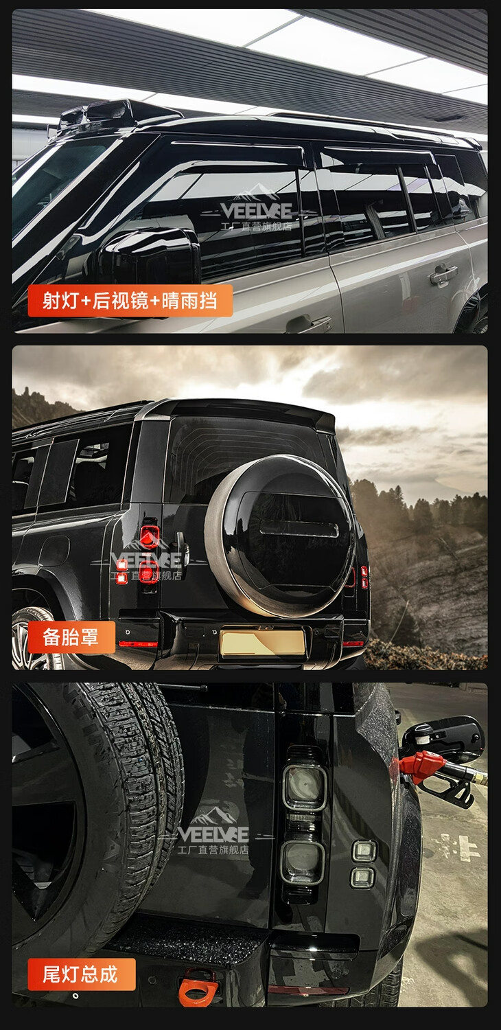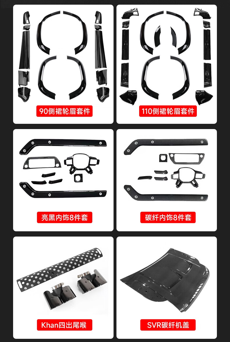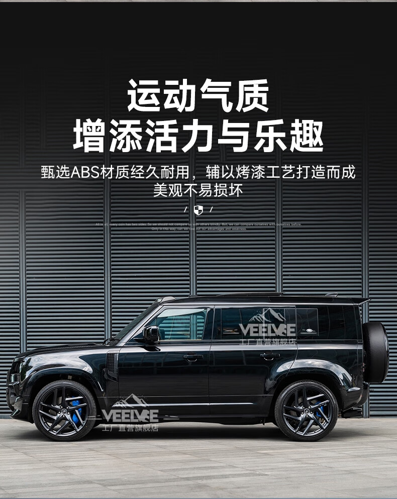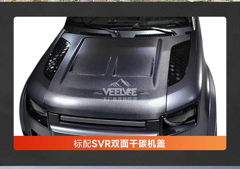 Yusenyi is suitable for Land Rover's new Defender Black Warrior Kit 007. The front and rear surrounds, rear wings and tail throats are blackened. Black Warrior hood air outlet/gloss black/replacement model