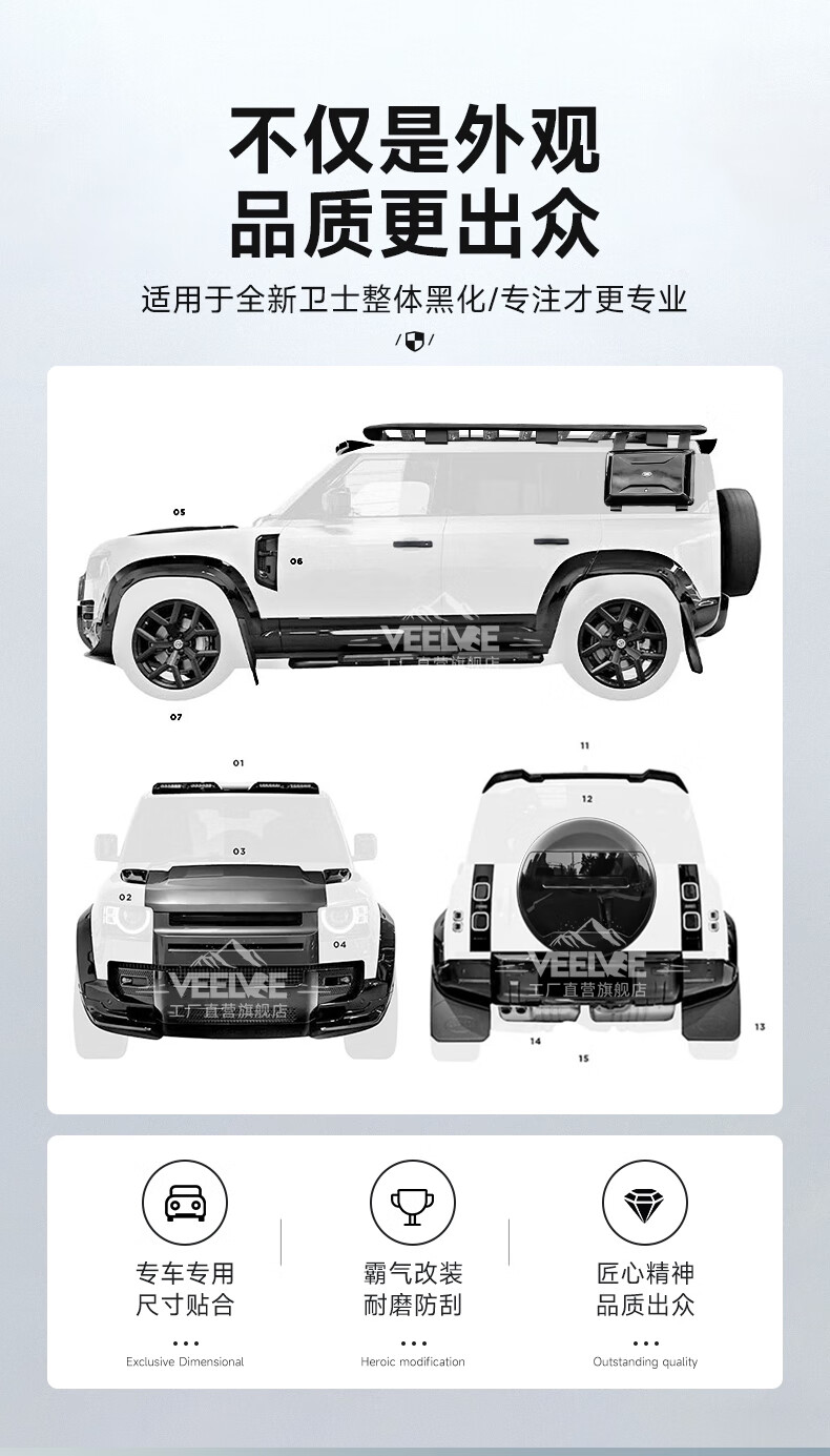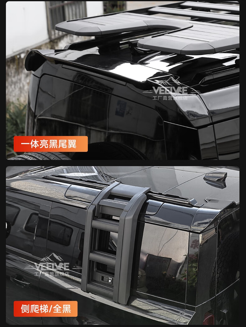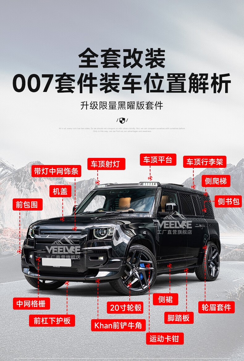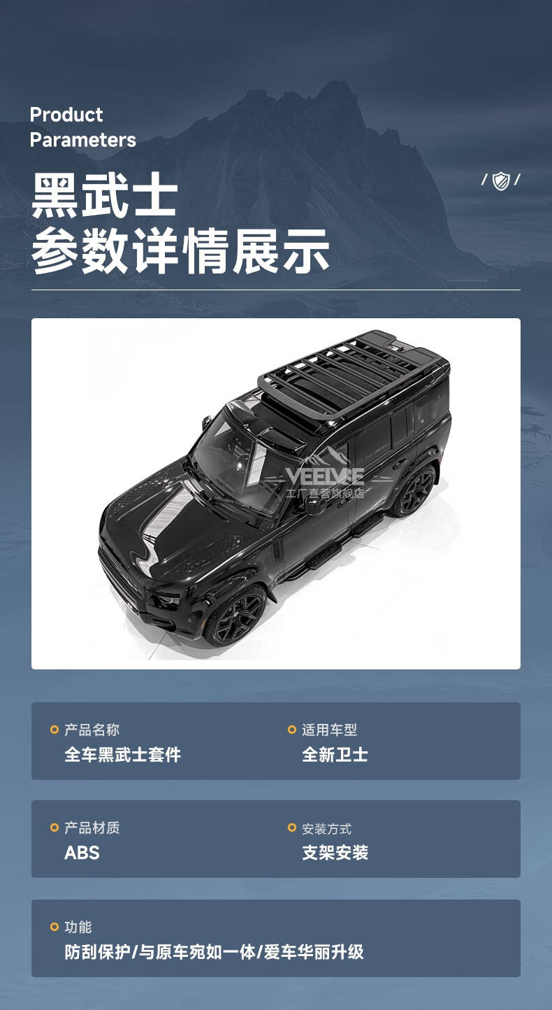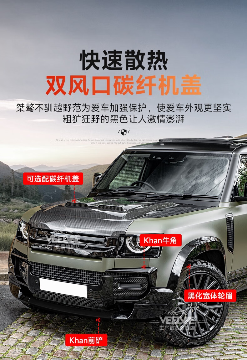 Yusenyi is suitable for Land Rover's new Defender Black Warrior Kit 007. The front and rear surrounds, rear wings and tail throats are blackened. Black Warrior hood air outlet/gloss black/replacement model