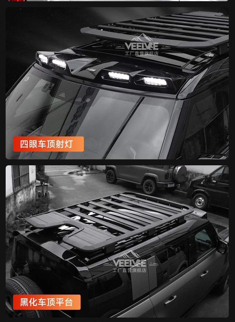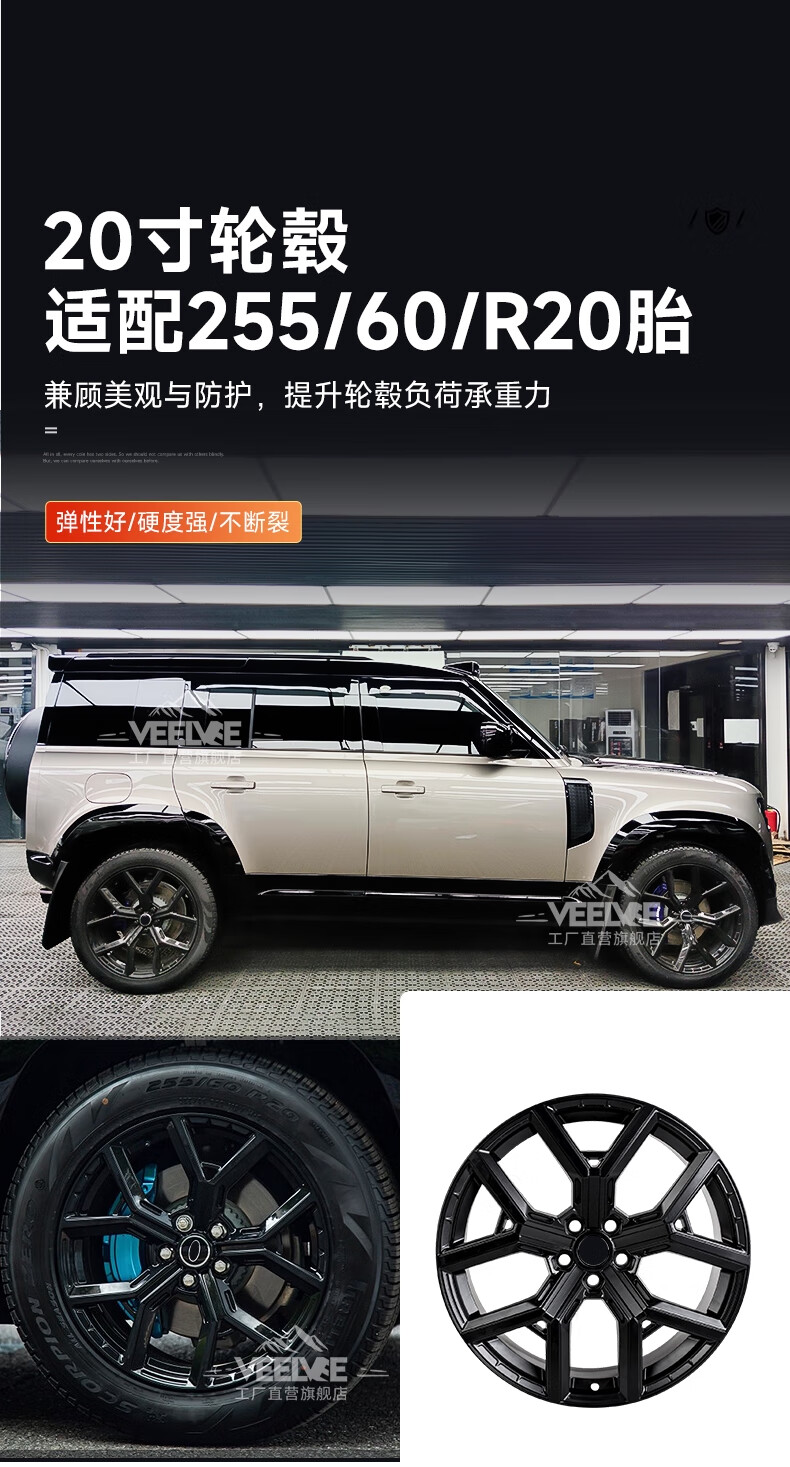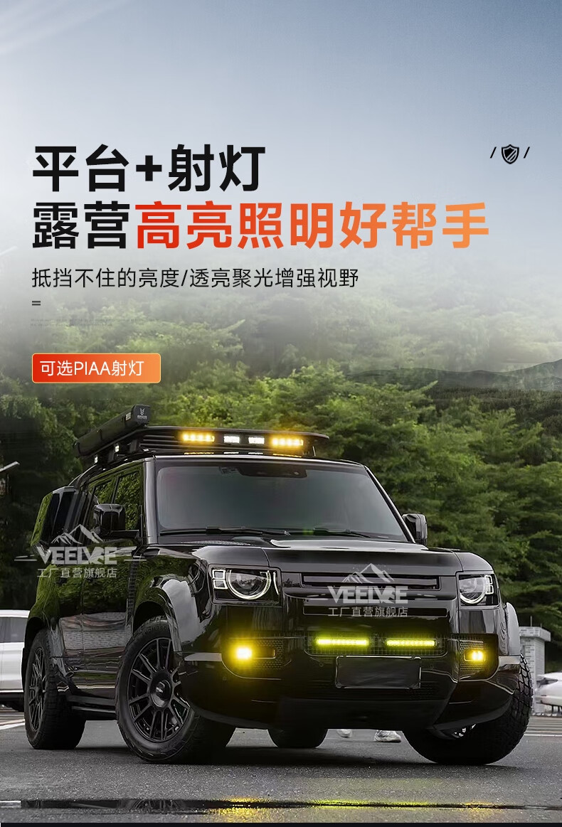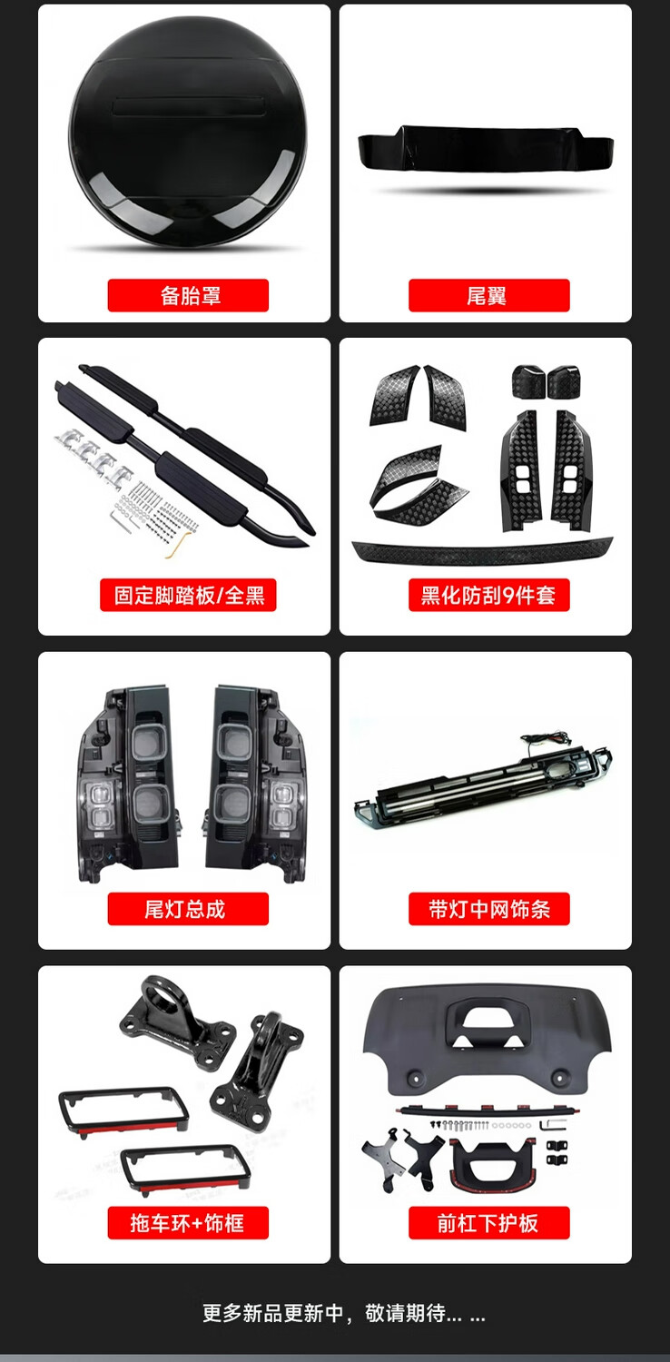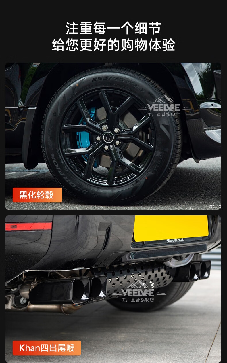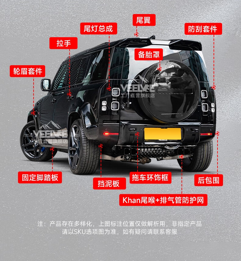 Yusenyi is suitable for Land Rover's new Defender Black Warrior Kit 007. The front and rear surrounds, rear wings and tail throats are blackened. Black Warrior hood air outlet/gloss black/replacement model