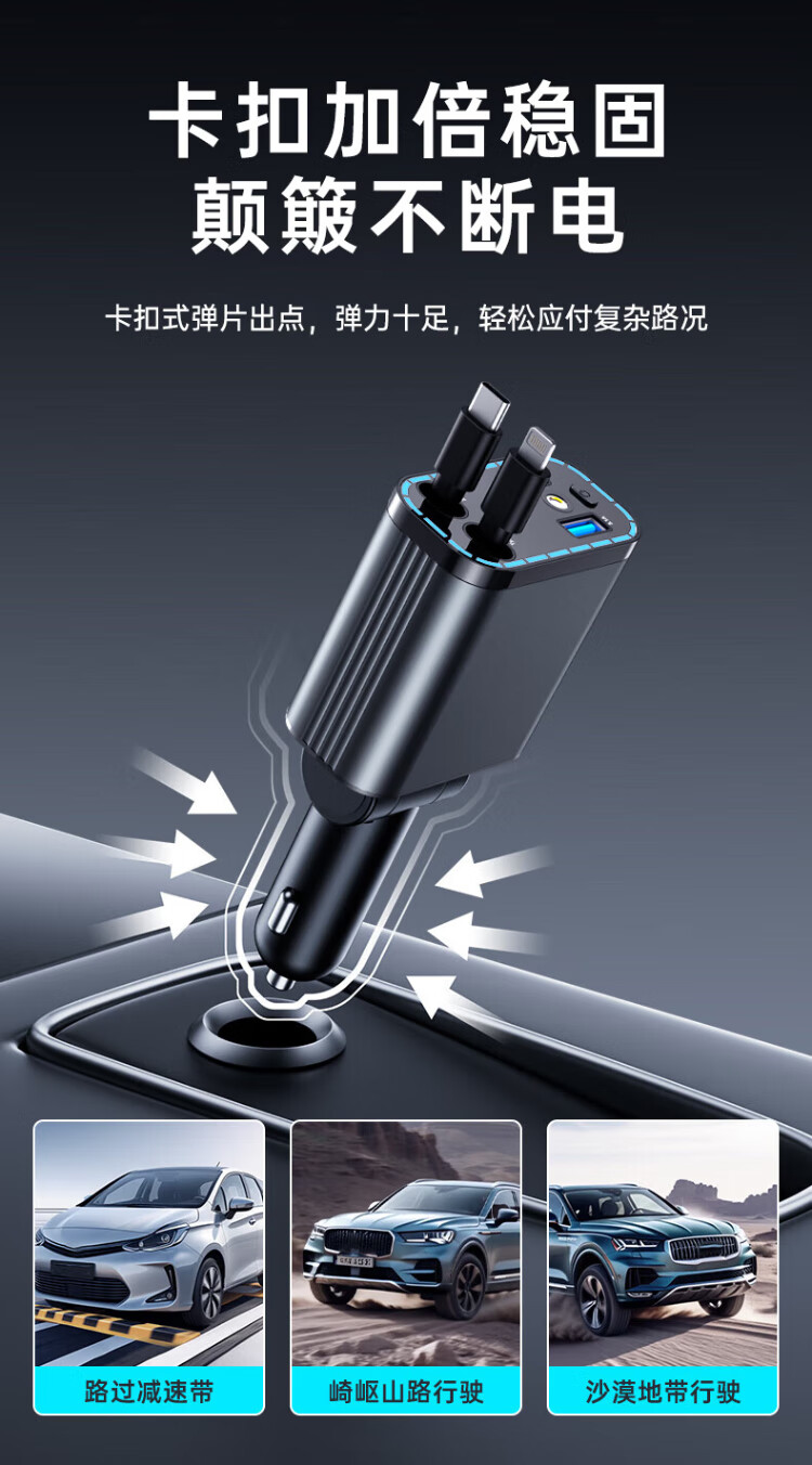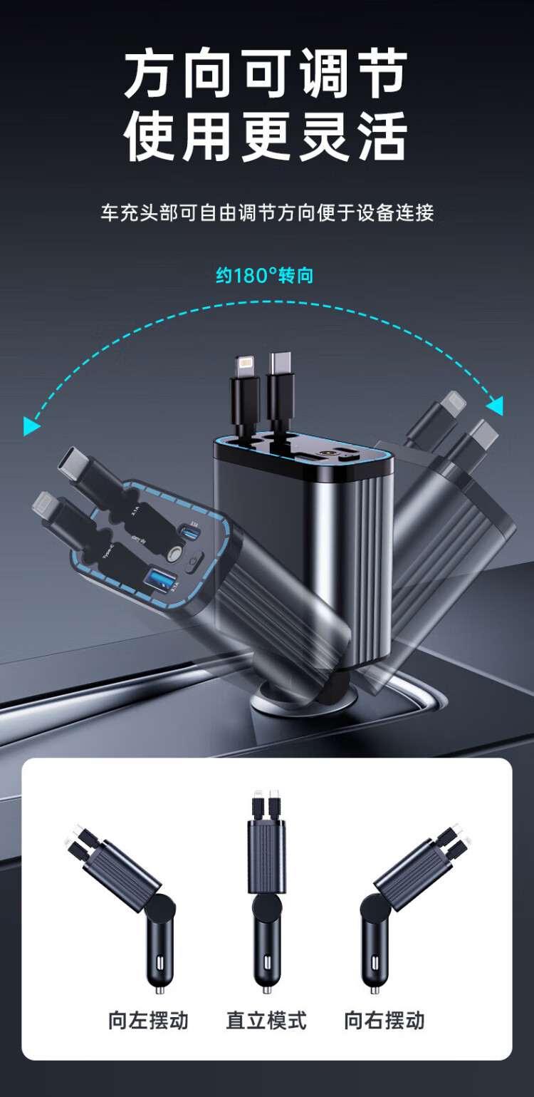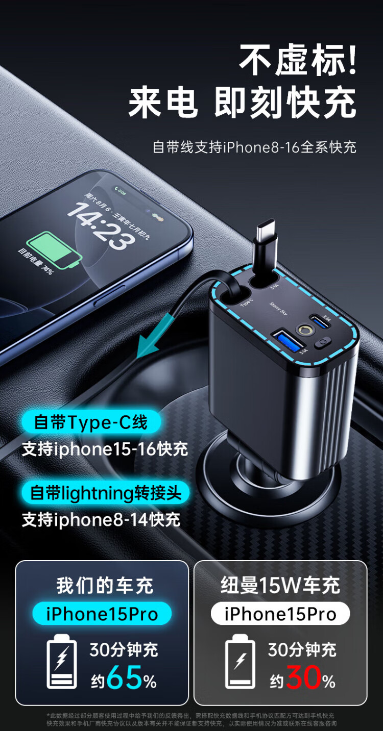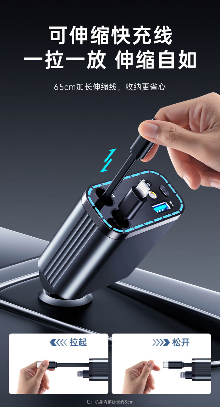 Newmine car charger super fast charging one to three retractable cable car charger cigarette lighter with cable multi-function converter suitable for Huawei Apple 16 Android