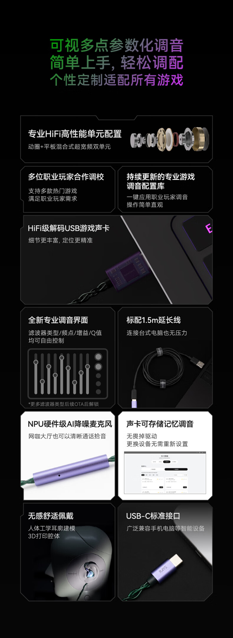 Shuiyueyu Beam RAYS In-ear Game Wired Headphones TypeC Professional E-Sports Game Sound Card Mobile Game Listening and Positioning AI Noise Reduction Microphone Universal for Mobile Phones and Computers Beam RAYS