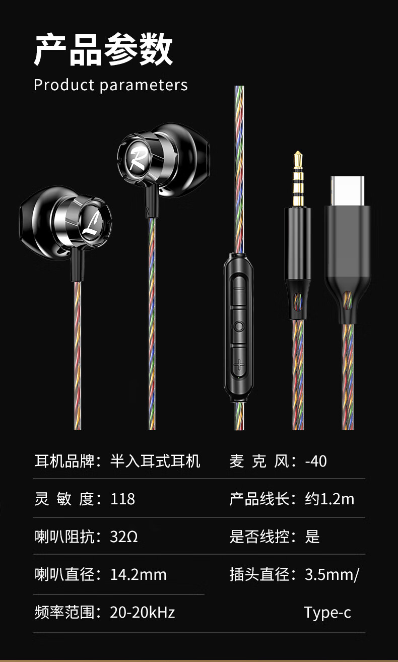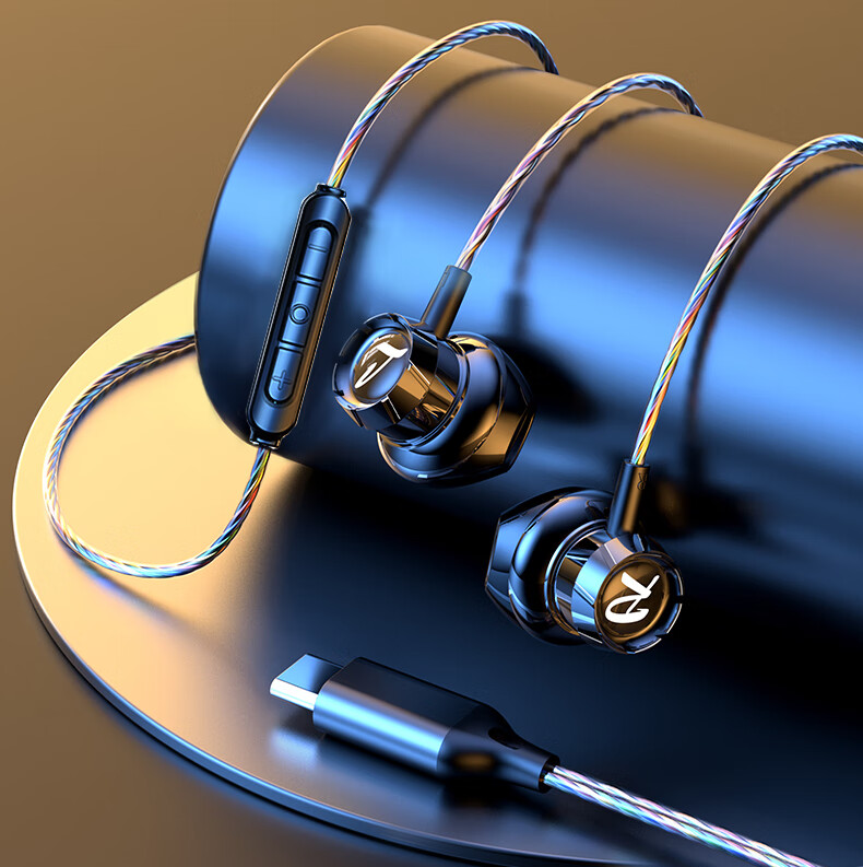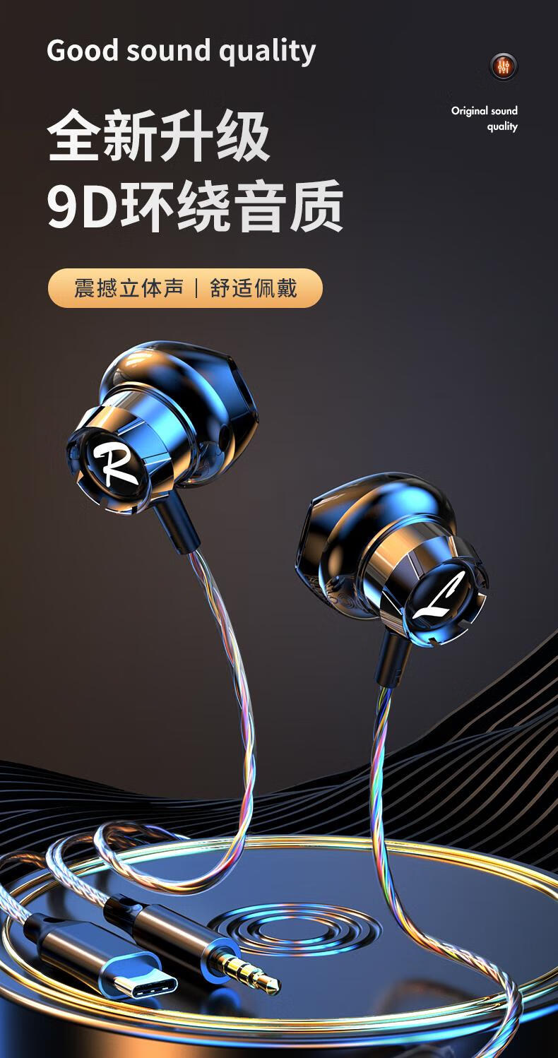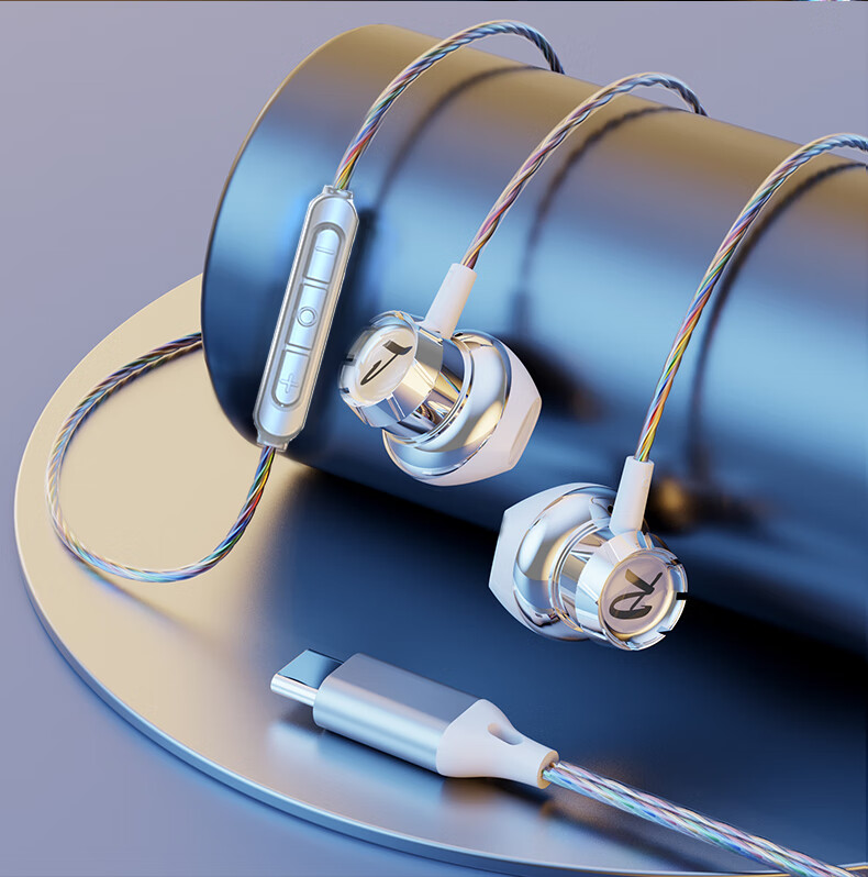 Metal wired semi-in-ear headphones digital type-c flat head high quality heavy bass shocking convenient wire control with microphone clear voice universal mobile phone earplugs white 3.5mm round head