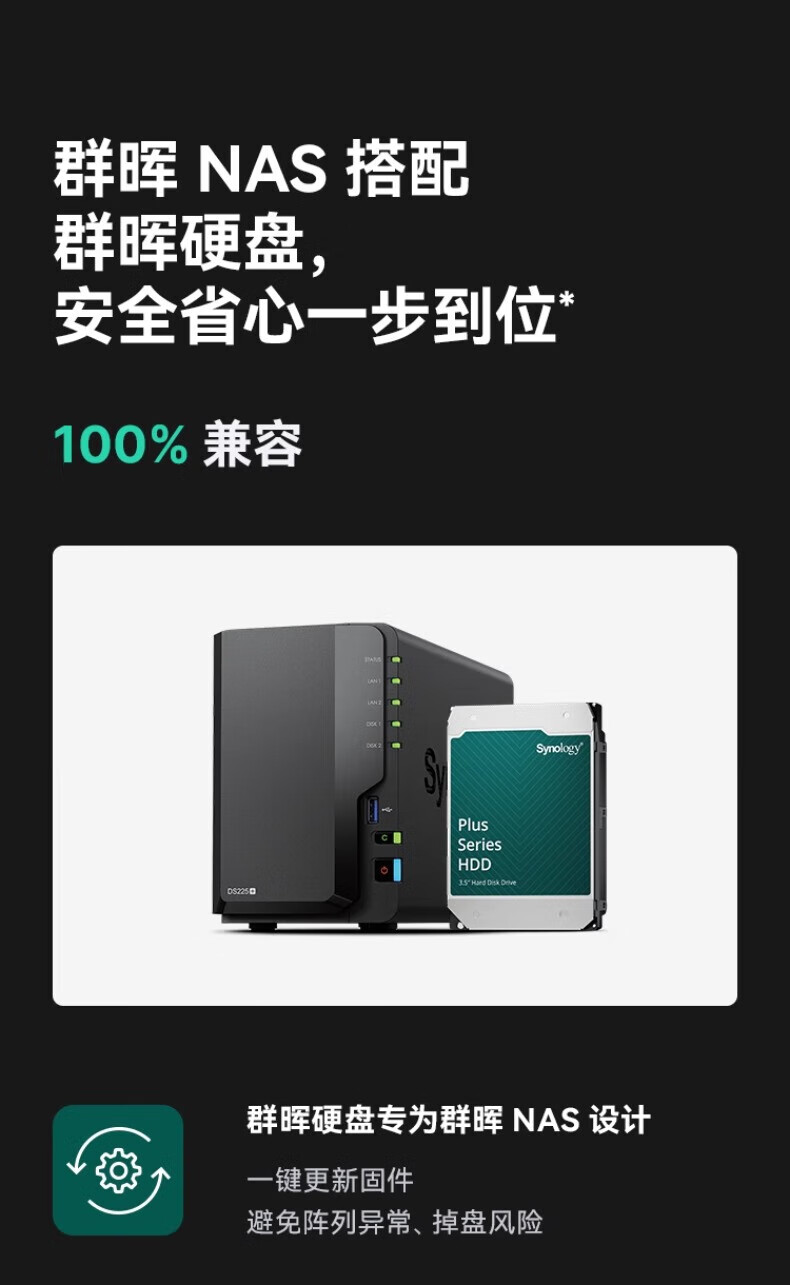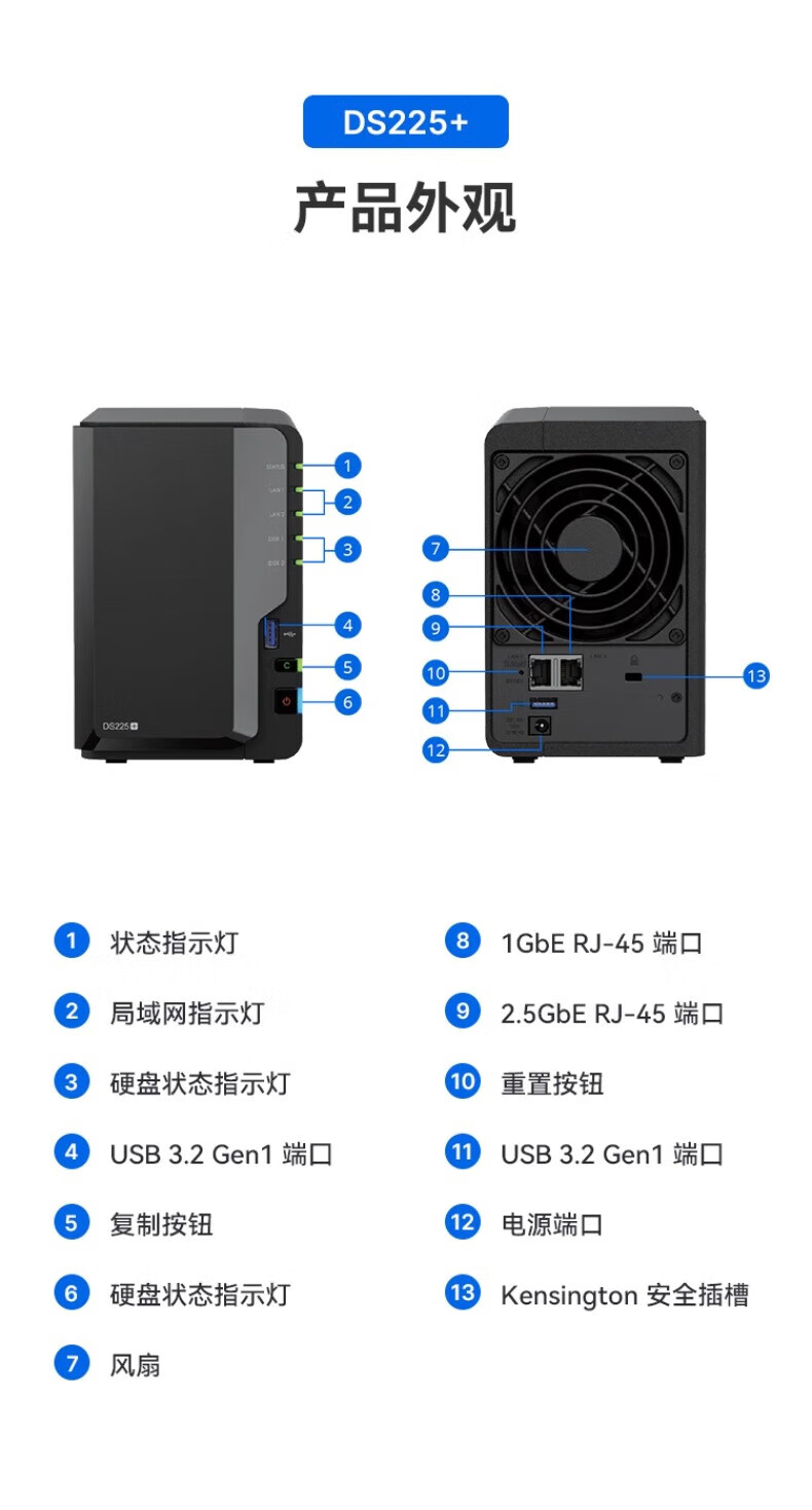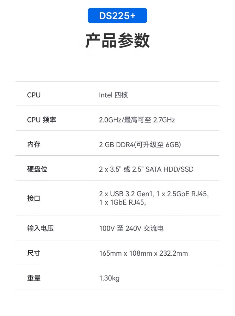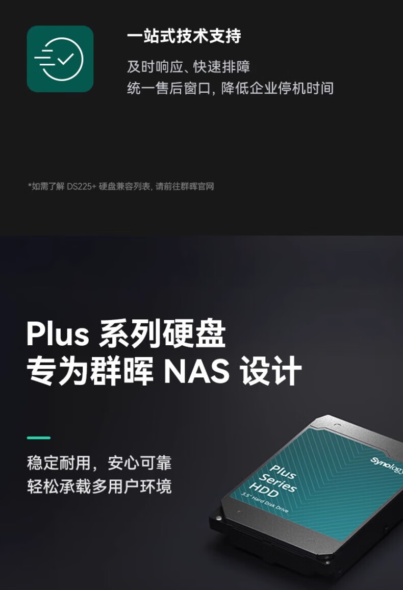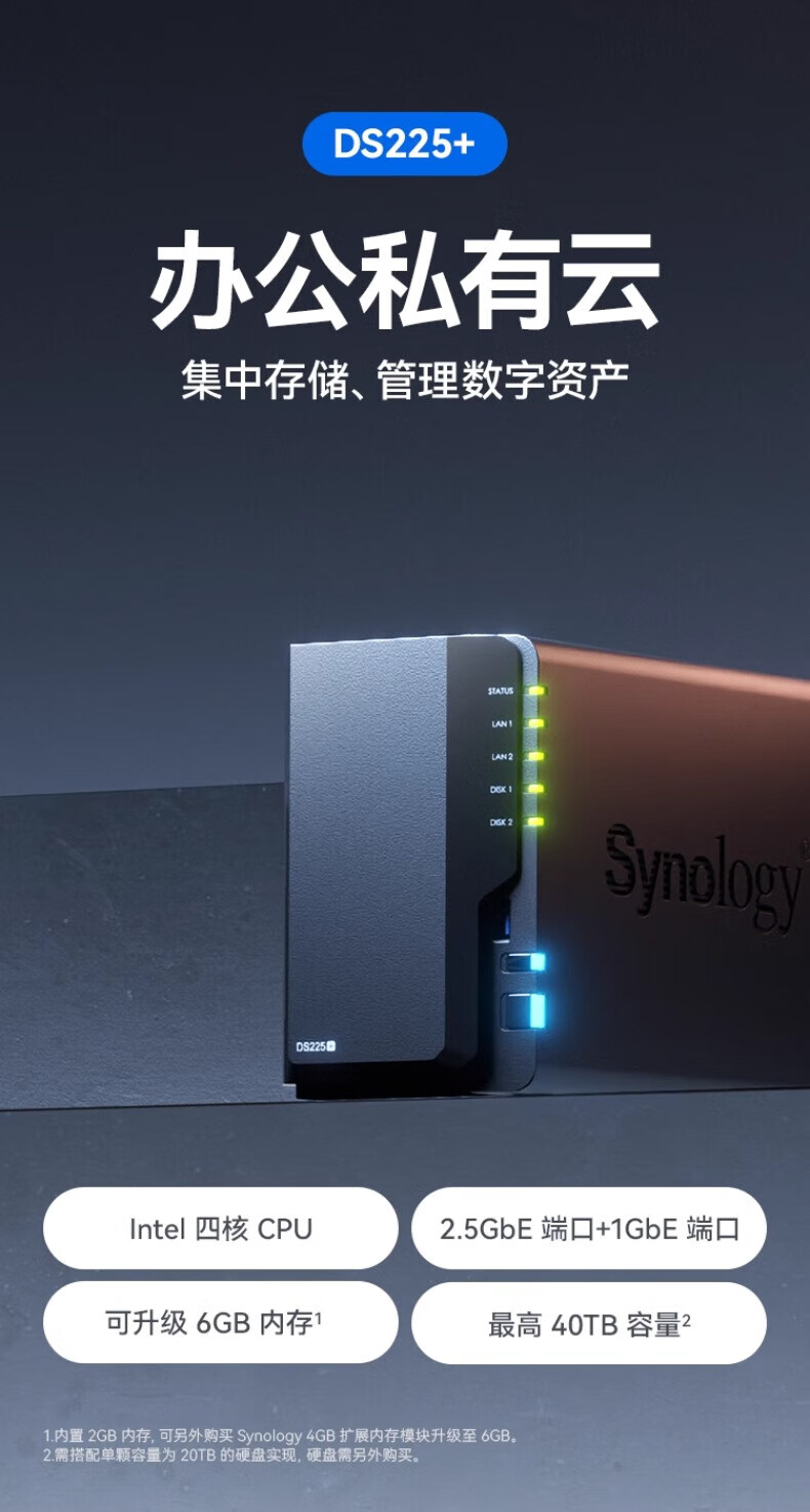 Synology DS225+ quad-core Intel CPU 2-bay NAS network storage server enterprise LAN team office private cloud file sharing data backup DS225+ upgrade 6GB (2GB+4GB original memory) with Synology original hard drive 4T 1 piece 4TB package