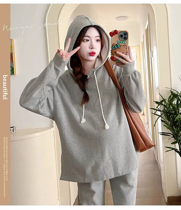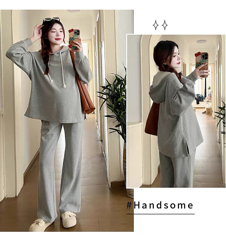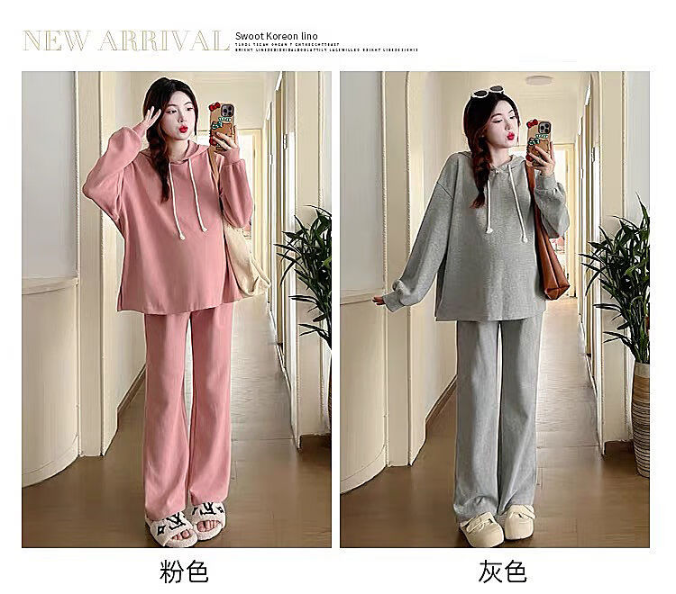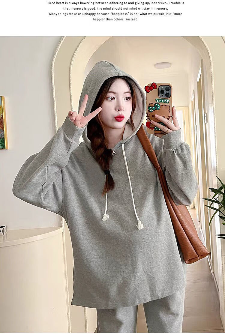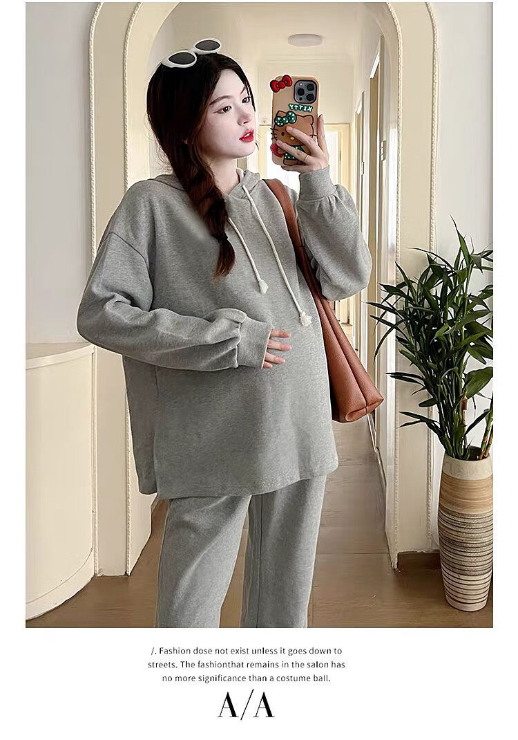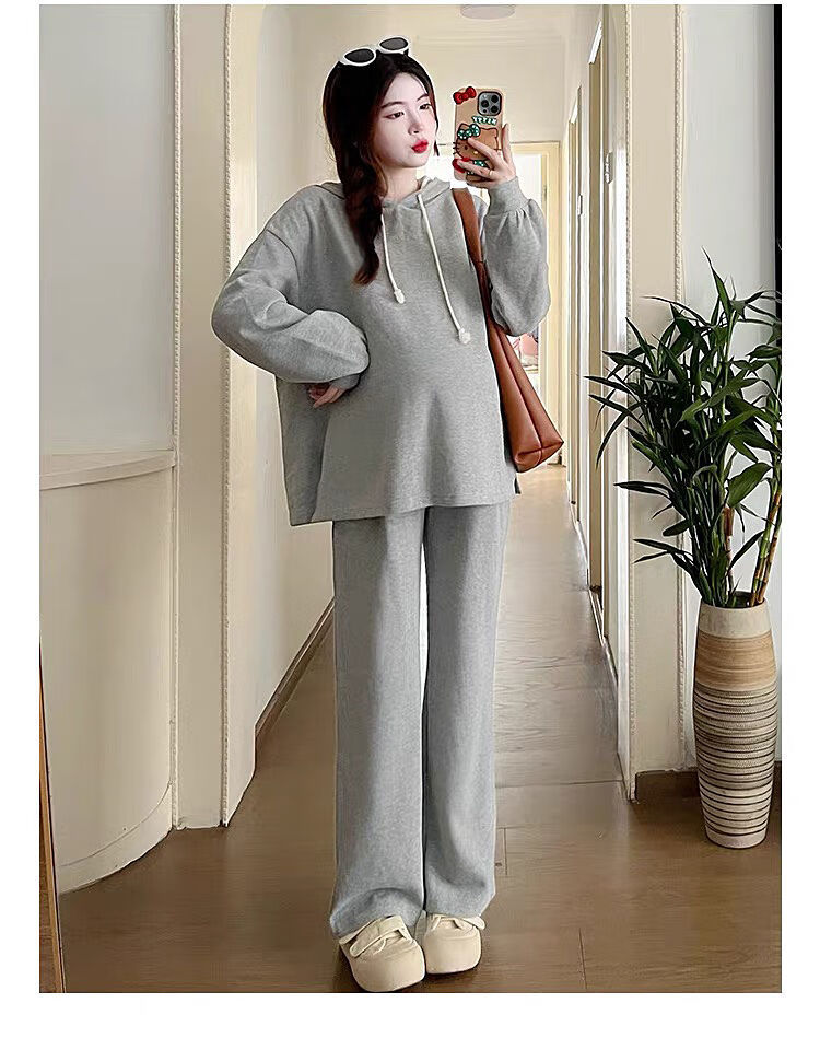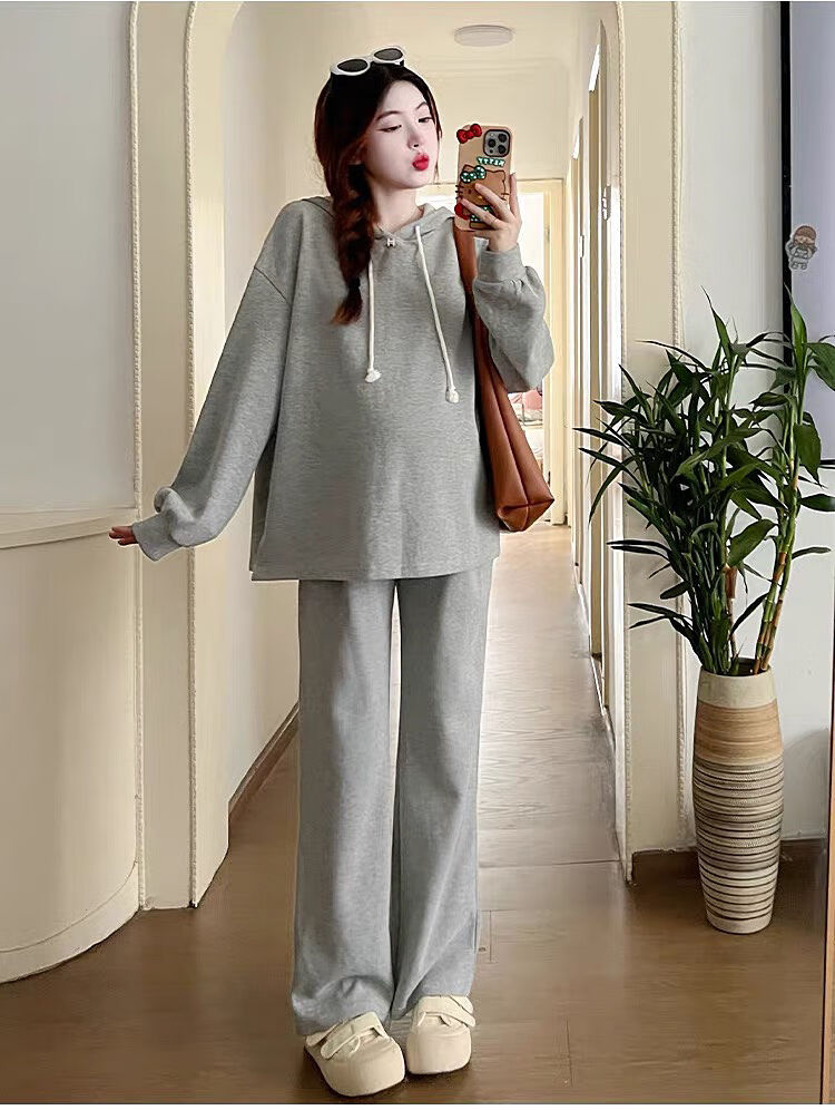 Autumn suit for pregnant women, Korean style loose long-sleeved hooded sweatshirt, fashionable and foreign-style outer wear tummy-supporting pants, hot mom complete set, gray suit XL 120-140Jin Jin equals 0.5 kg
