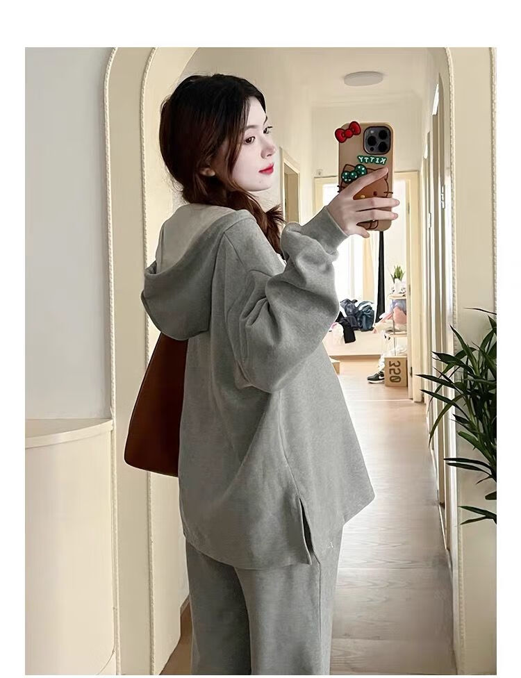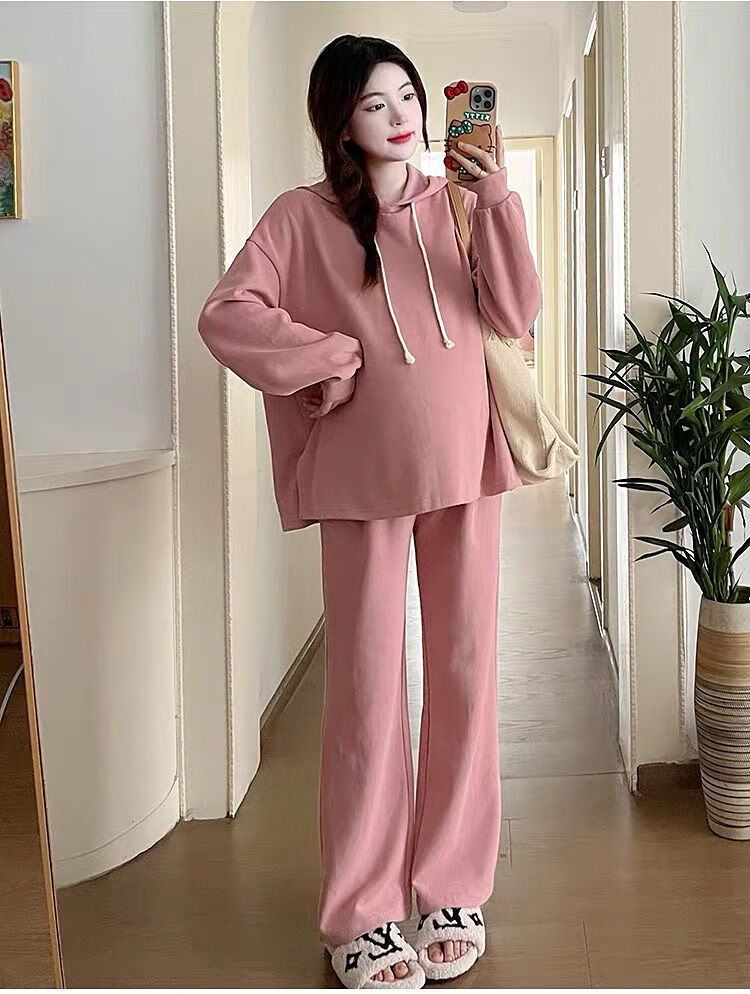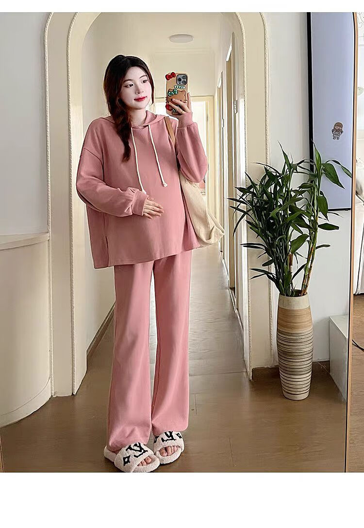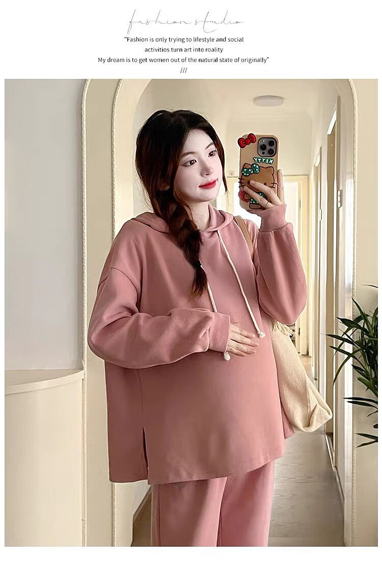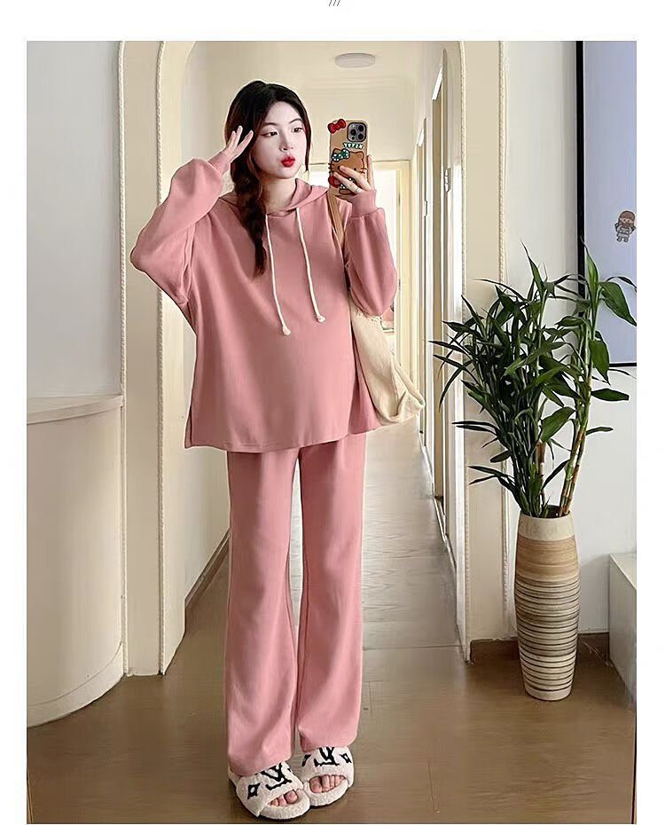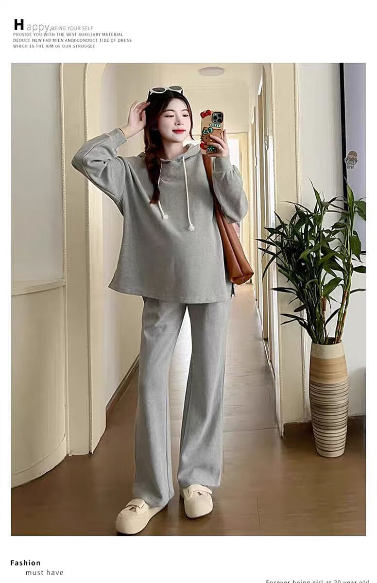 Autumn suit for pregnant women, Korean style loose long-sleeved hooded sweatshirt, fashionable and foreign-style outer wear tummy-supporting pants, hot mom complete set, gray suit XL 120-140Jin Jin equals 0.5 kg