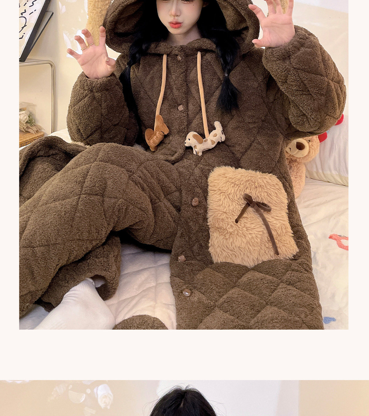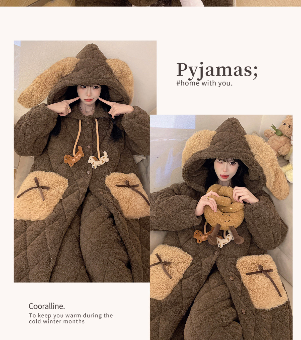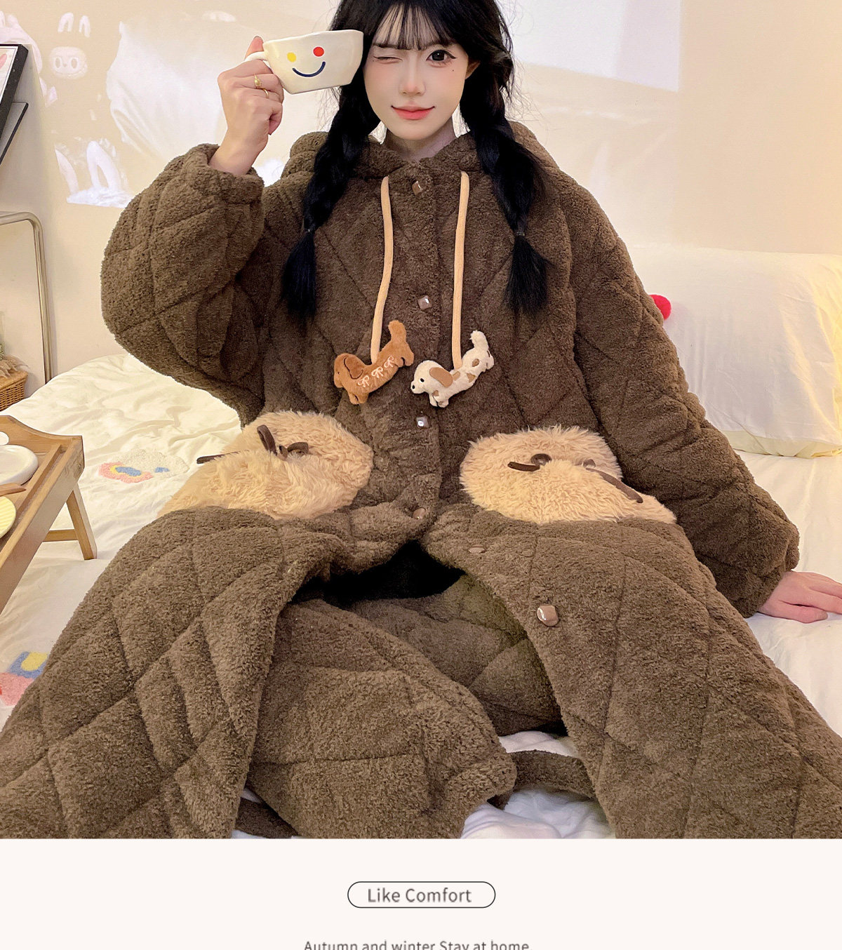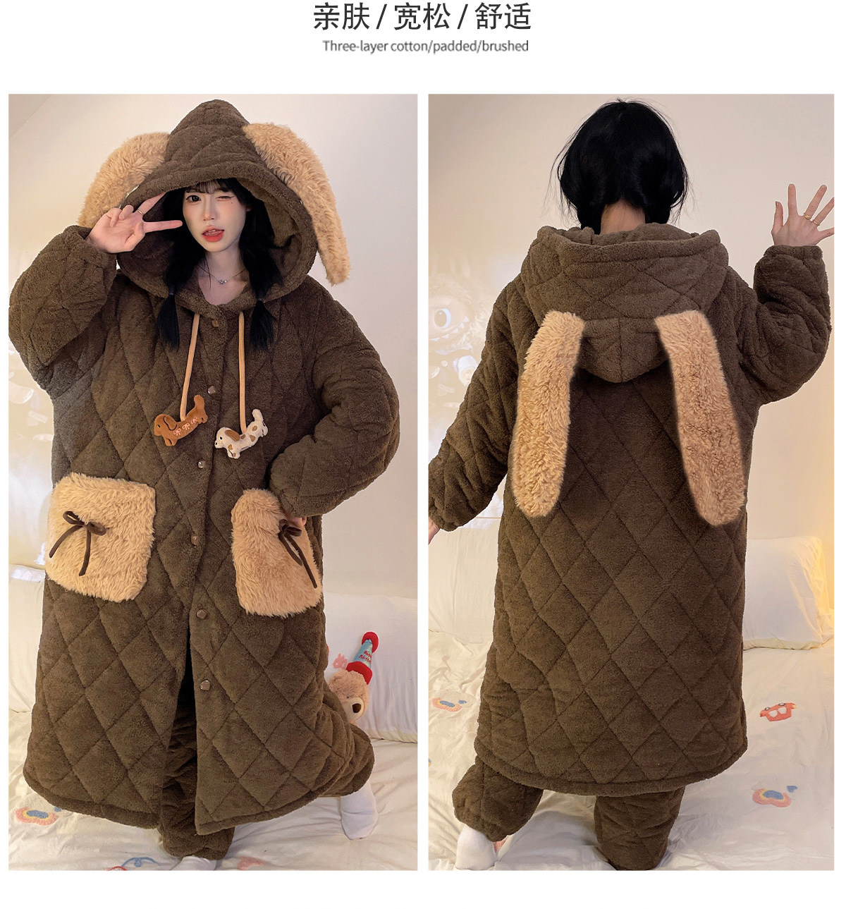 Autumn and Winter Three-Layer Quilted Cute Puppy Nightgown for Women, Half-Velvet Pajamas, Fleece-Lined and Thickened Set, Loungewear