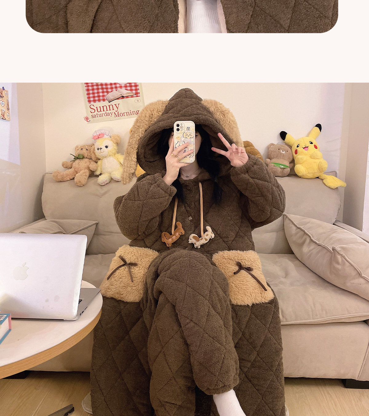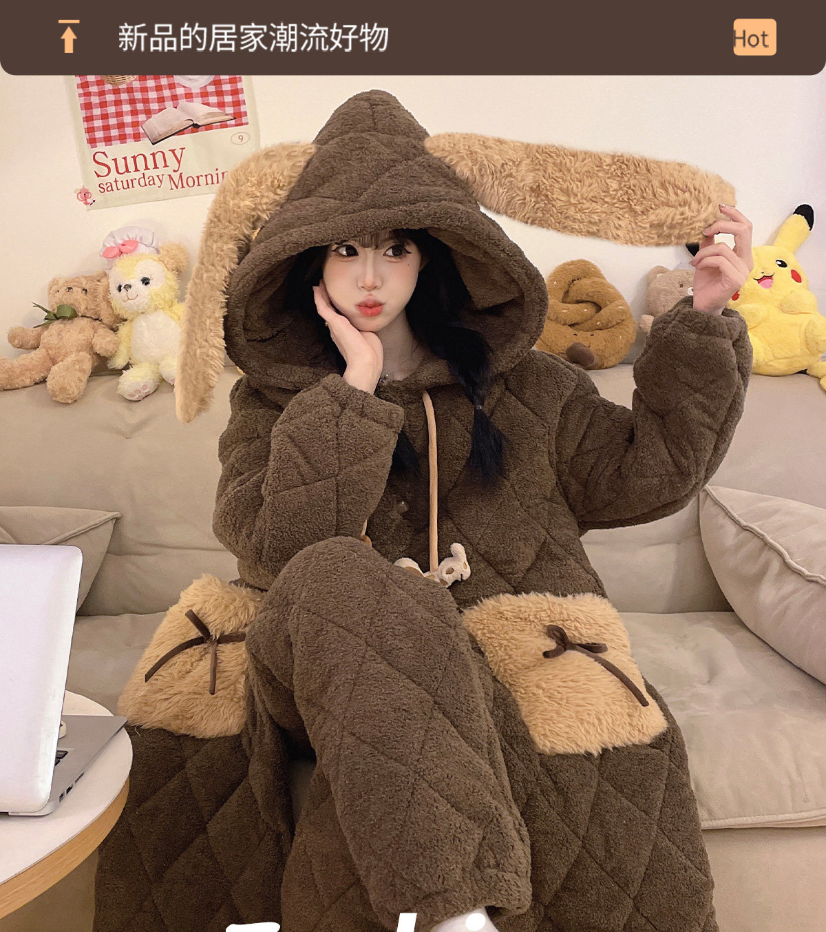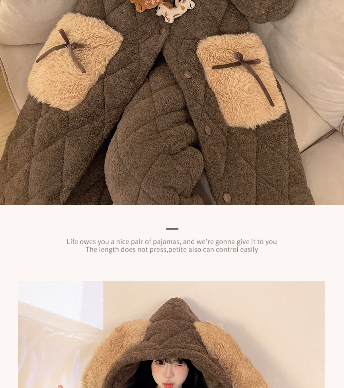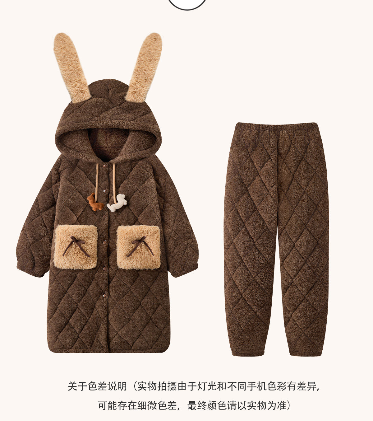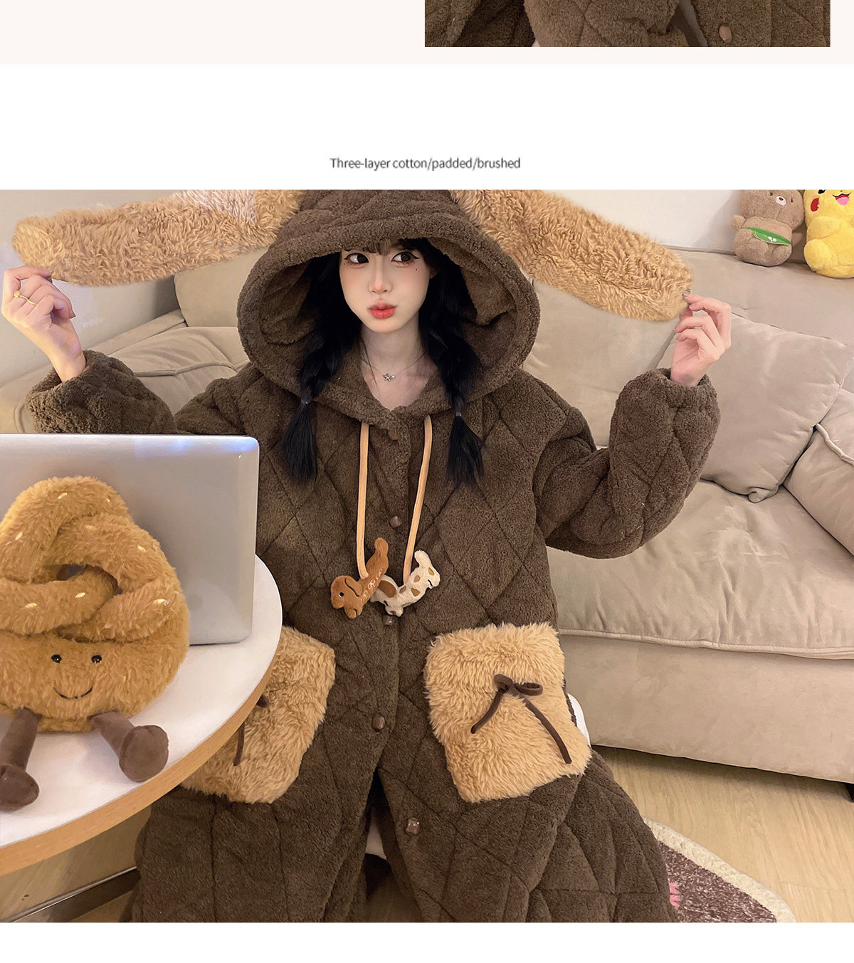 Autumn and Winter Three-Layer Quilted Cute Puppy Nightgown for Women, Half-Velvet Pajamas, Fleece-Lined and Thickened Set, Loungewear