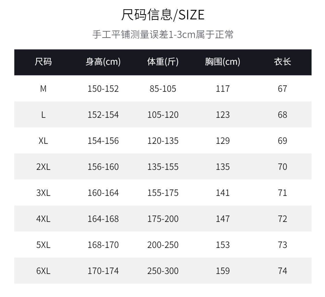 Size M 95-120Jin Jin is equal to 0.5 kg,L 120-140Jin Jin equals 0.5 kg,XL 140-160Jin Jin equals 0.5 kg,2XL 160-180Jin Jin equals 0.5 kg,3XL 180-200Jin Jin equals 0.5 kg