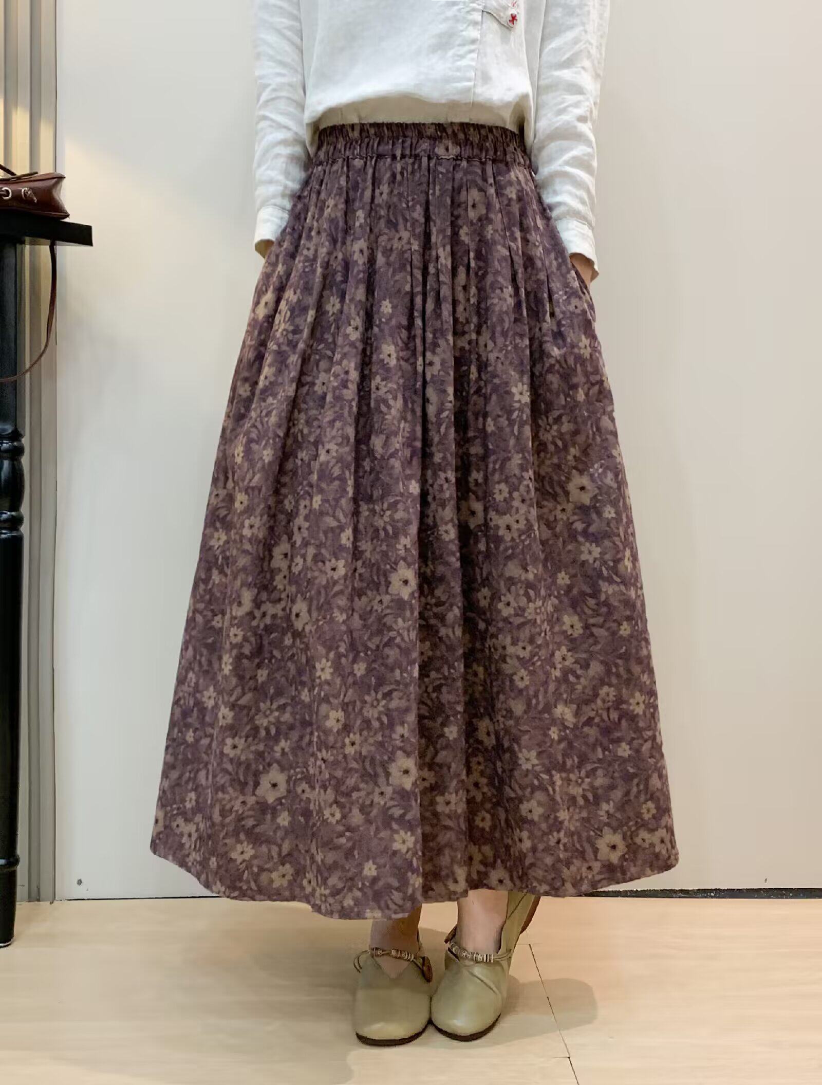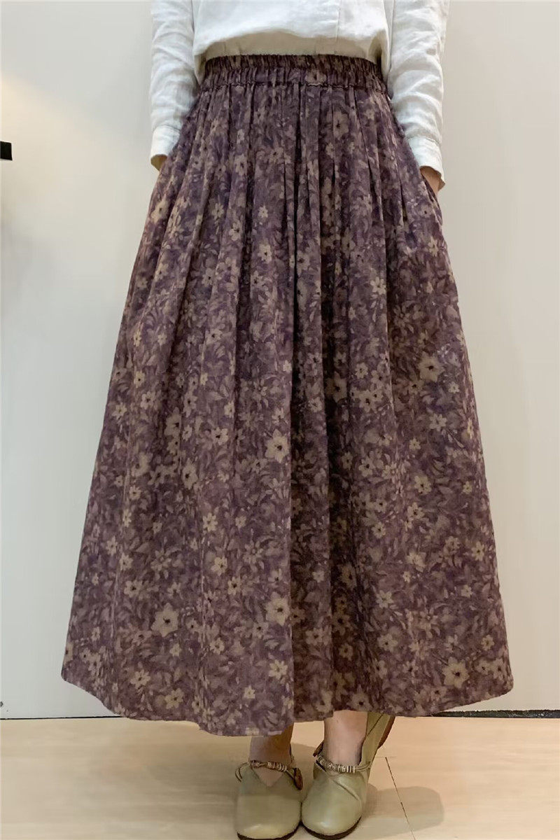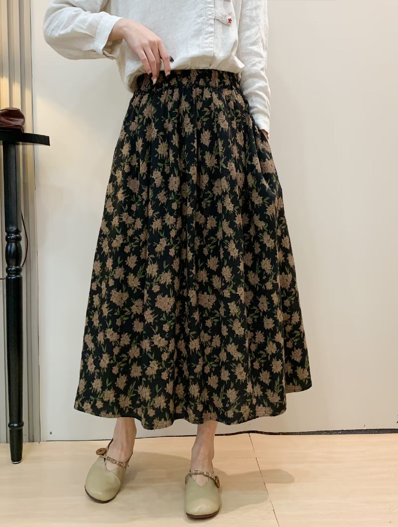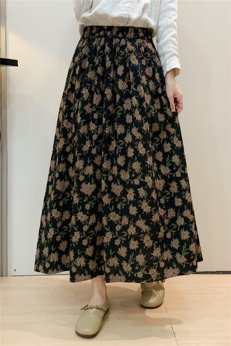 Vintage Floral Half-Skirt for Women, Spring 2026, Elastic Waist, Pockets, Versatile, Slimming A-Line Long Skirt