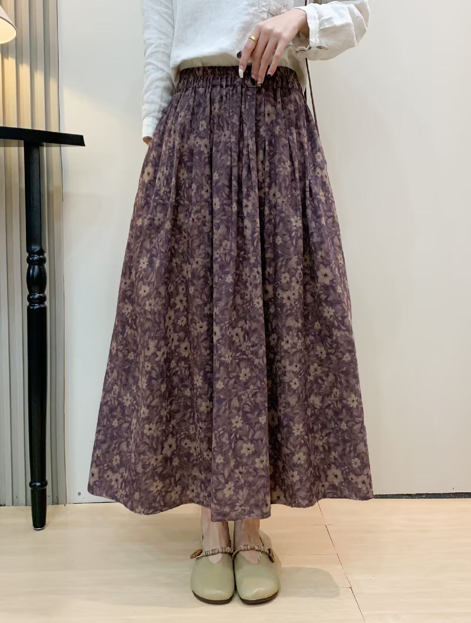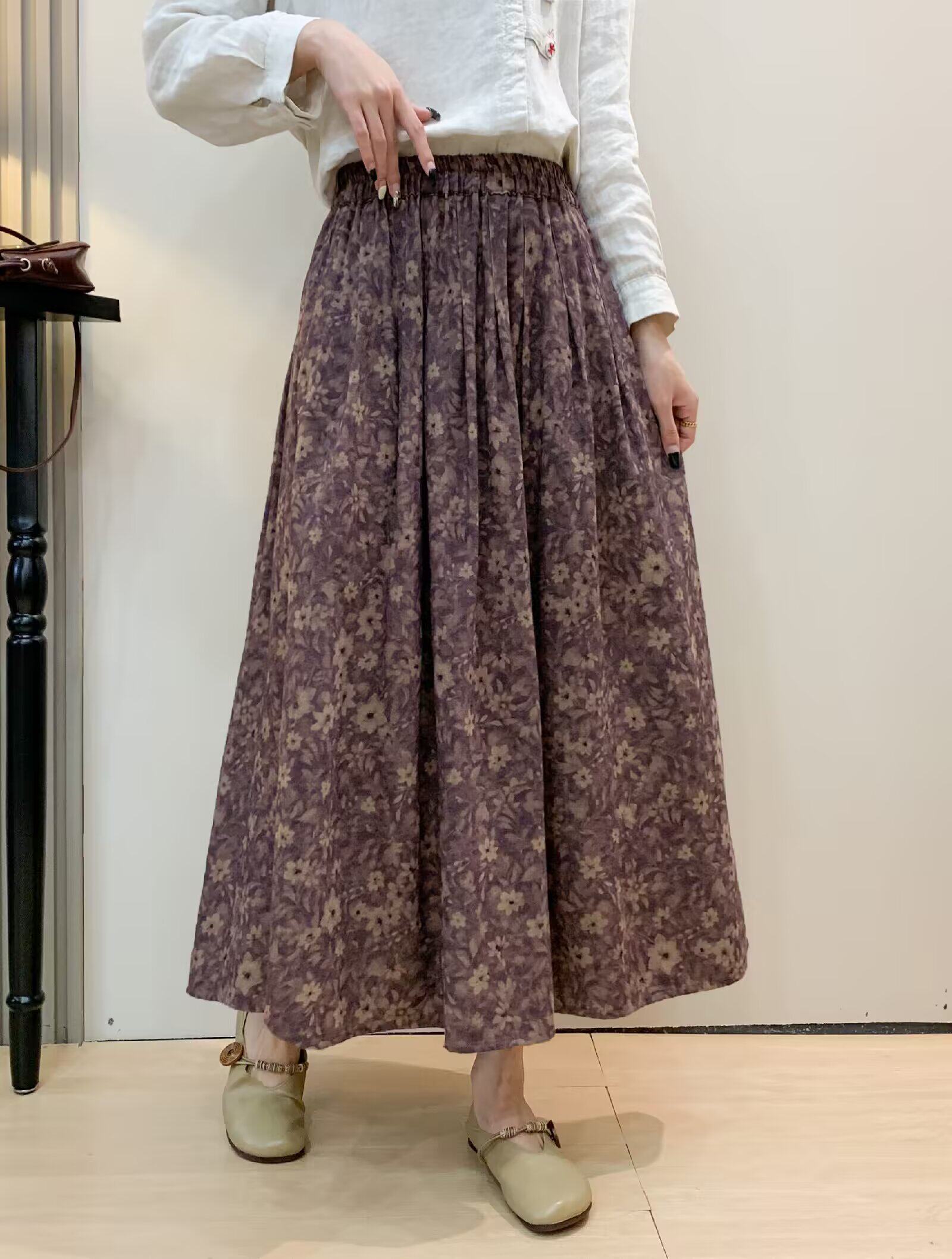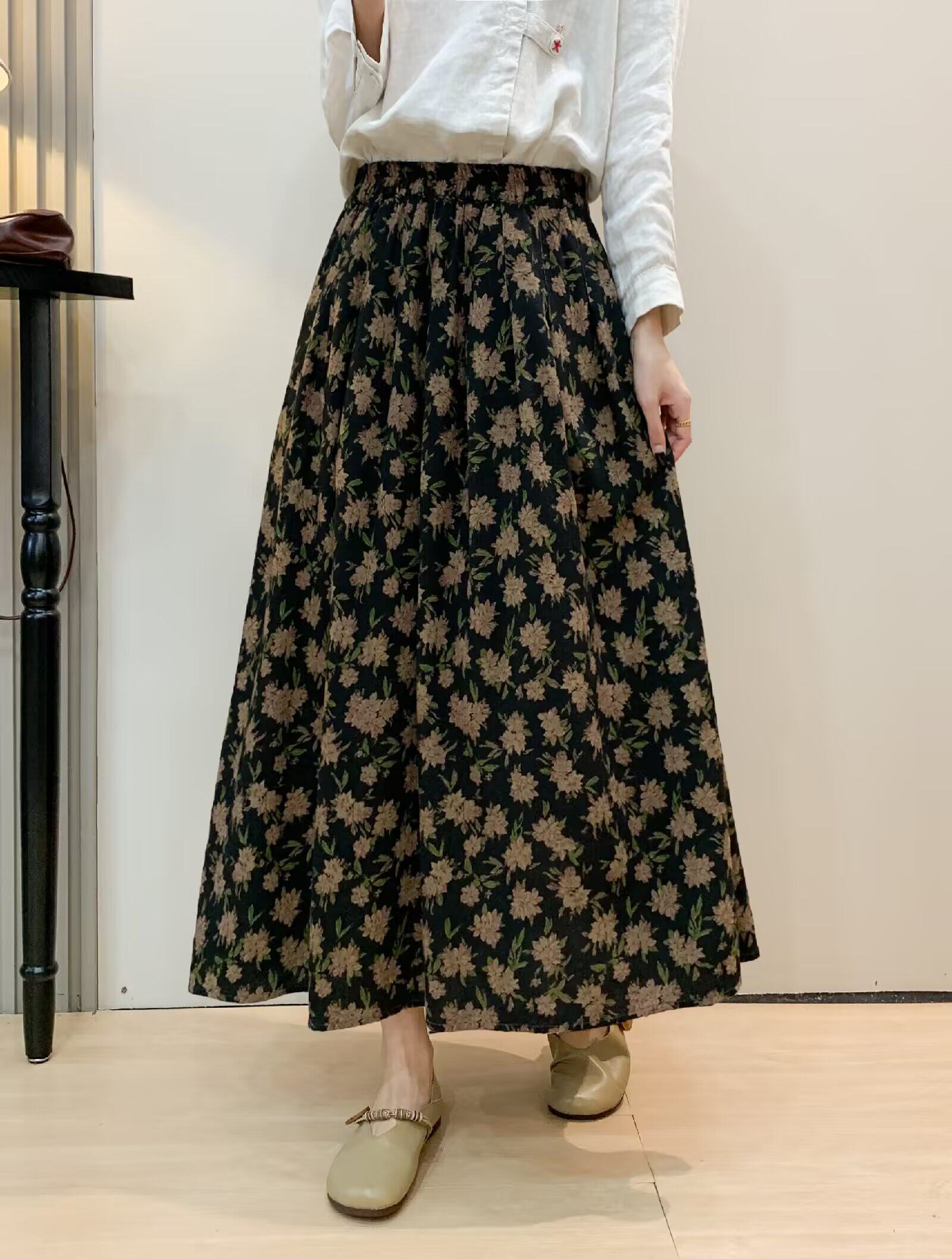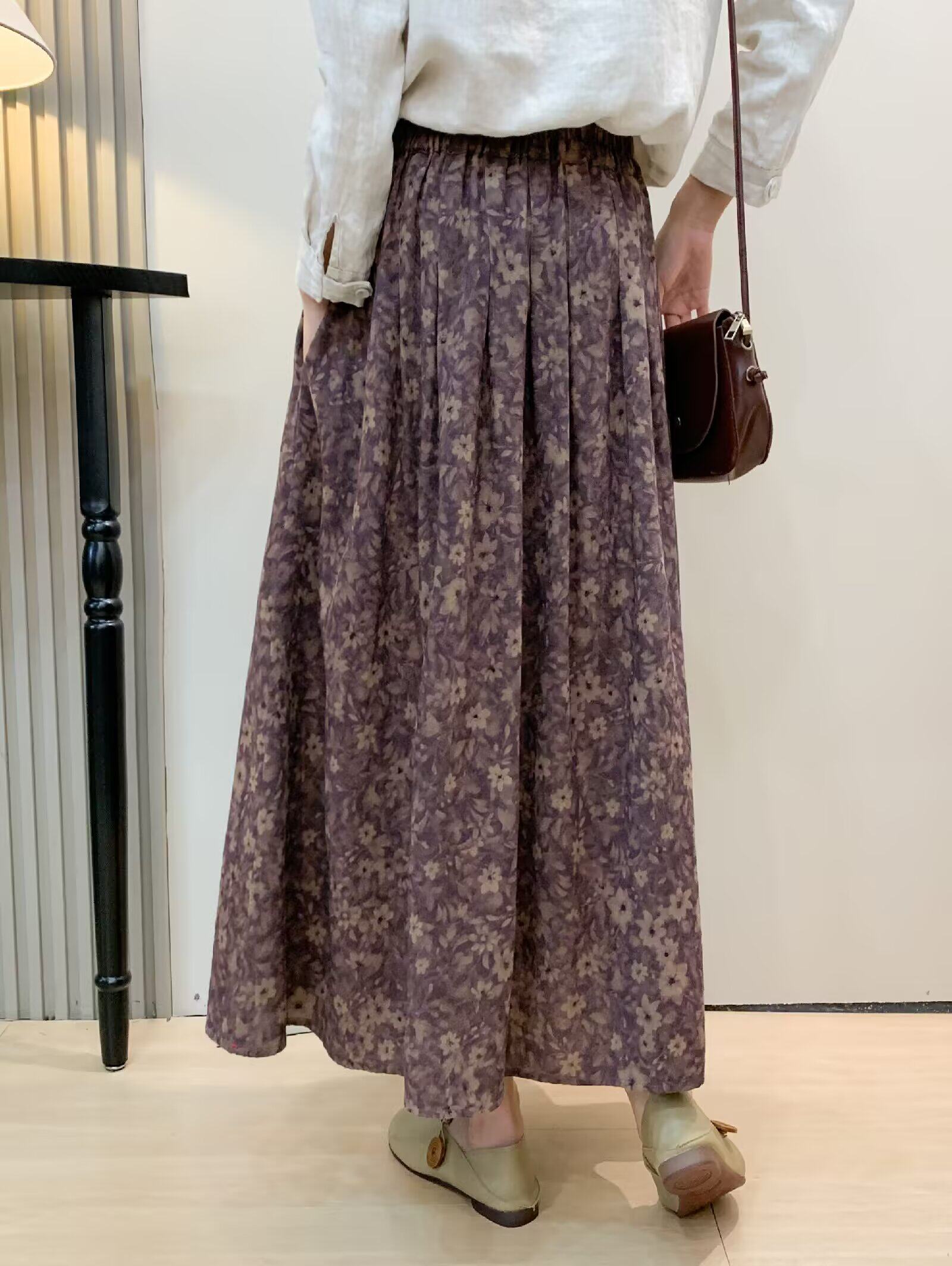 Vintage Floral Half-Skirt for Women, Spring 2026, Elastic Waist, Pockets, Versatile, Slimming A-Line Long Skirt