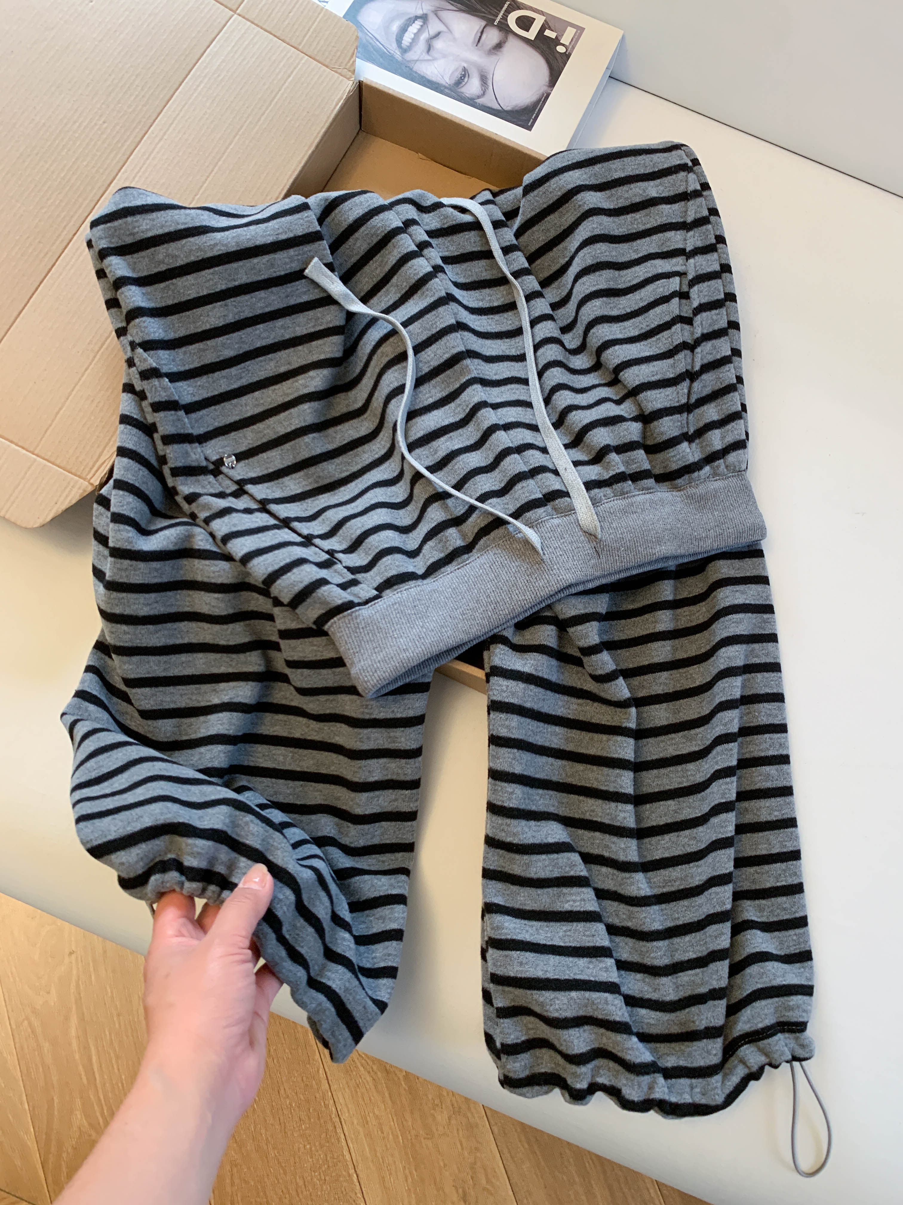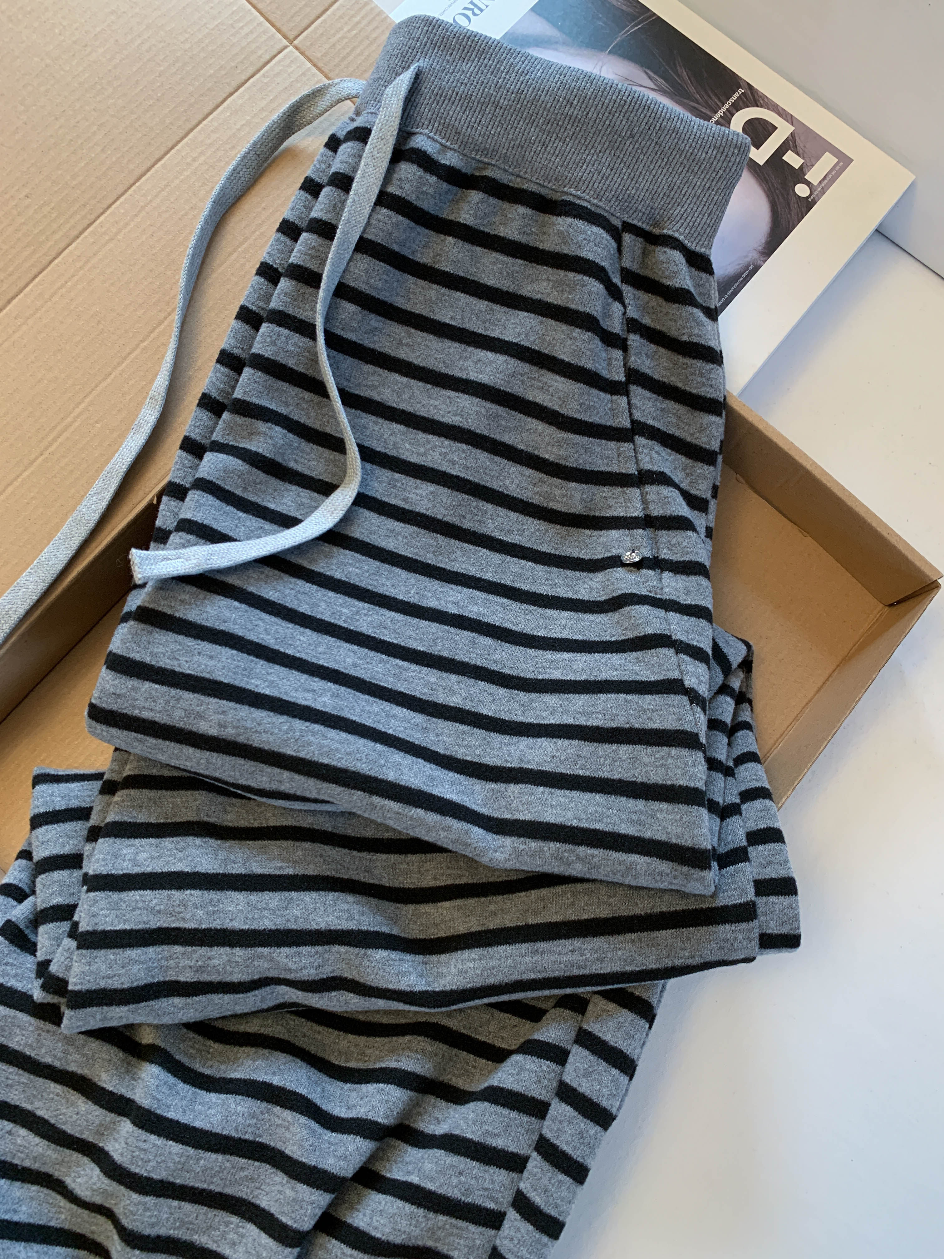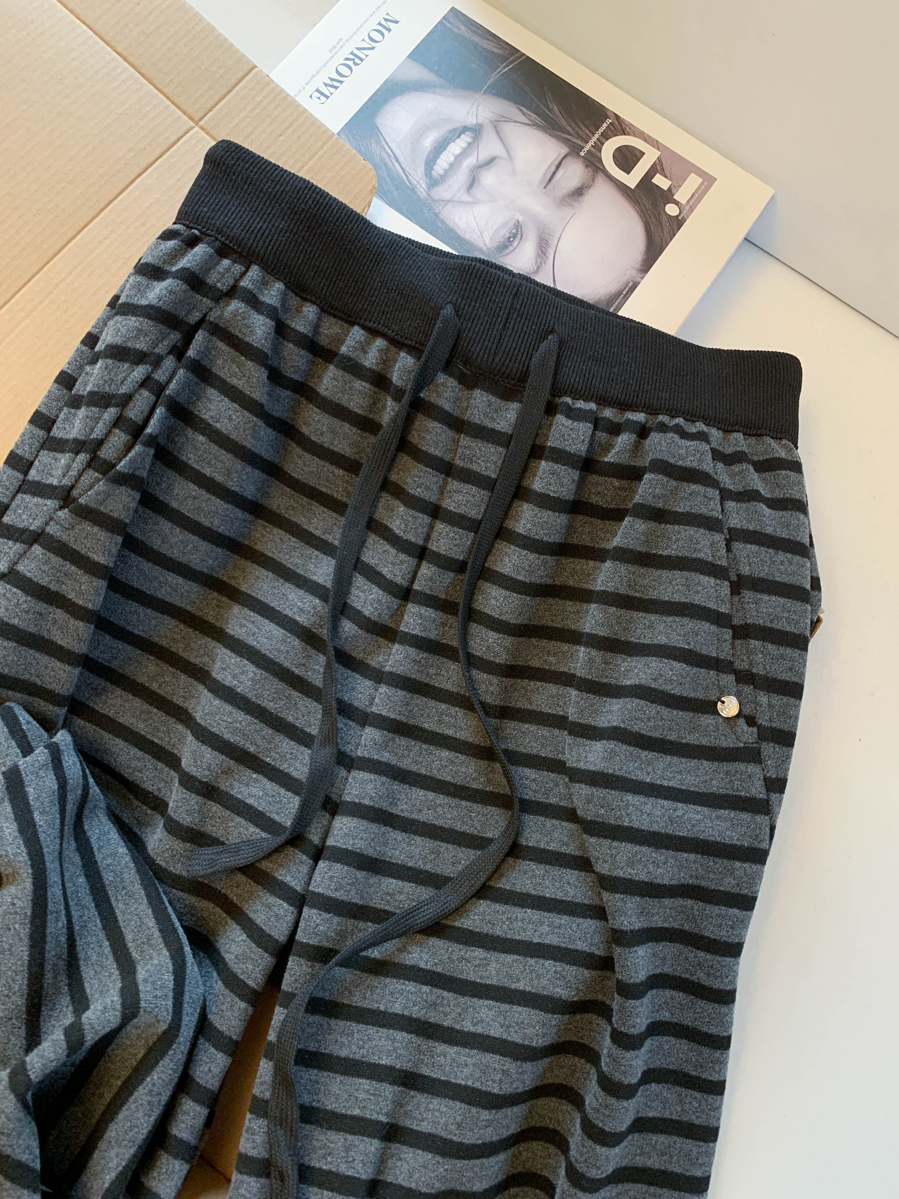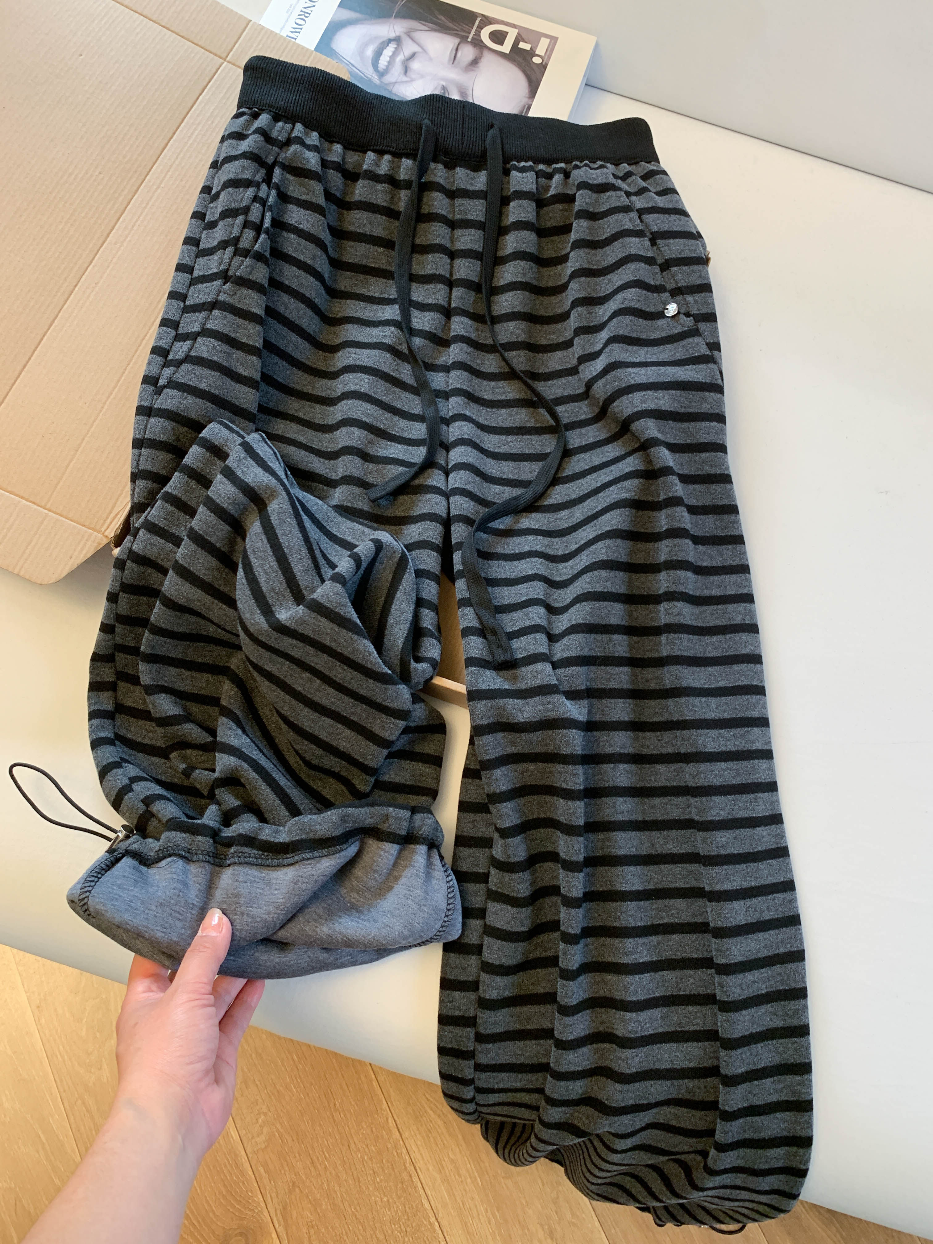 Lazy style plus velvet striped scimitar pants for women in winter, soft and waxy casual wide-leg pants for small people, two-wear sports pants with ankles