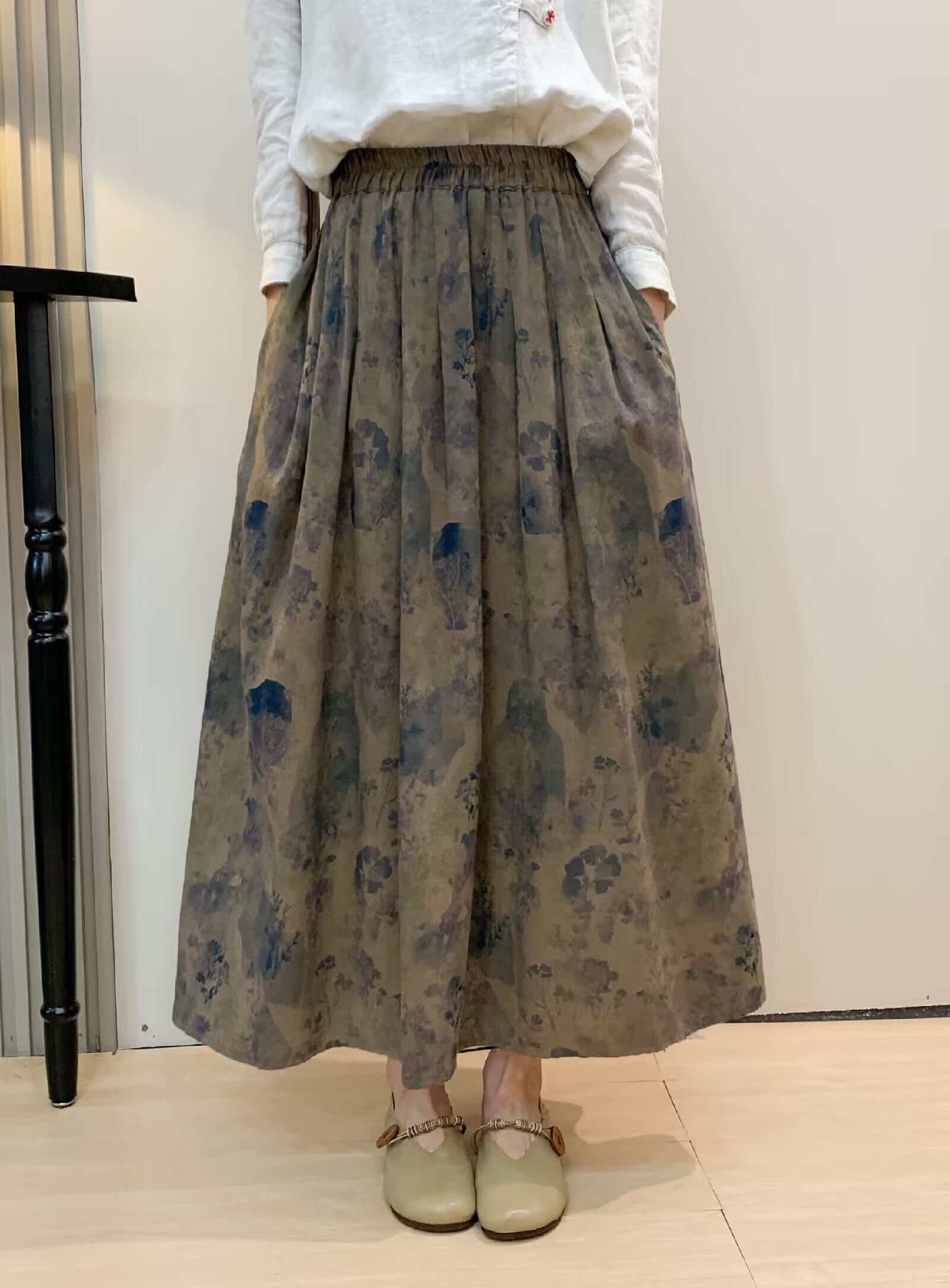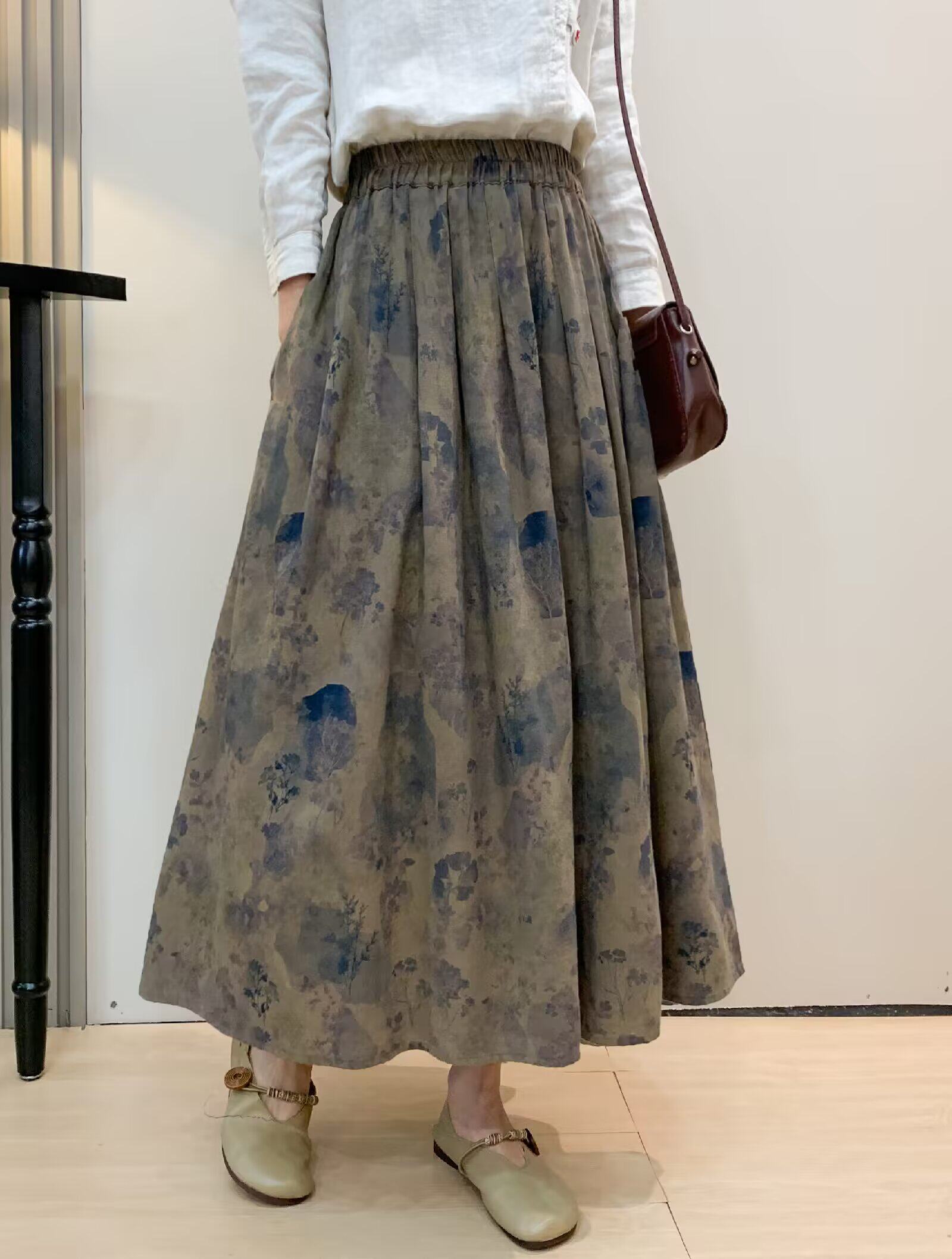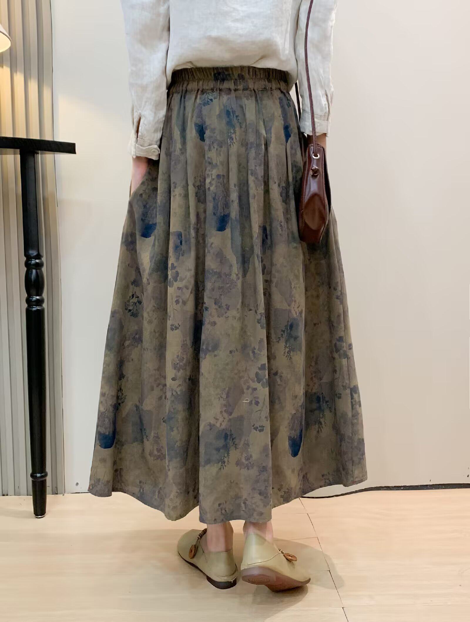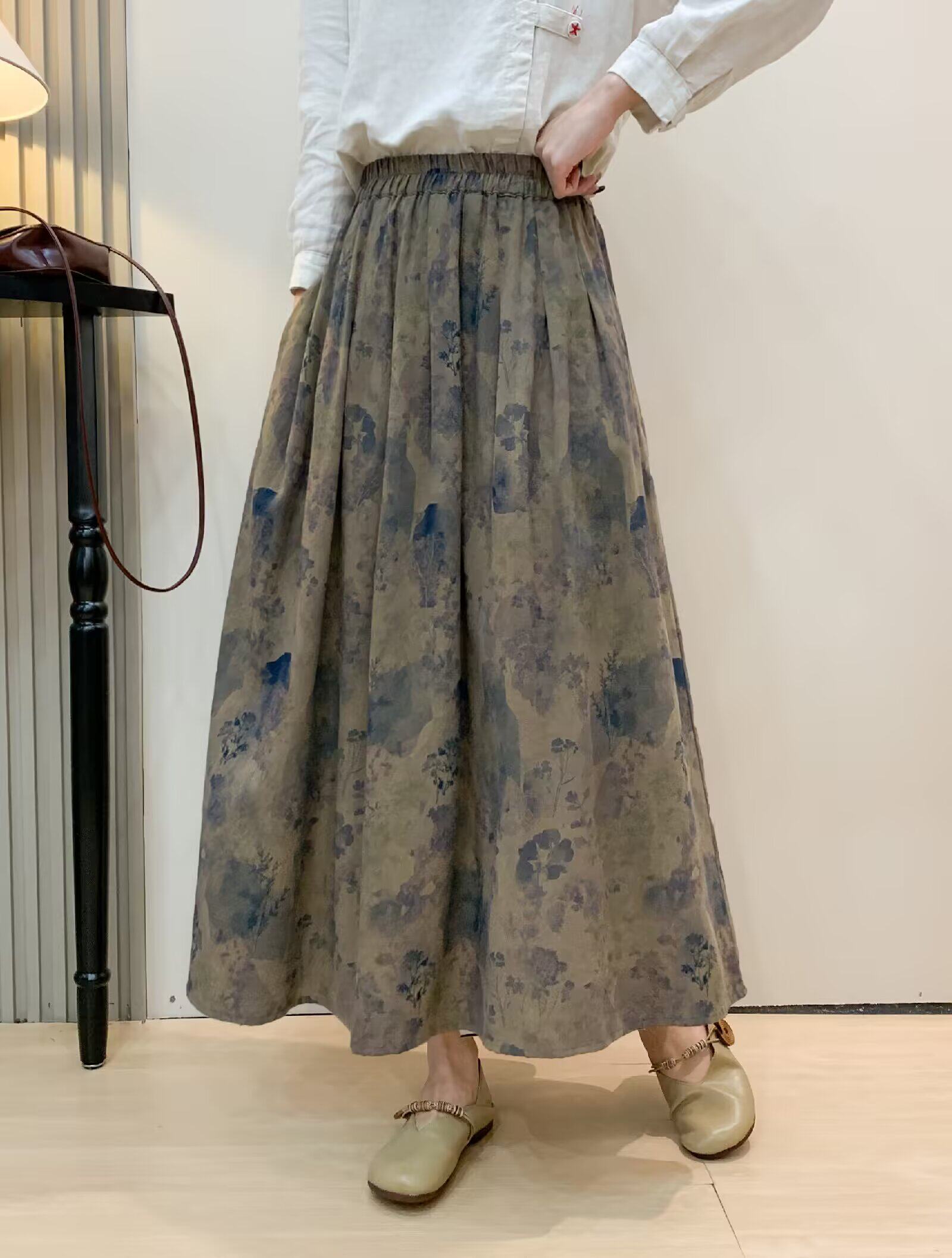 Artistic Retro Printed Cotton and Linen Skirt 2026 Spring High-Waisted Mid-Length Skirt Slimming Versatile Long Skirt