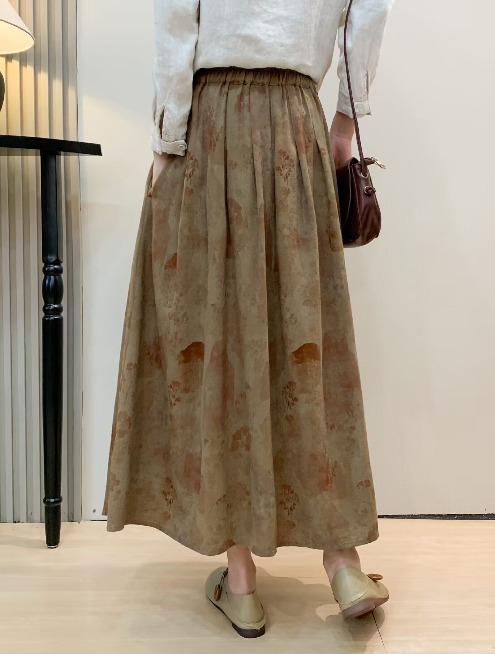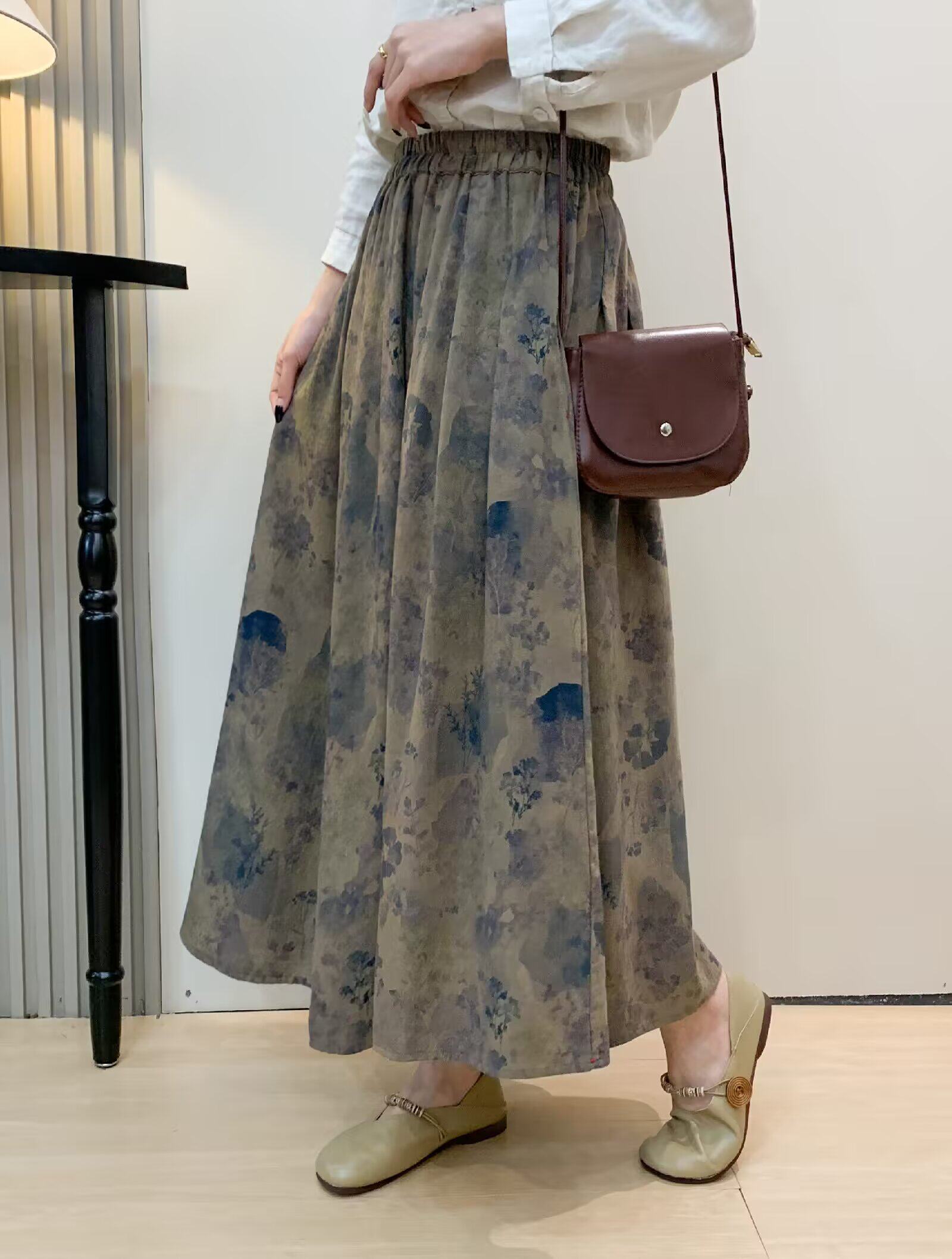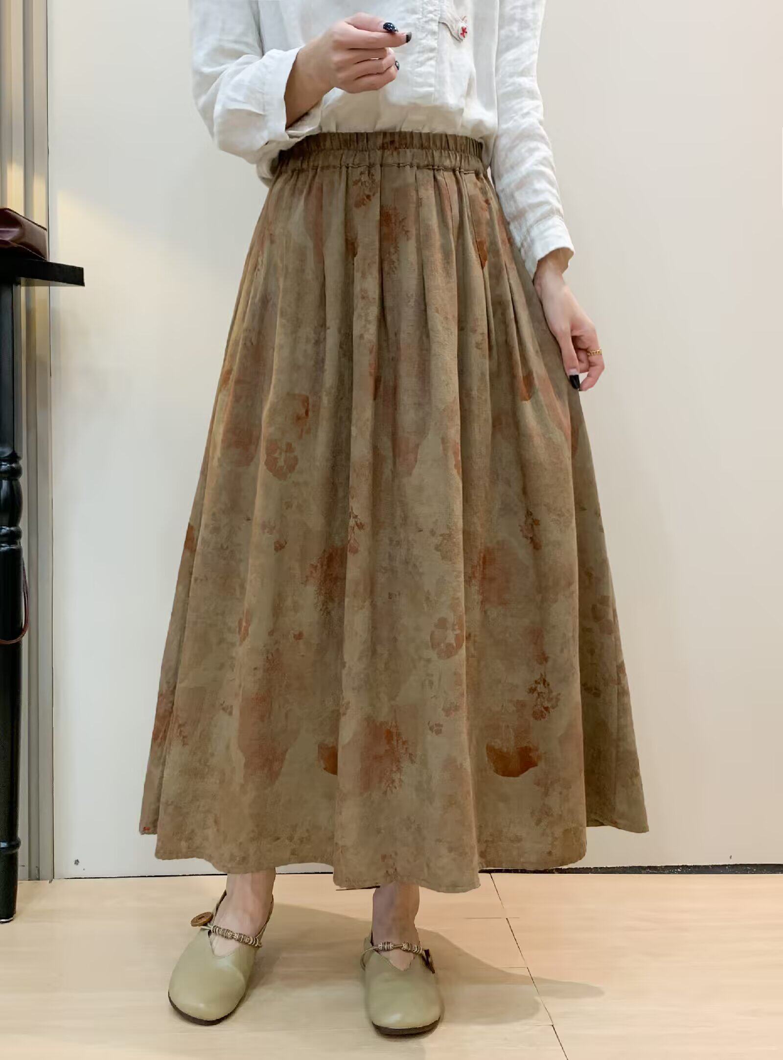 Artistic Retro Printed Cotton and Linen Skirt 2026 Spring High-Waisted Mid-Length Skirt Slimming Versatile Long Skirt