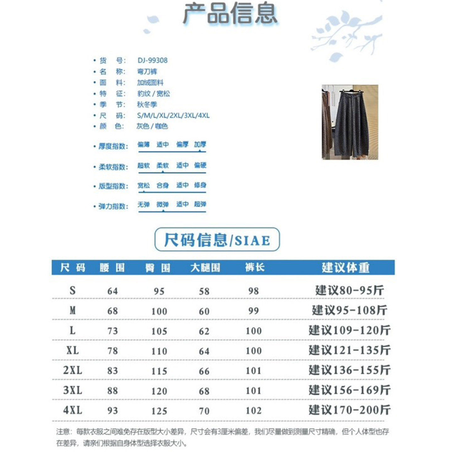 Outseam (cm) 99 cm 101.5 cm 104 cm 106.5 cm 109 cm