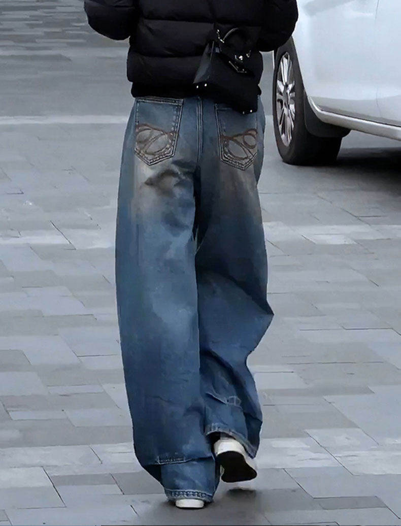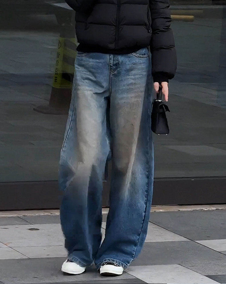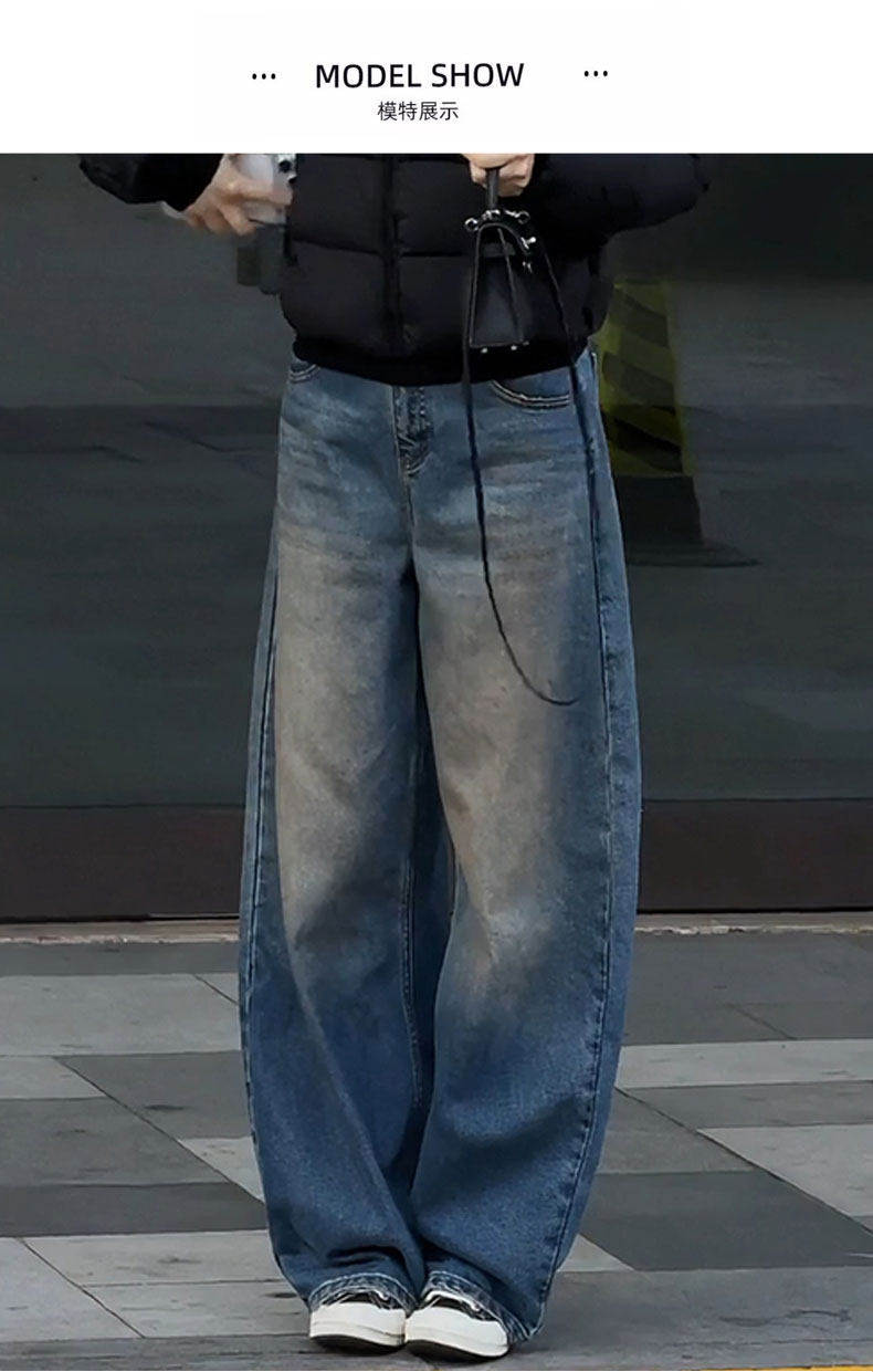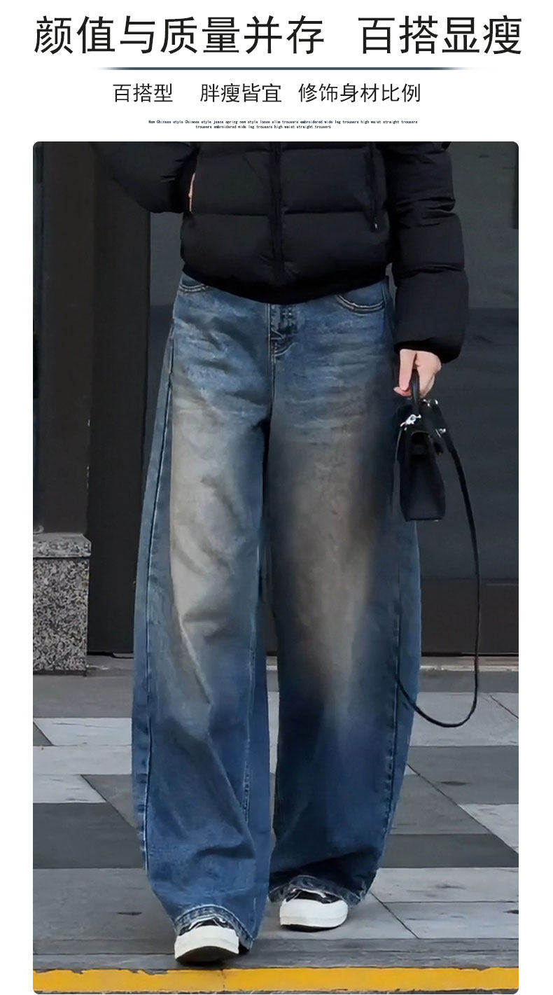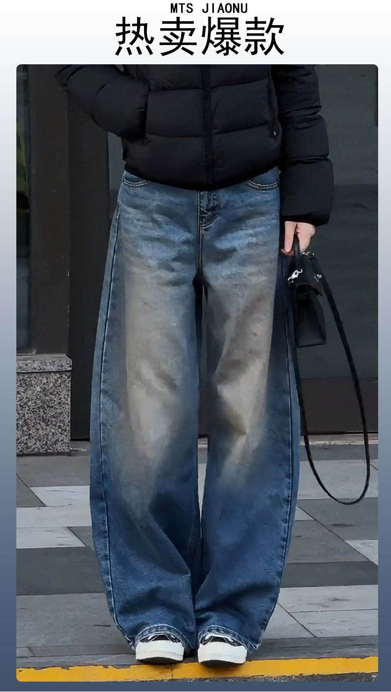Washed blue denim wide-leg pants for women 2025 autumn and winter new high-waisted plus velvet thickened loose straight trousers