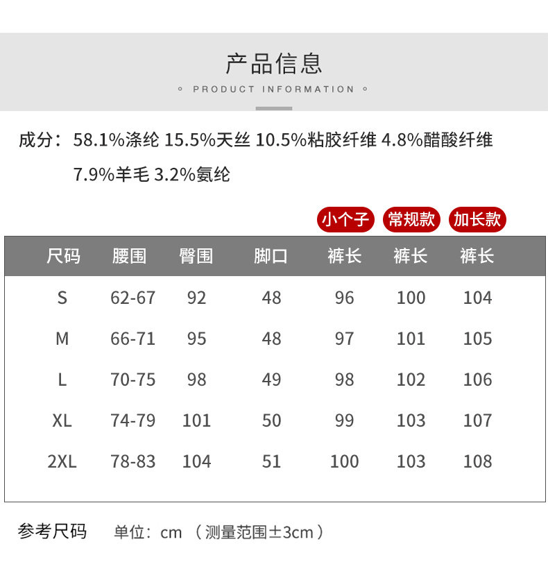 Outseam (cm) 99 cm 101.5 cm 104 cm 106.5 cm 109 cm
