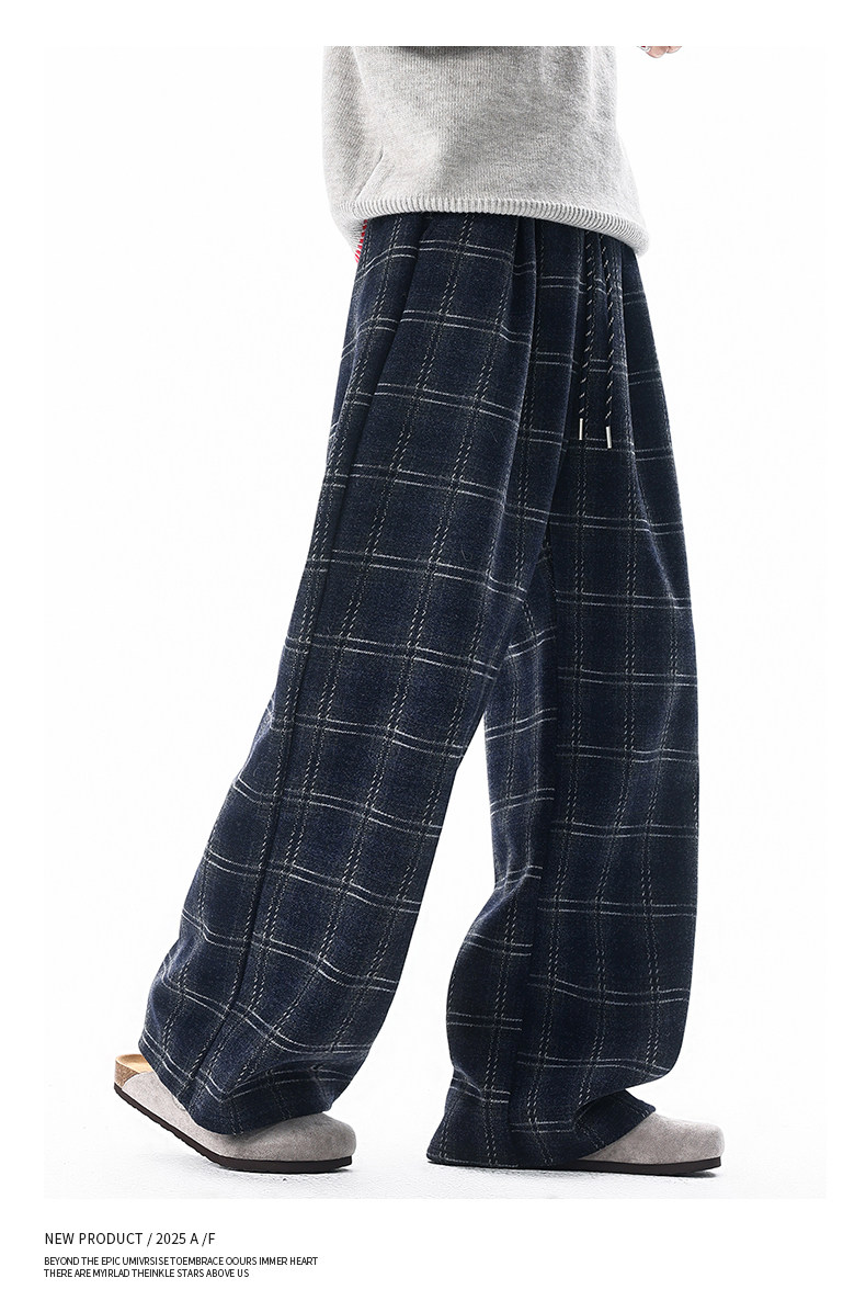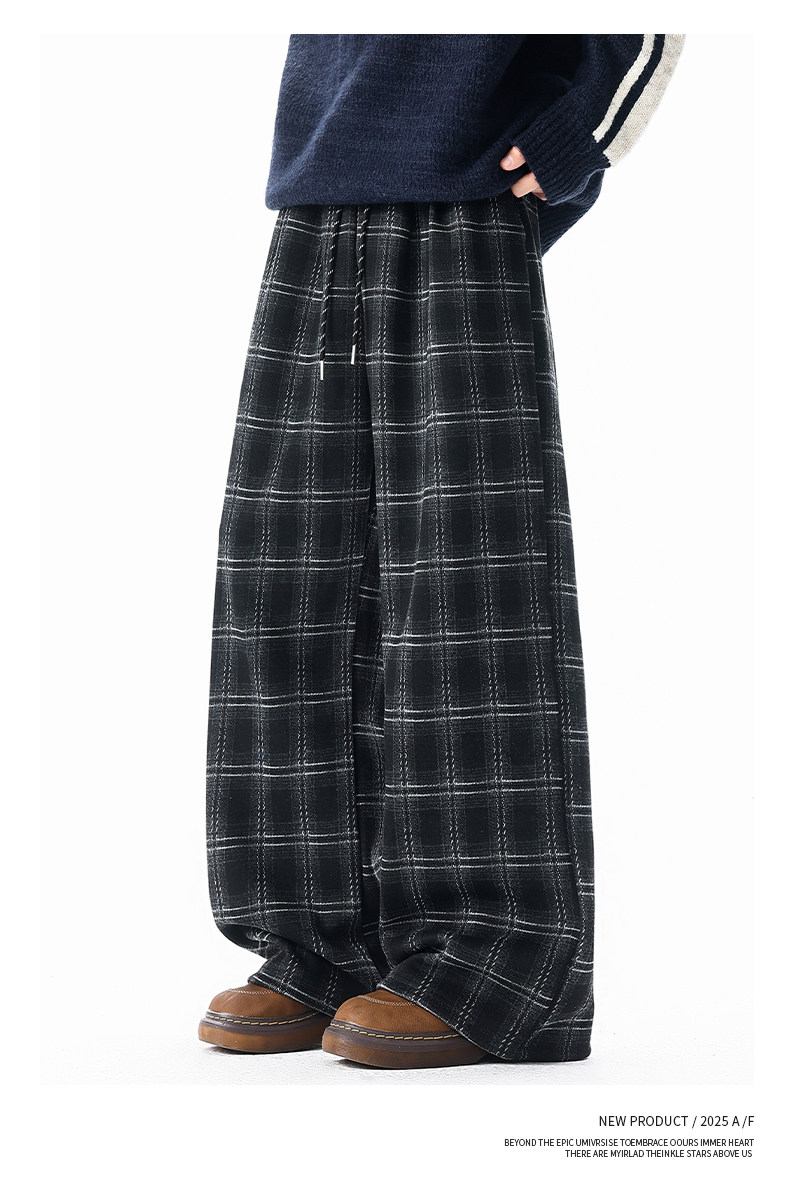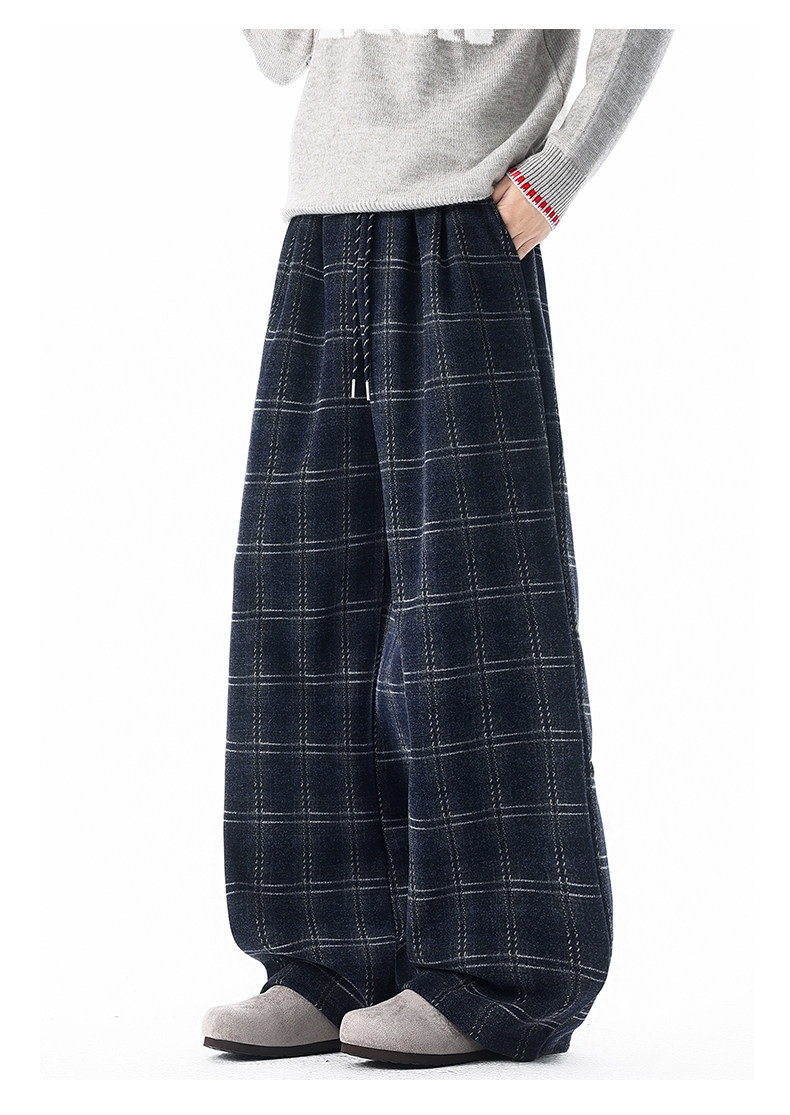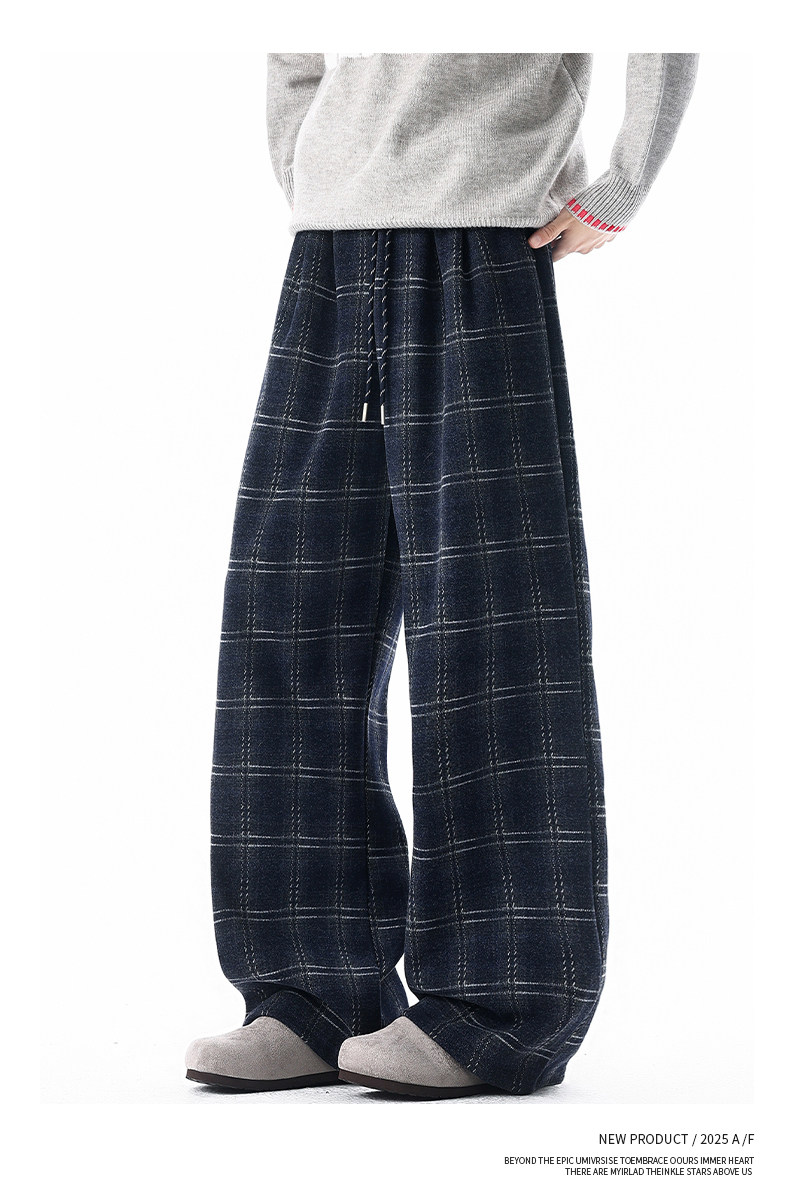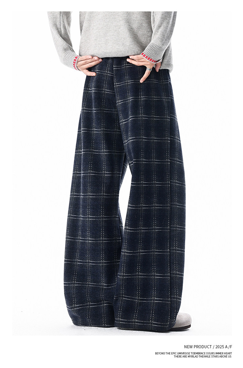Pure heavyweight plus velvet plaid casual pants for men in winter, thickened and warm, American retro loose wide-leg straight trousers