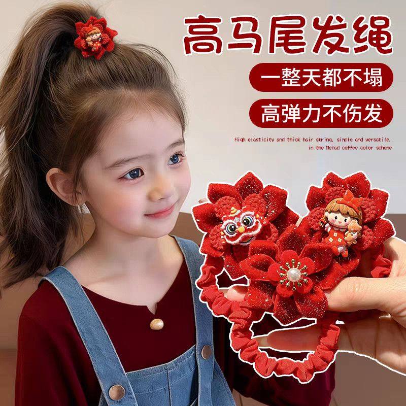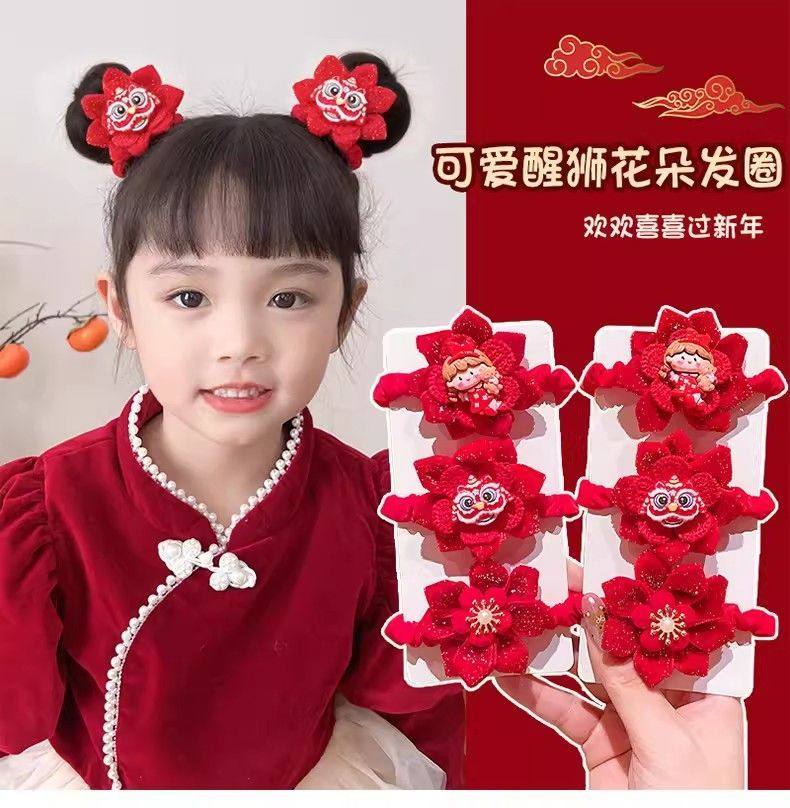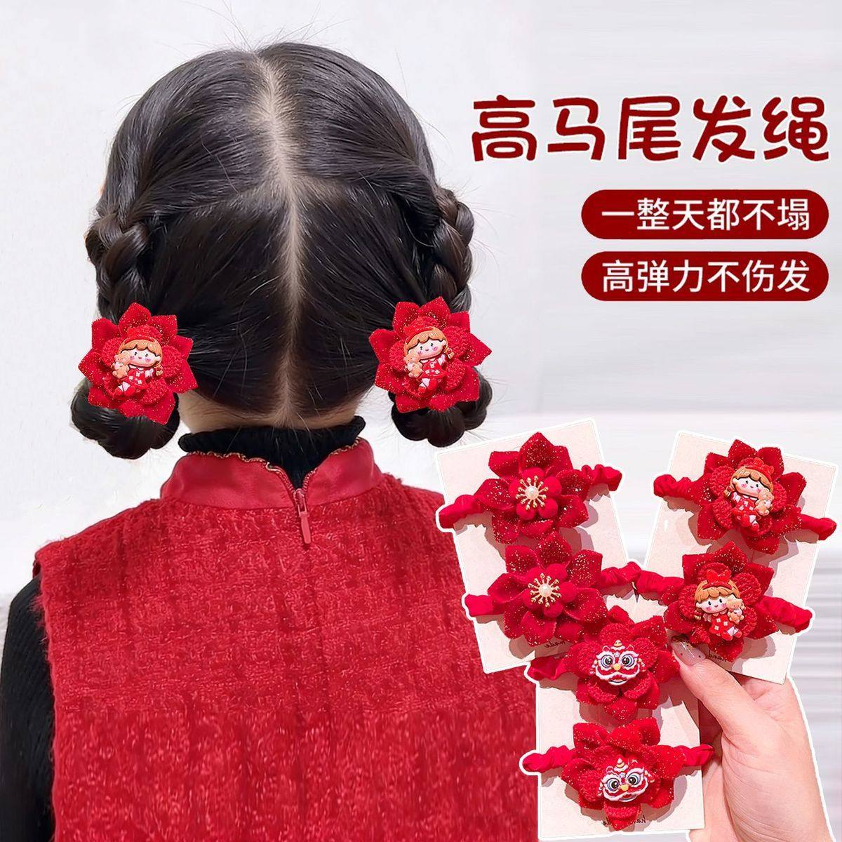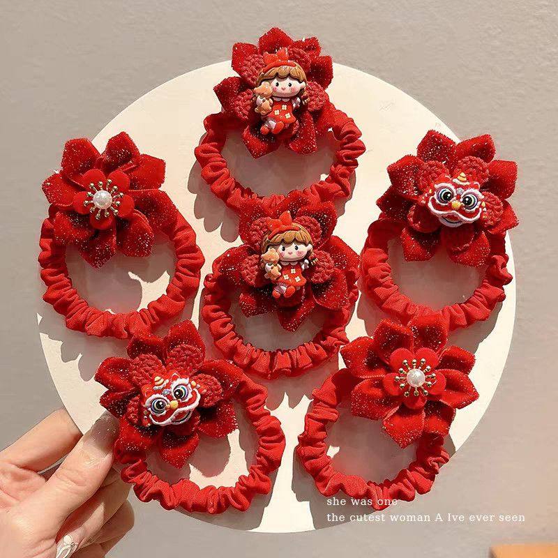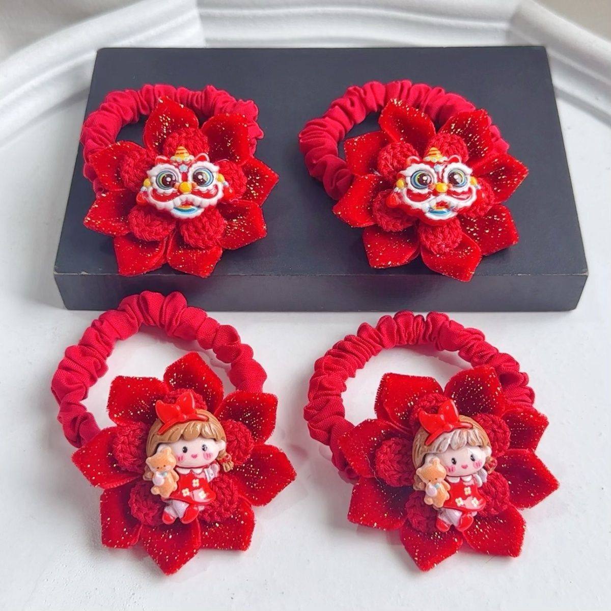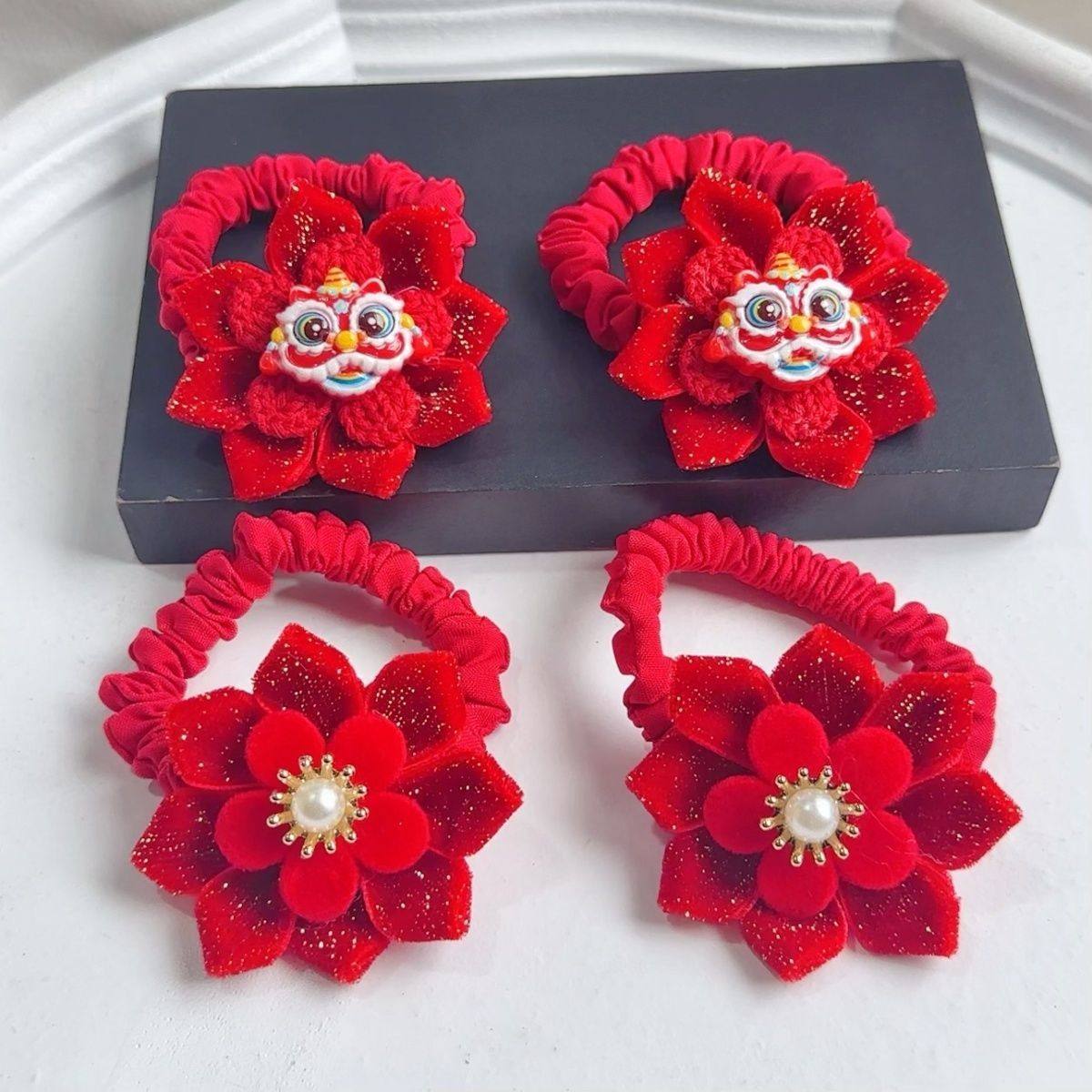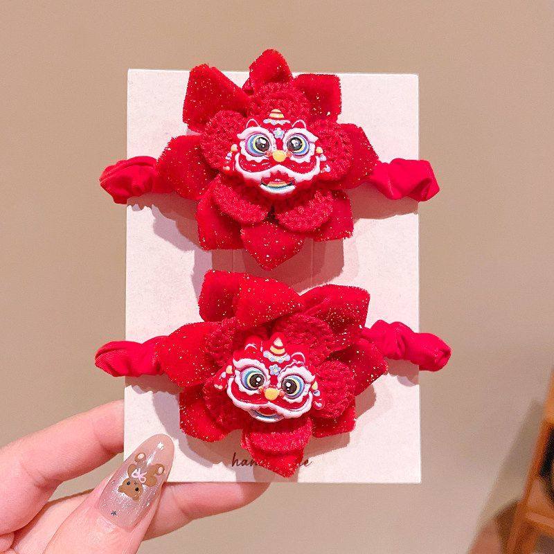 Детские красные резинки для волос, не повреждающие волосы, с изображением маленьких львят, цветами в китайском стиле, милые и праздничные новогодние аксессуары для волос.