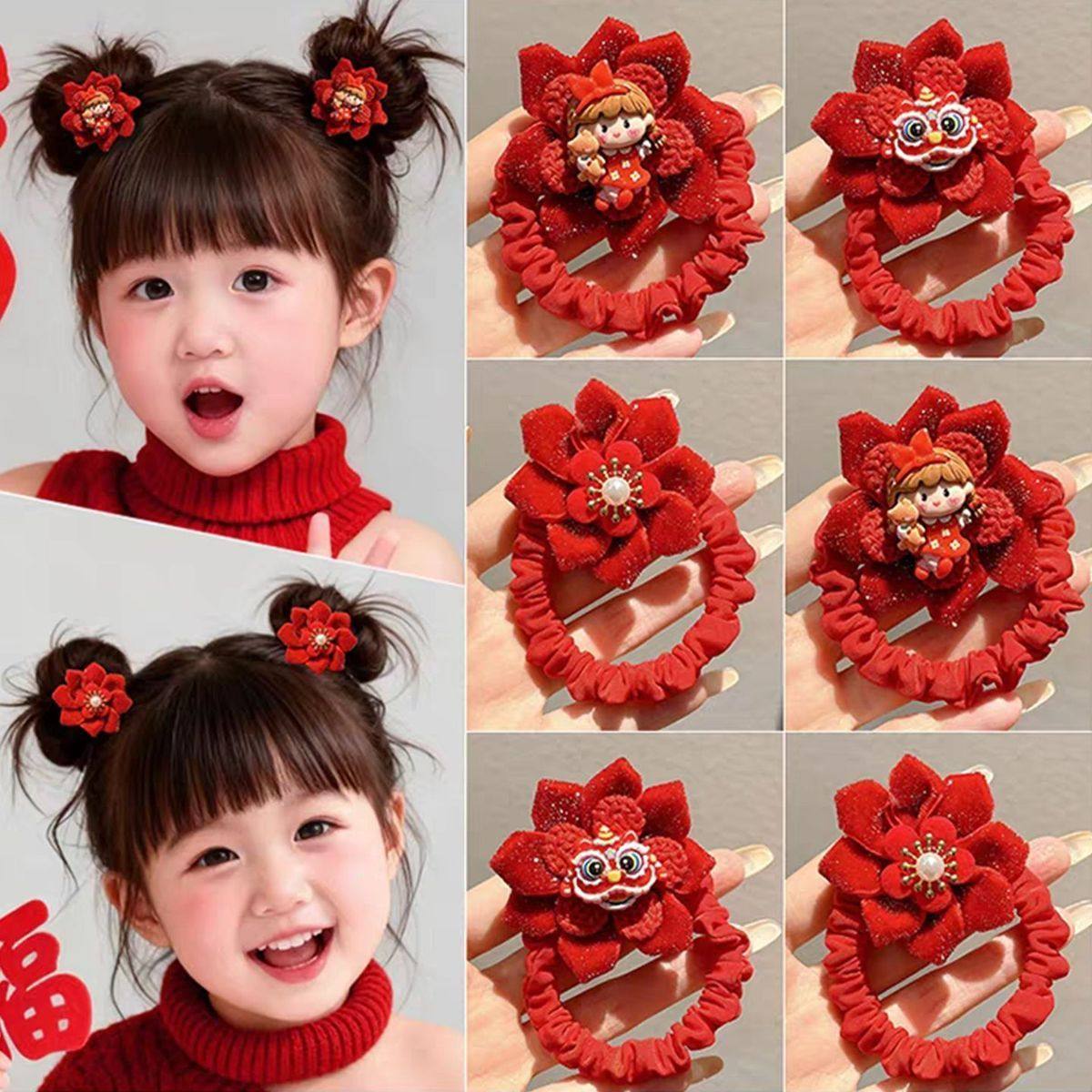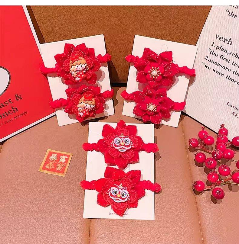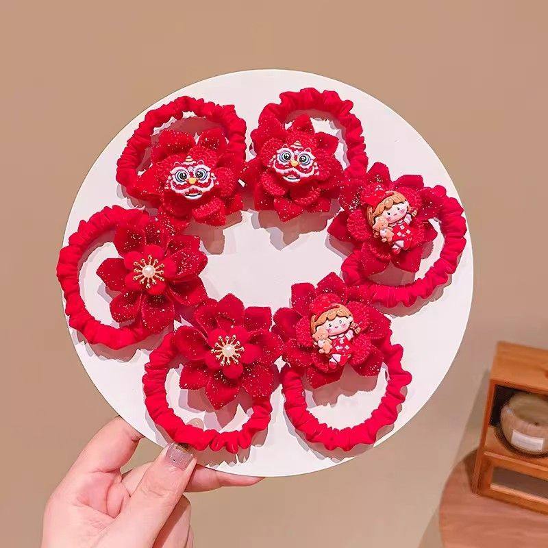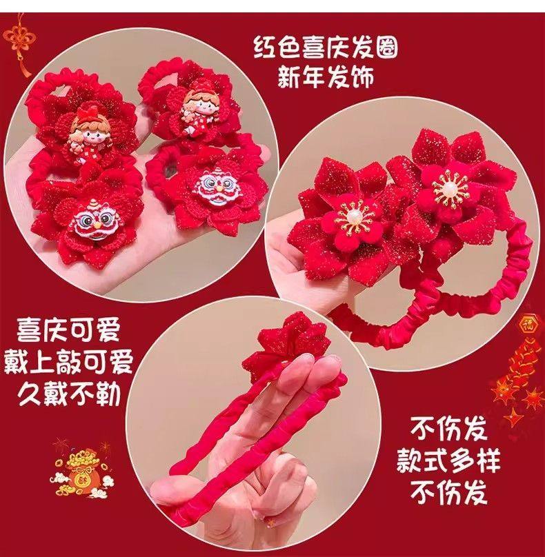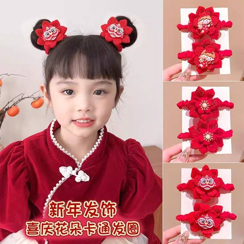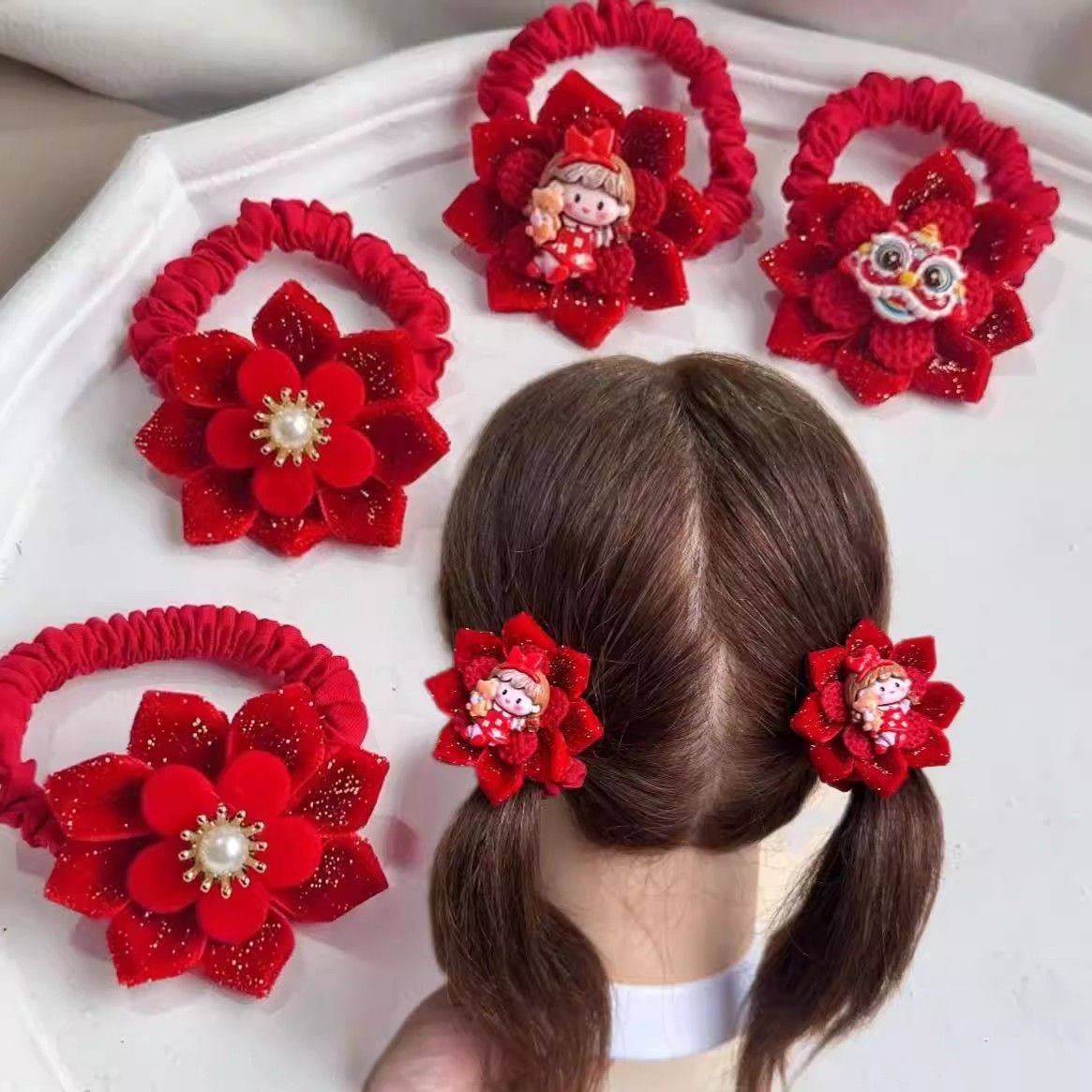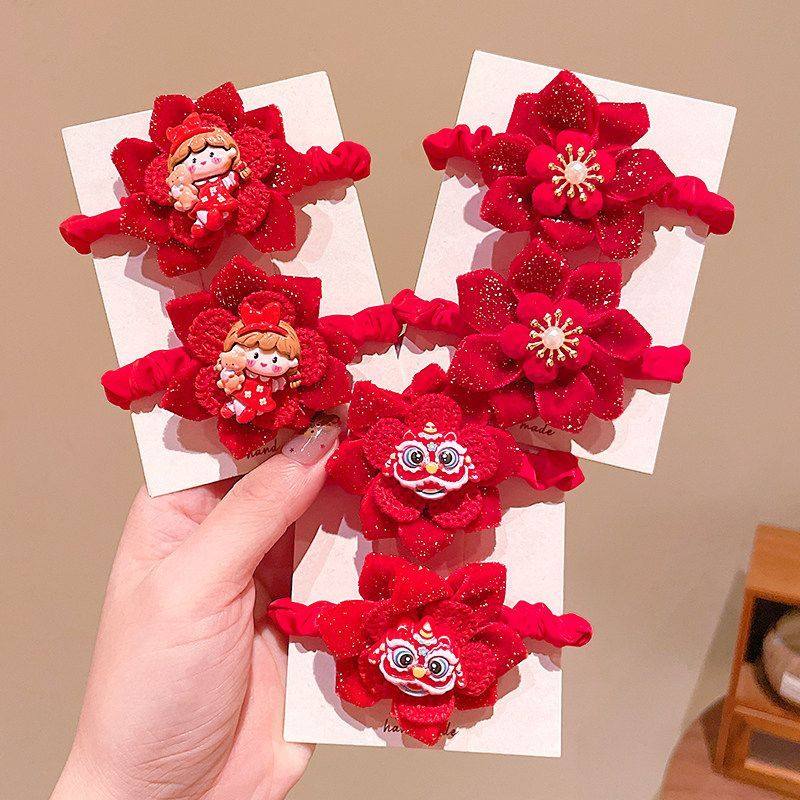 Детские красные резинки для волос, не повреждающие волосы, с изображением маленьких львят, цветами в китайском стиле, милые и праздничные новогодние аксессуары для волос.