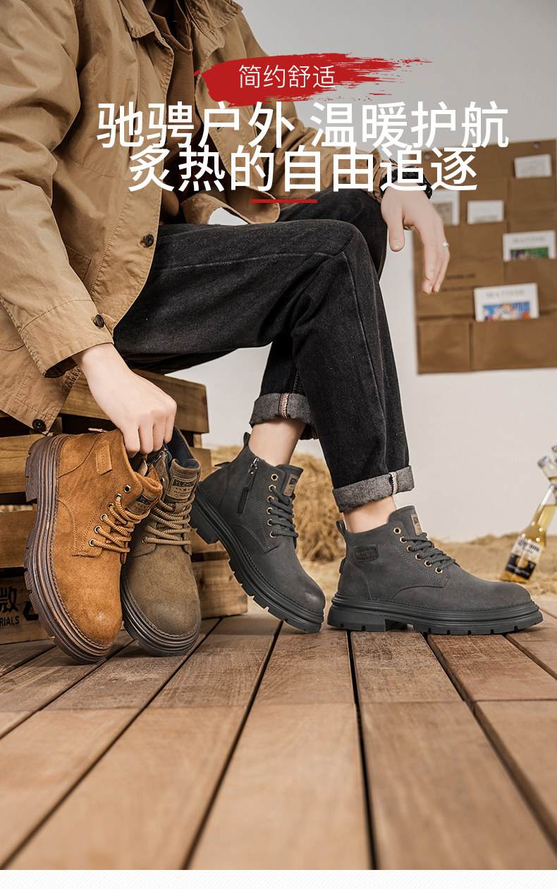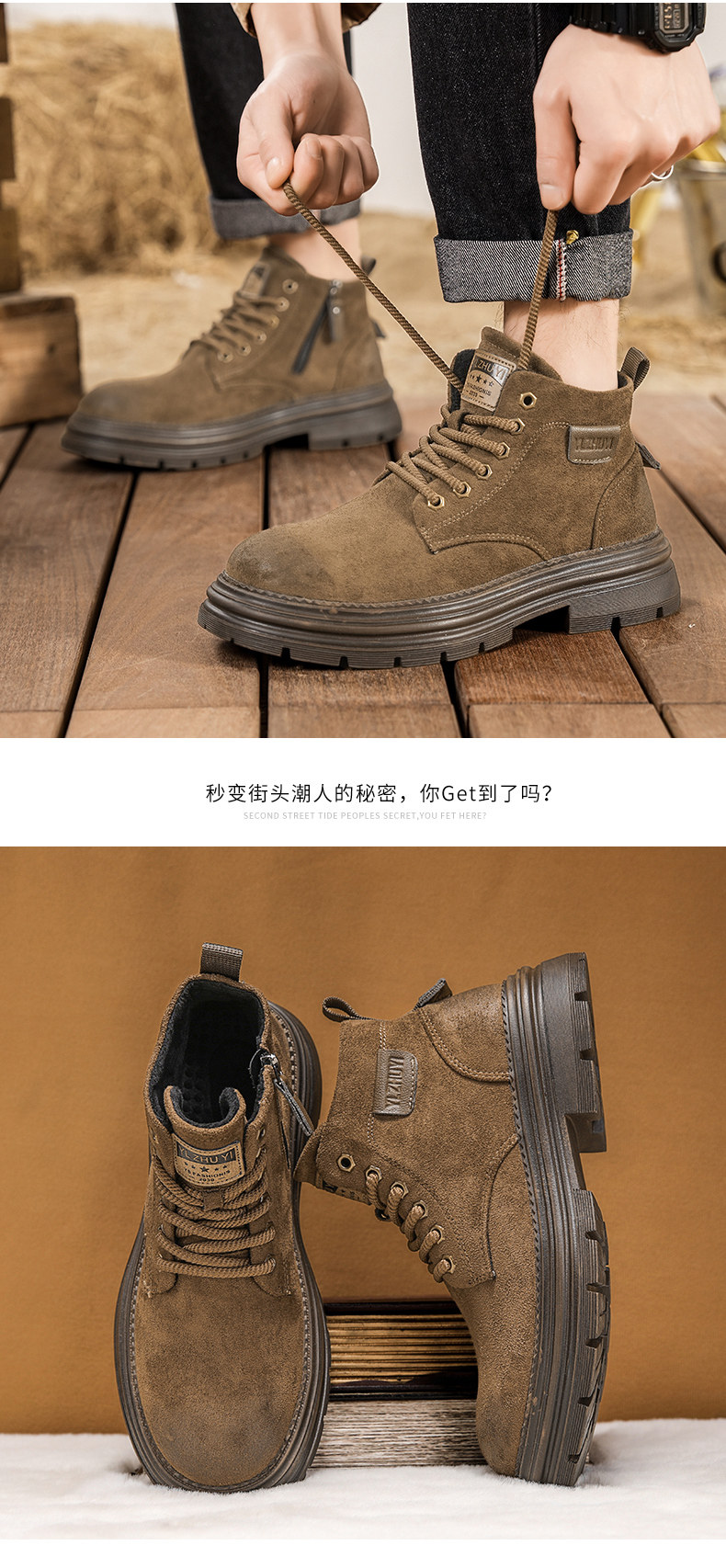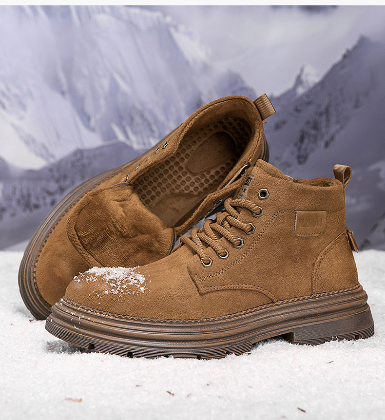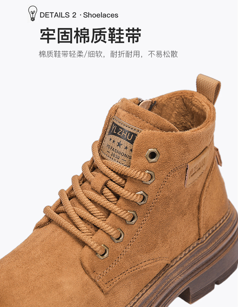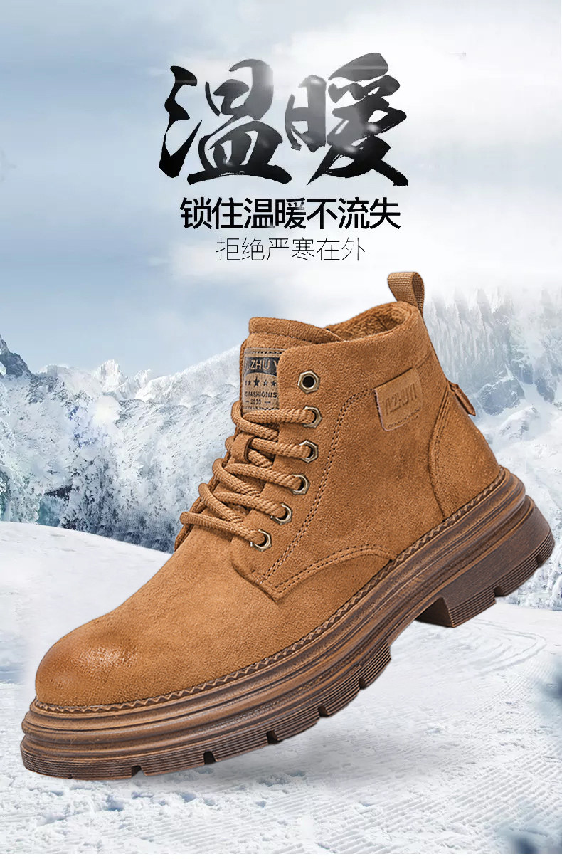 Men's Snow Boots, Winter British Retro Style, Mid-Top Work Boots, Yellow Boots, Fleece-Lined, Thickened, Warm, Cold-Resistant, Northeast Cotton Shoes