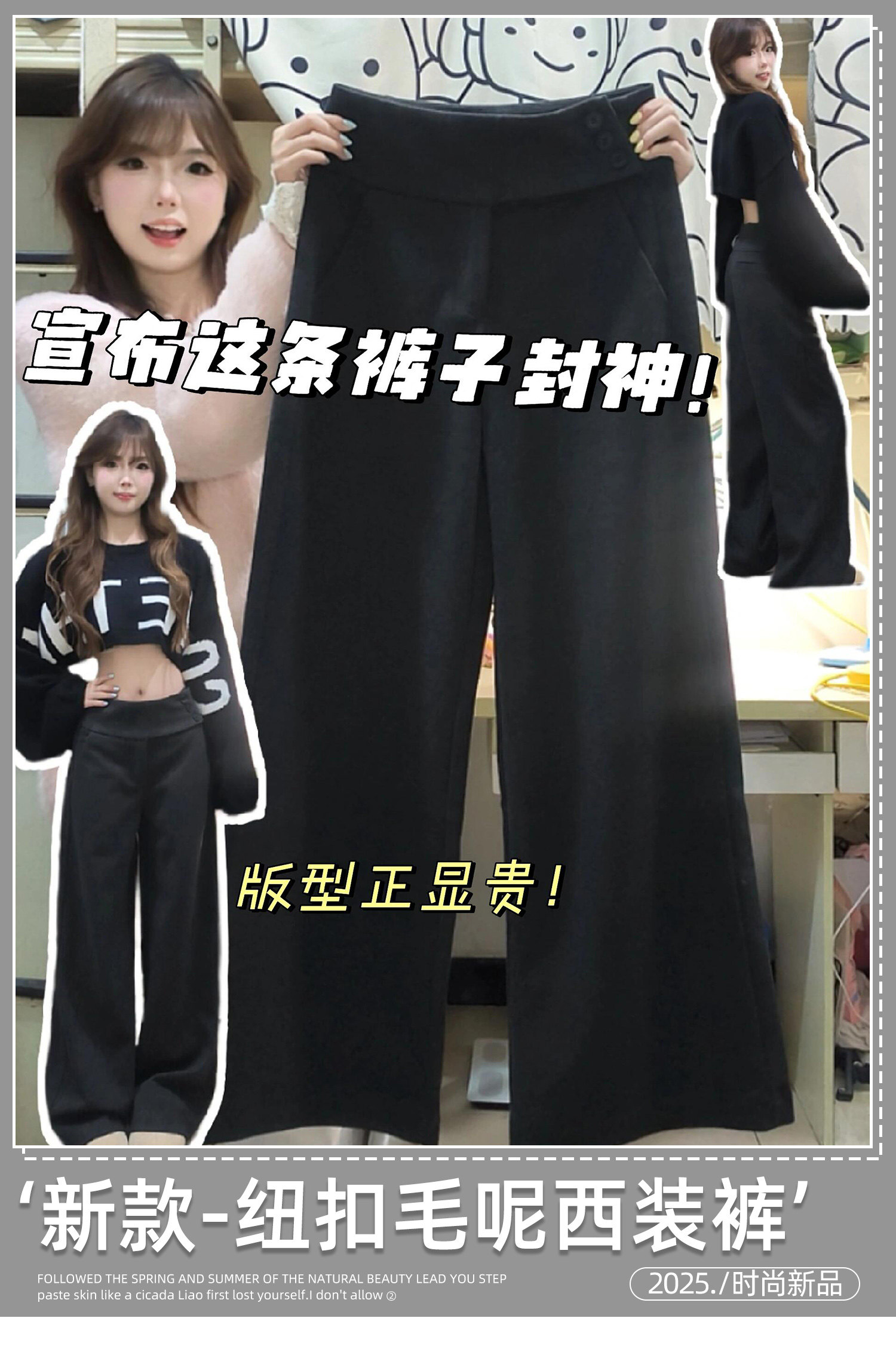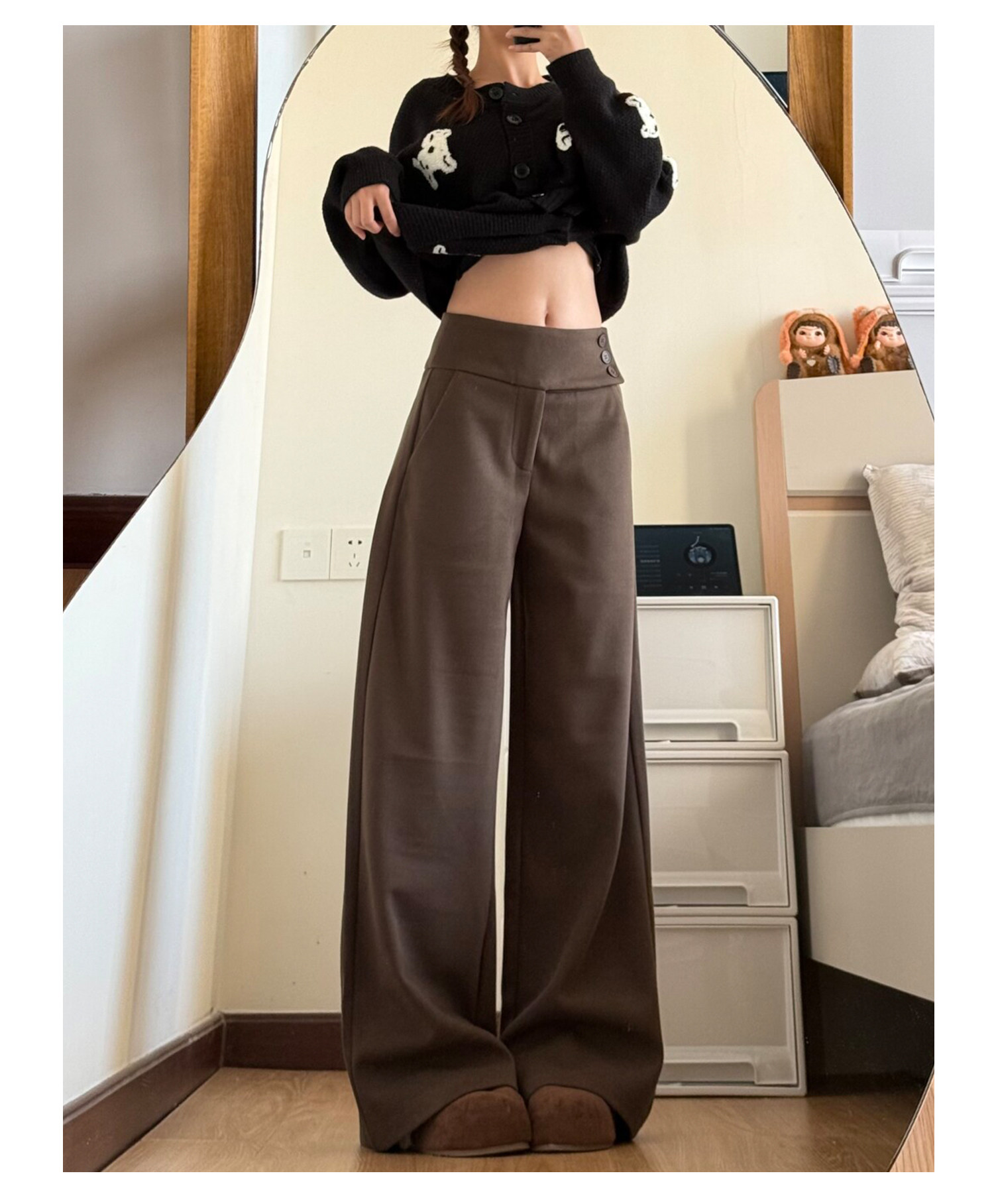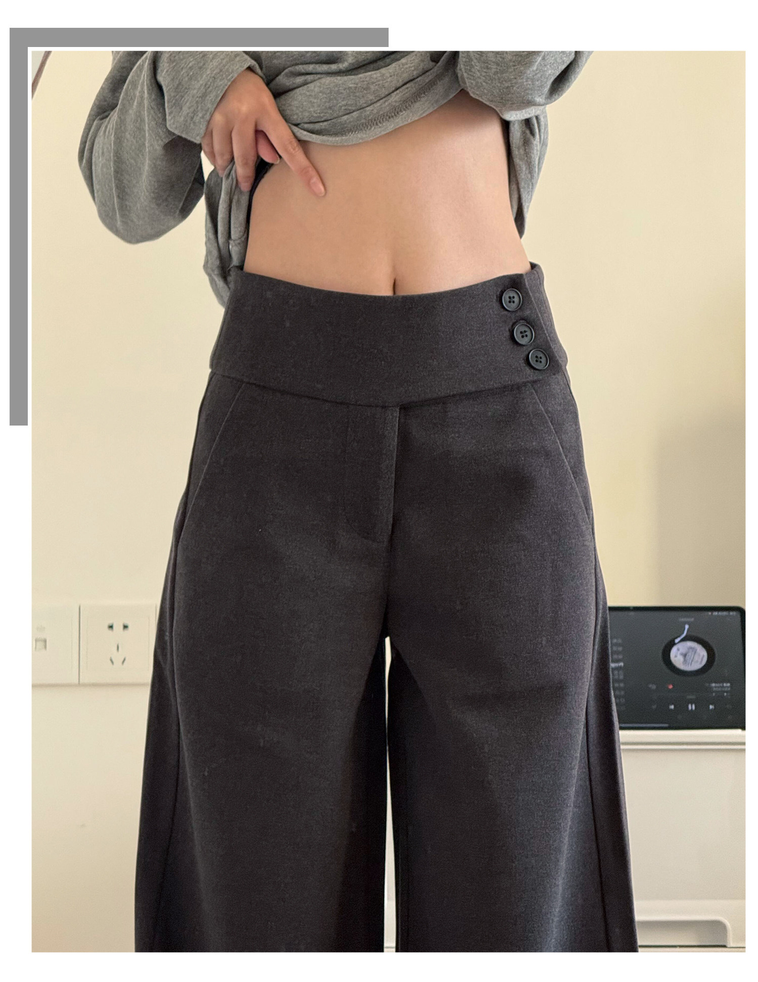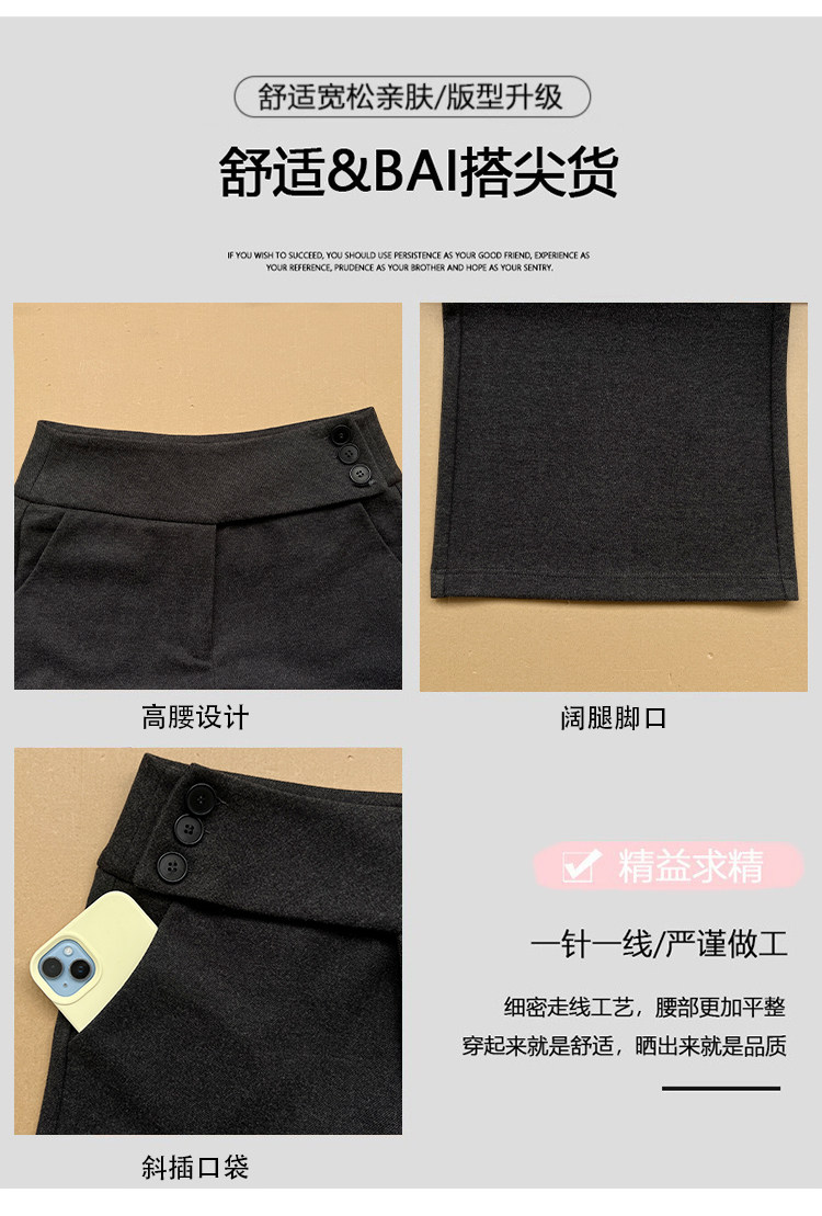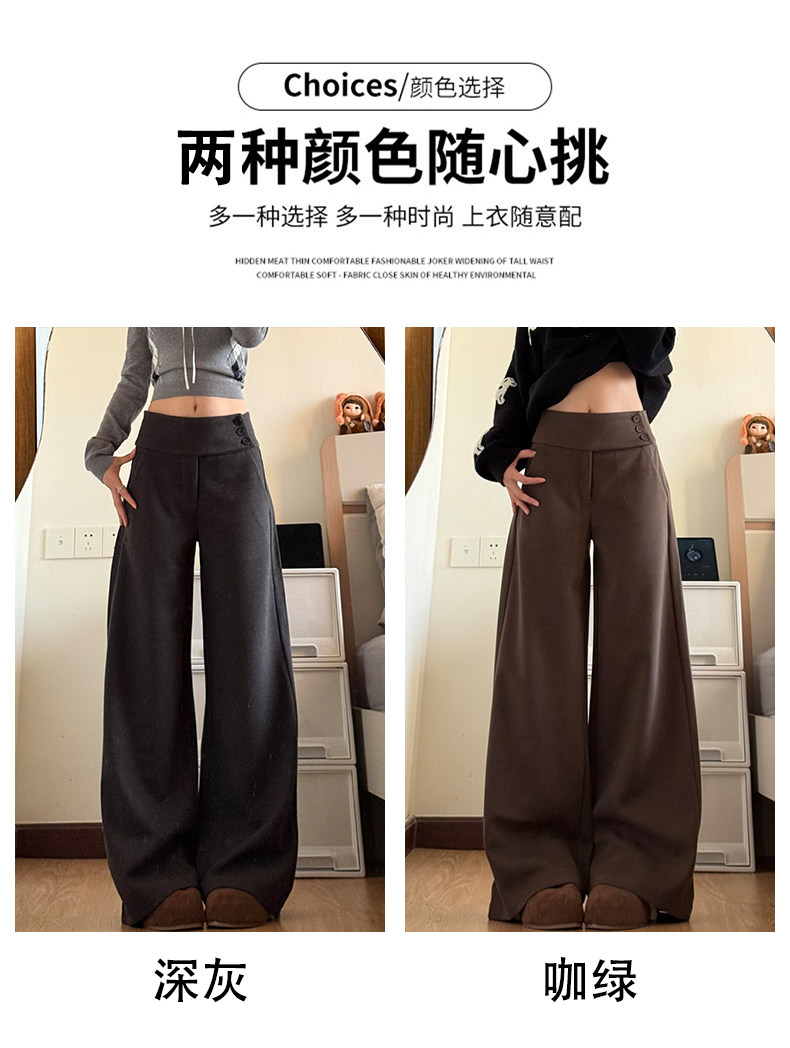 Gray thickened woolen buttoned wide-leg pants for women in autumn and winter, low-waisted and drapey, lazy suit pants, casual loose straight pants