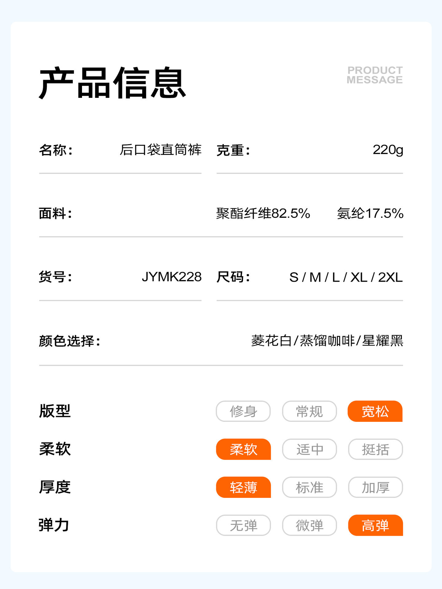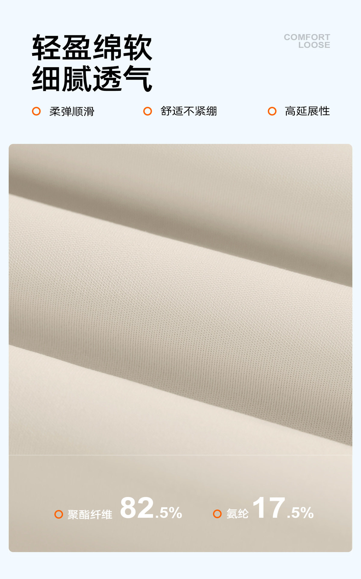 Material Composition 82.5% Polyester Fiber, 17.5% Polyurethane Elastic Fiber (Spandex)