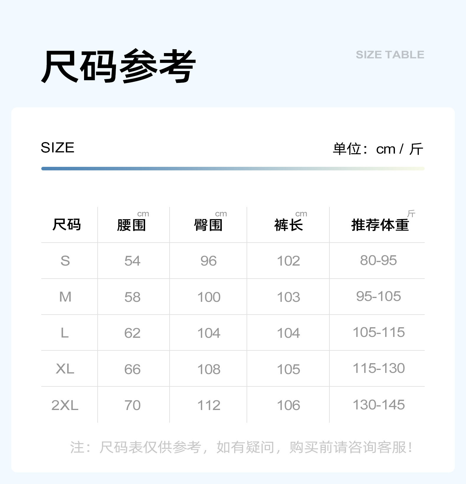 Outseam (cm) 99 cm 101.5 cm 104 cm 106.5 cm 109 cm
