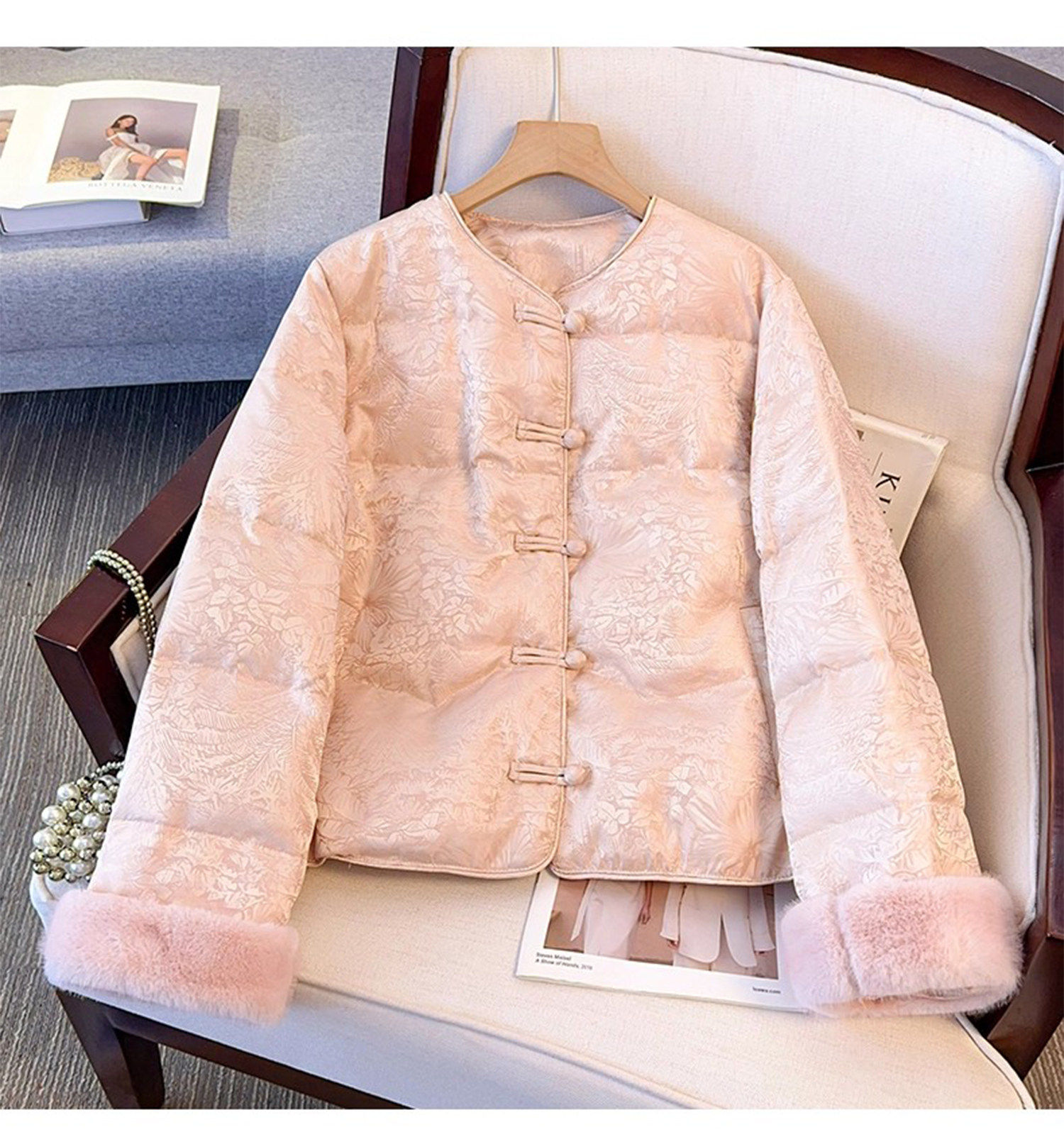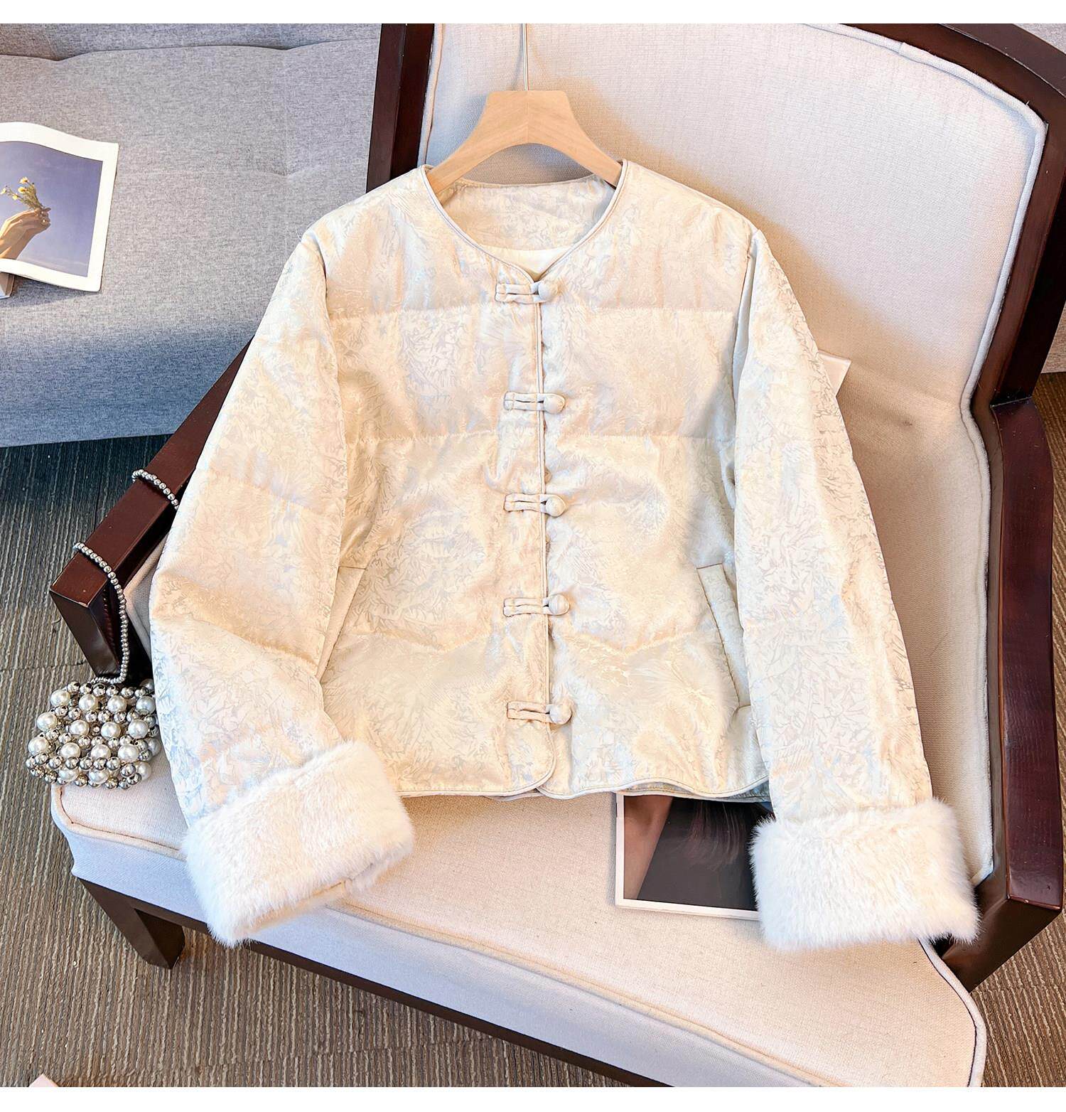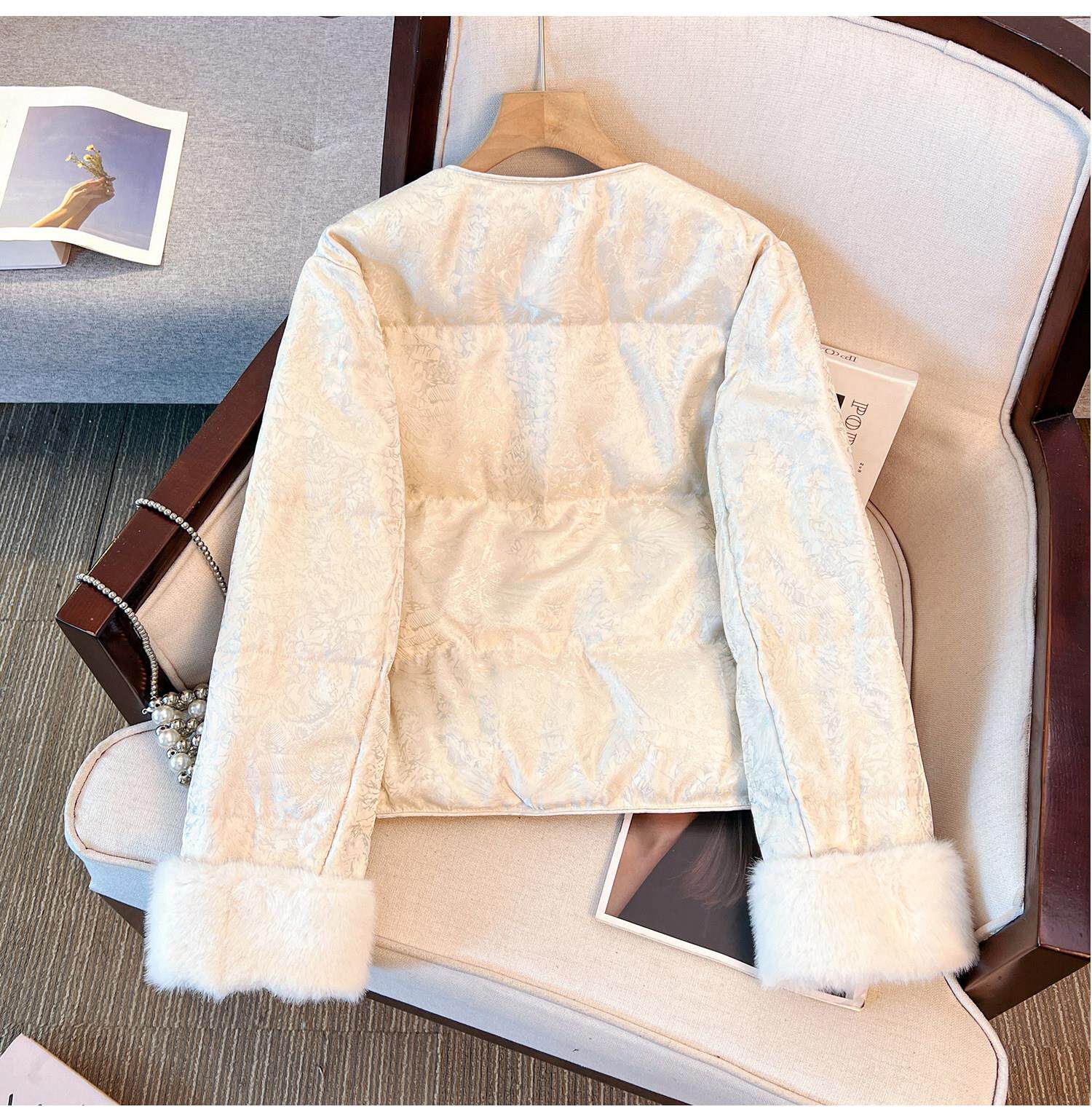 New Chinese Style Jacquard Disc Button Down Jacket Women's Short 2025 Winter Wear New Cuffs Lambswool Splicing Jacket