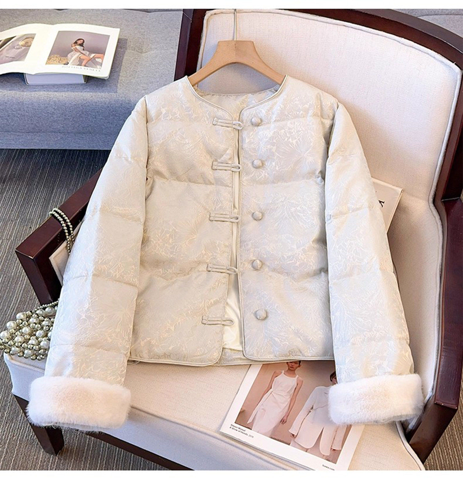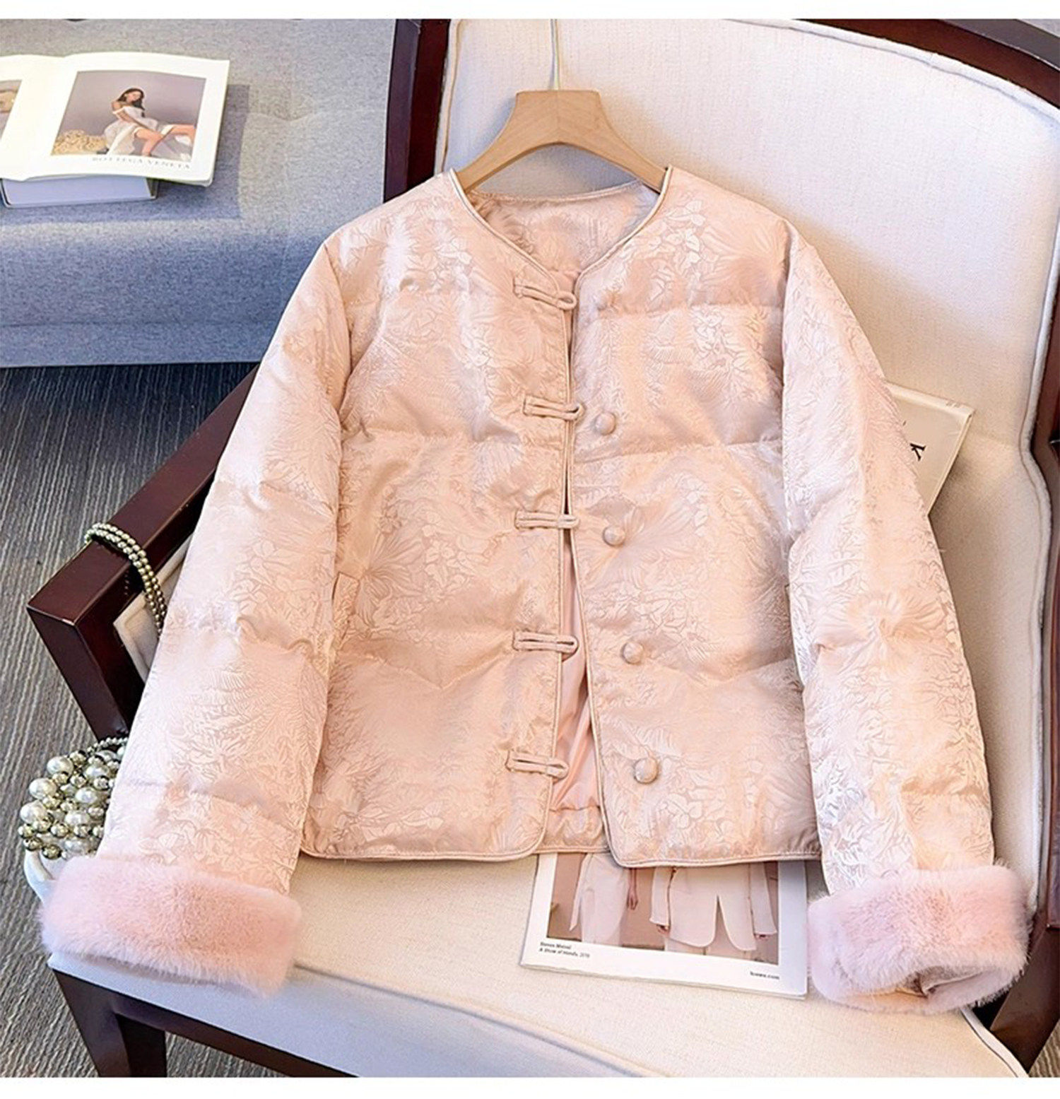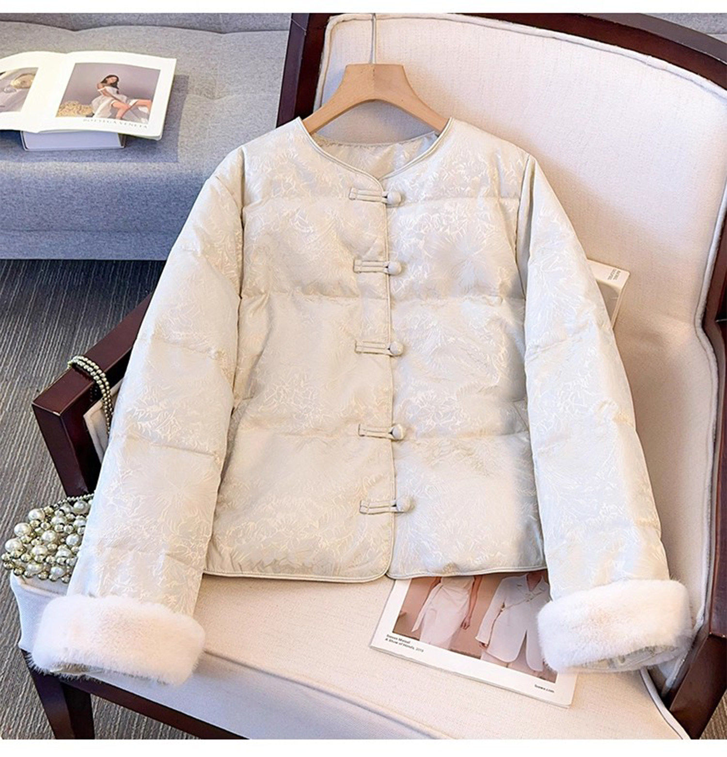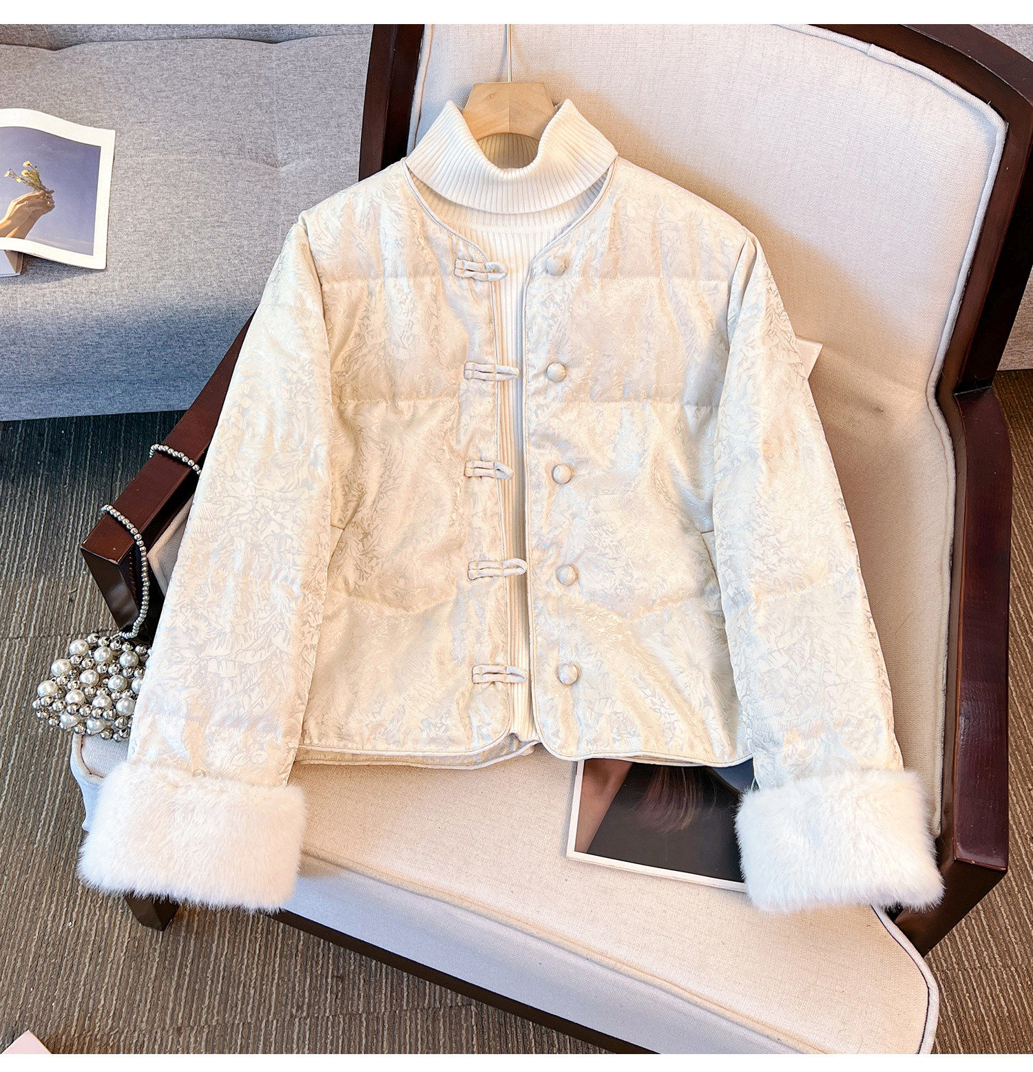 New Chinese Style Jacquard Disc Button Down Jacket Women's Short 2025 Winter Wear New Cuffs Lambswool Splicing Jacket