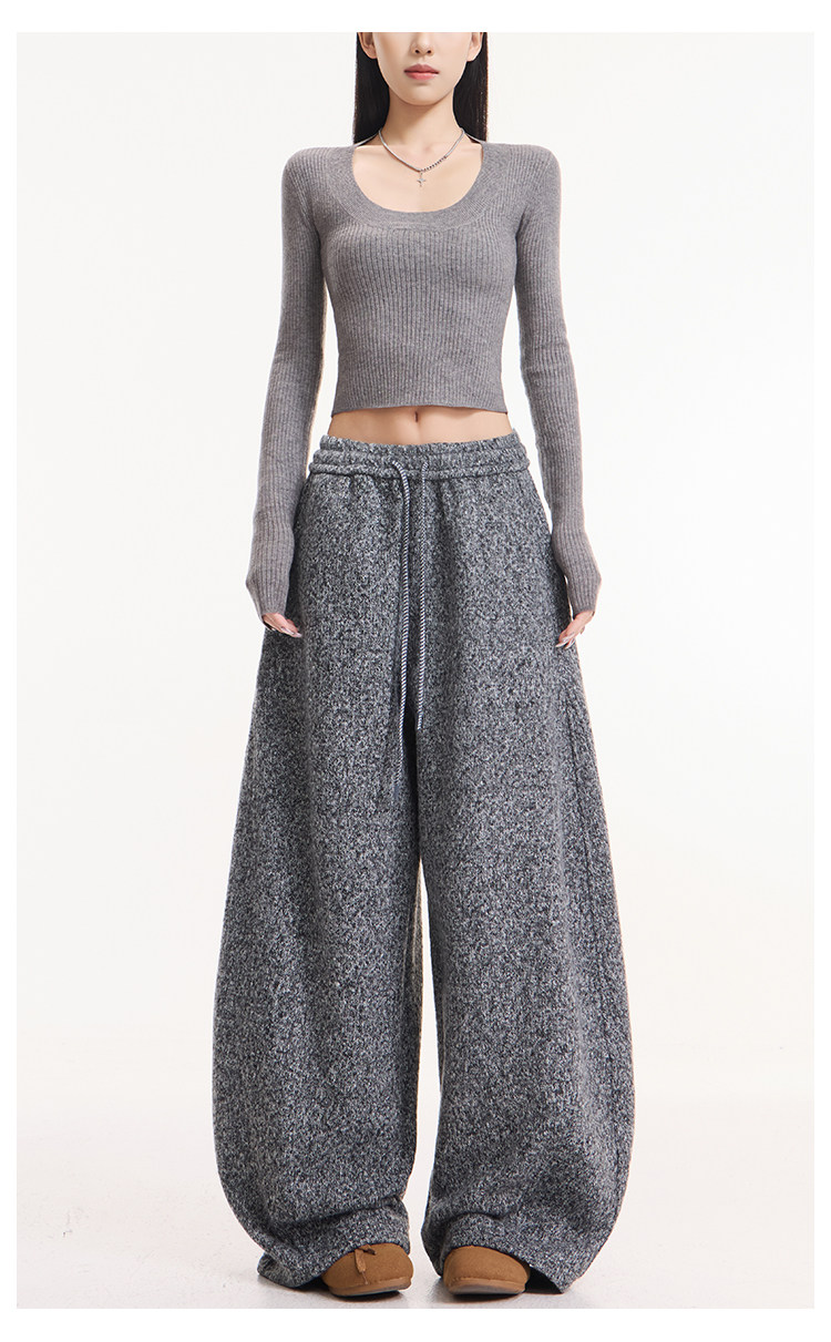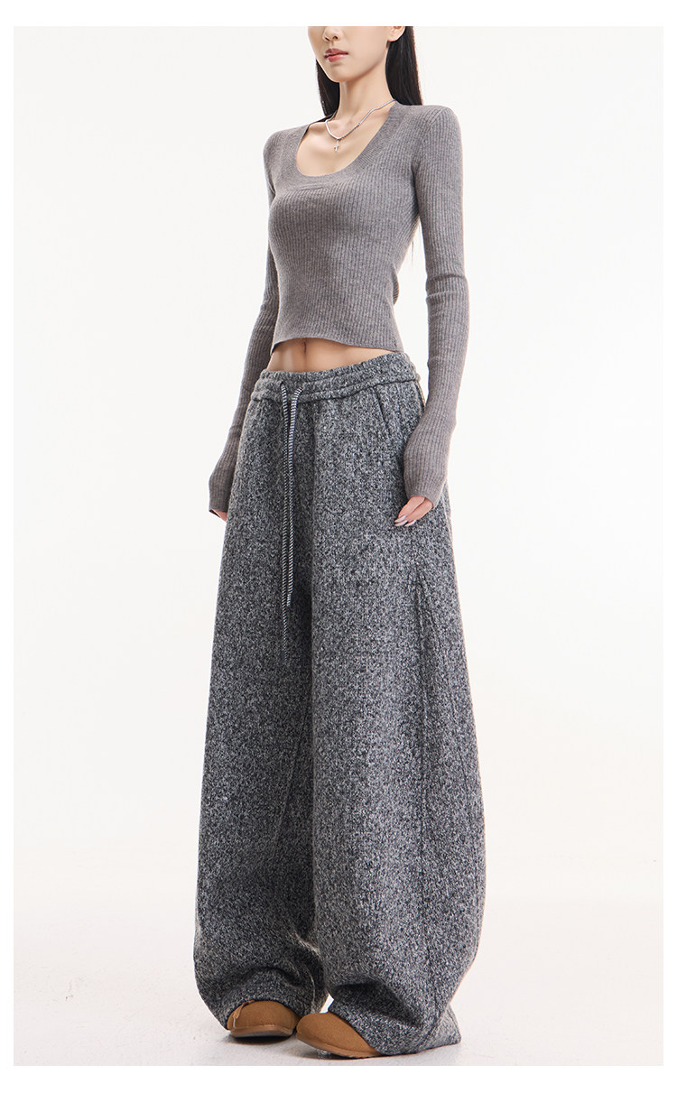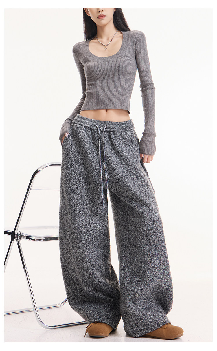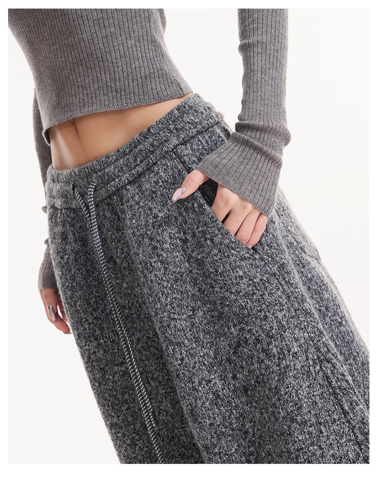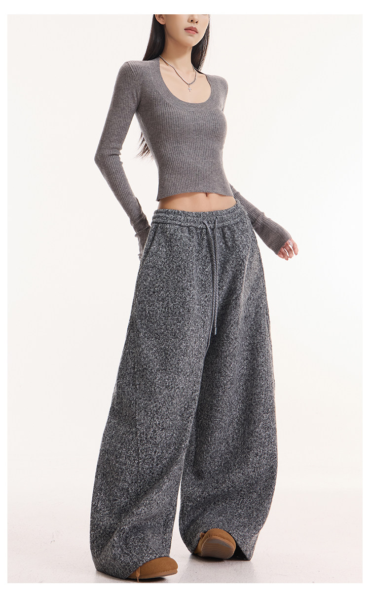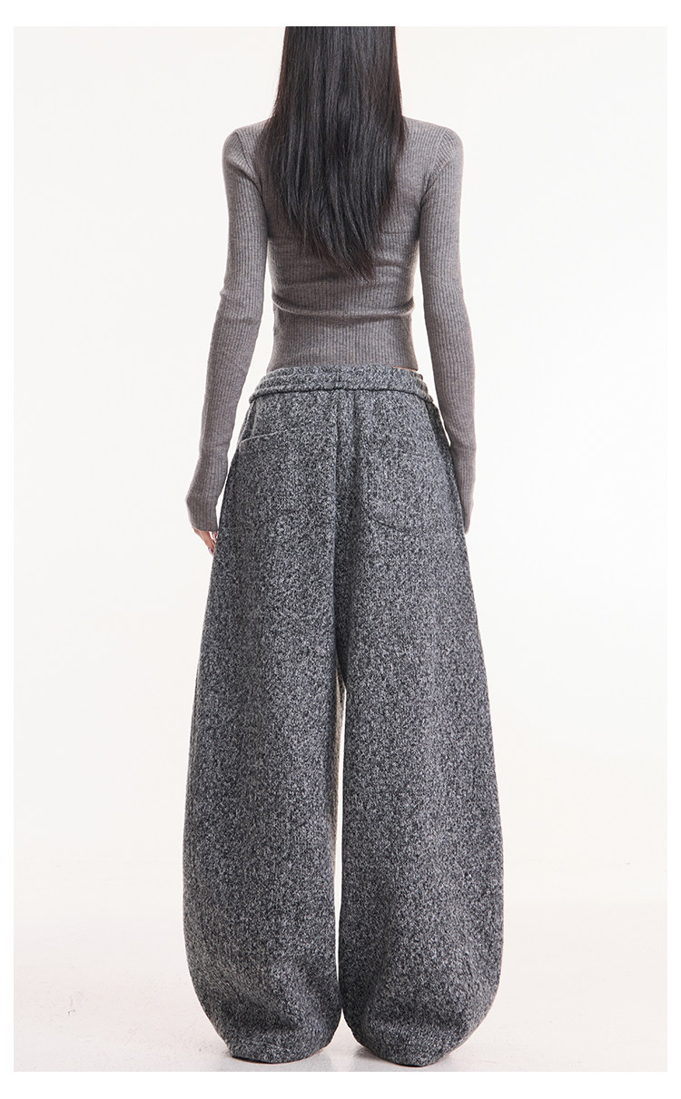 Kenabstudio Autumn and Winter New Gray Wide-Leg Casual Pants for Women, Thickened and Fleece-Lined, Elastic Waist Scimitar Pants