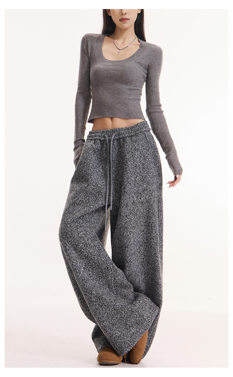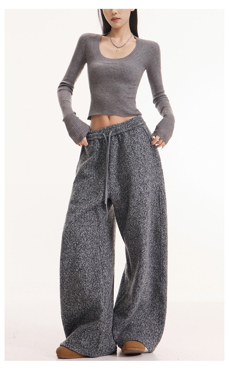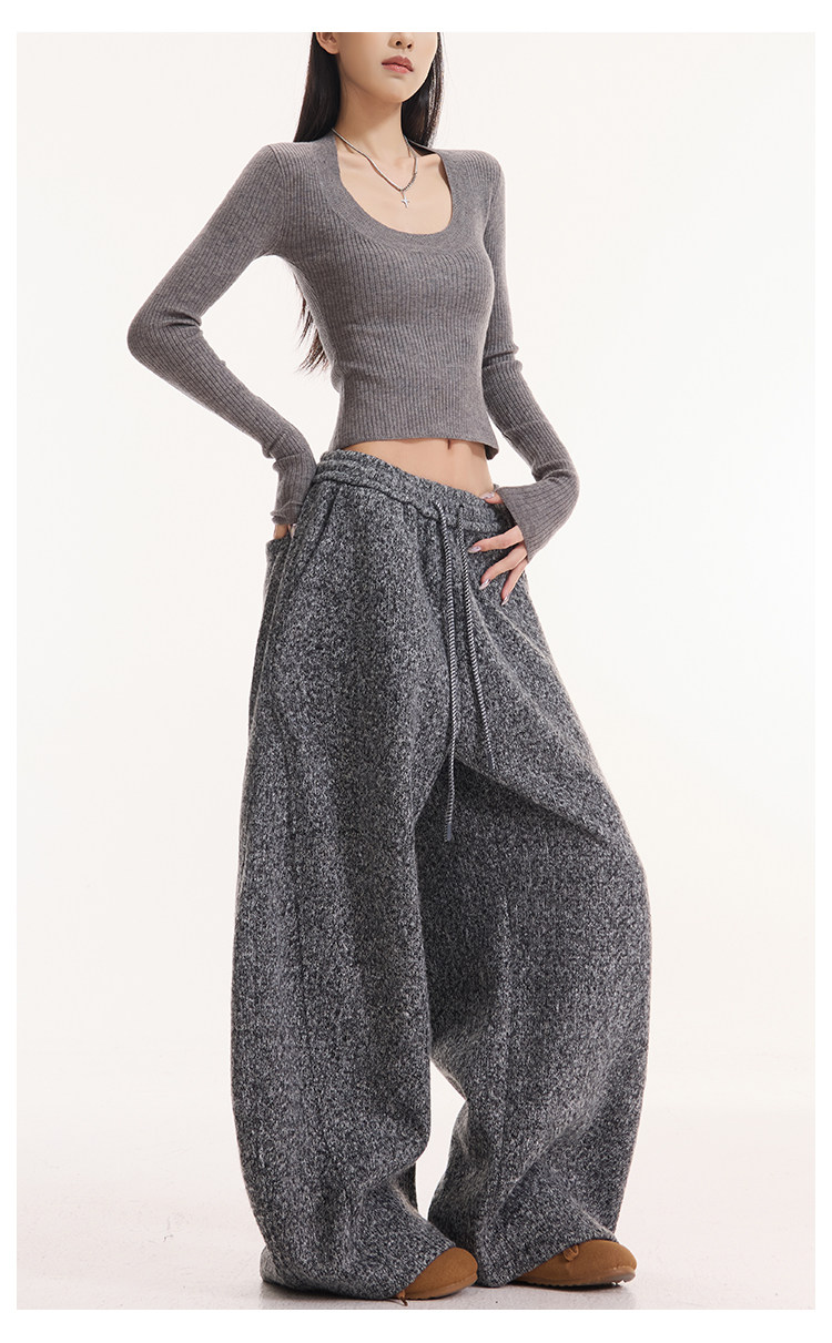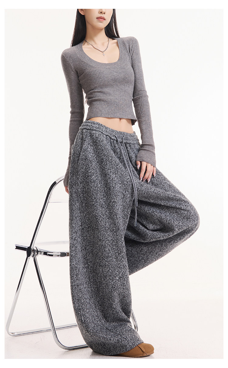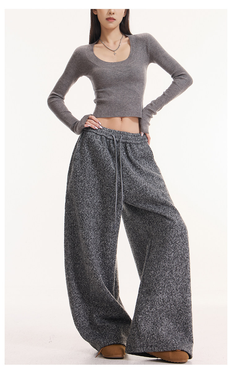Kenabstudio Autumn and Winter New Gray Wide-Leg Casual Pants for Women, Thickened and Fleece-Lined, Elastic Waist Scimitar Pants