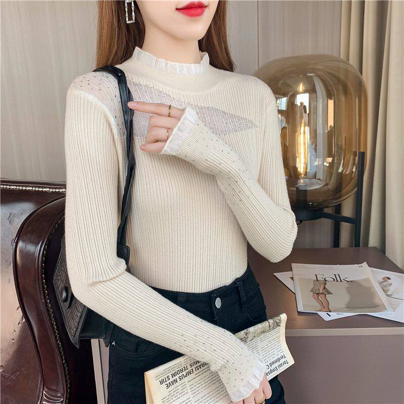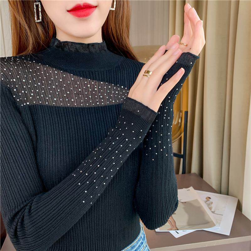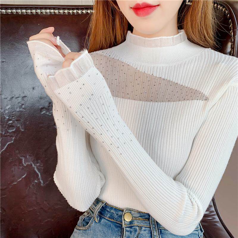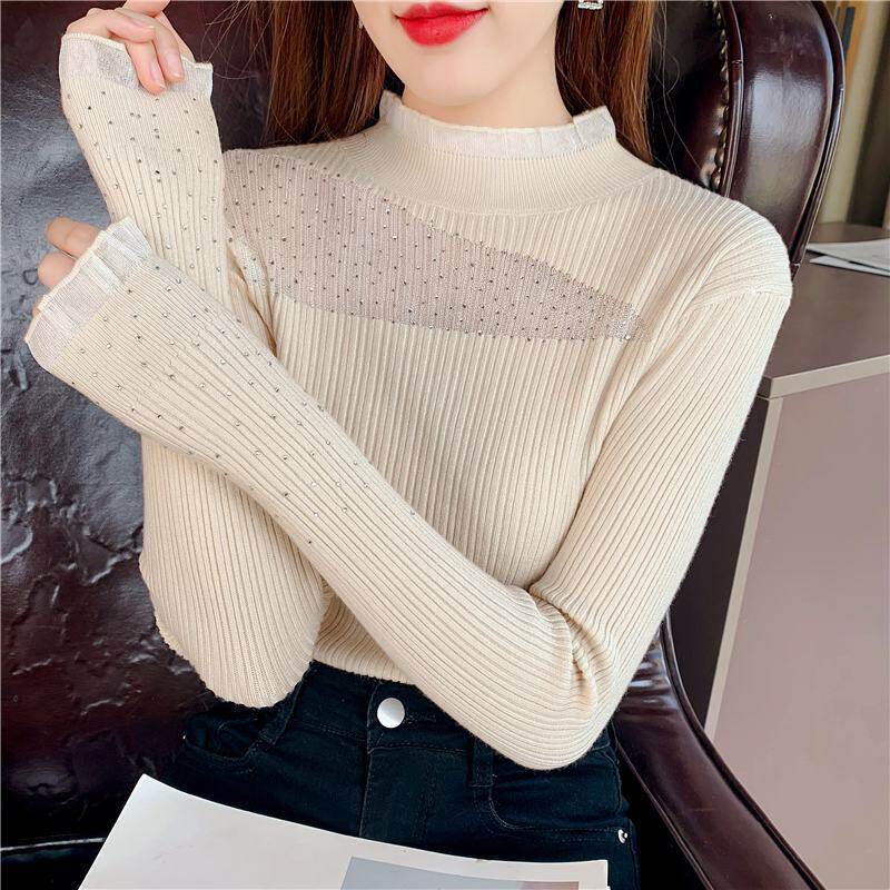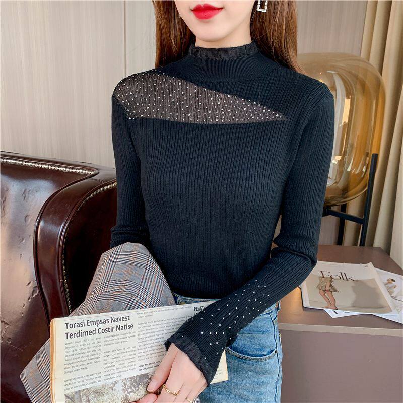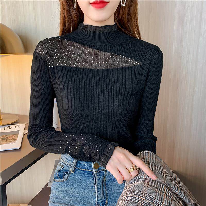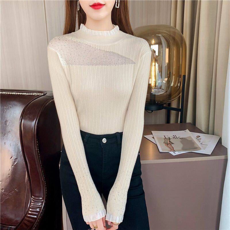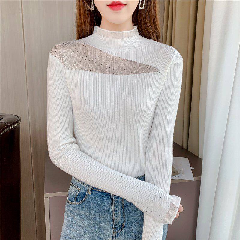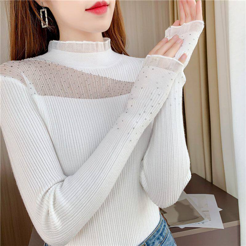 2025 Autumn/Winter New Korean Style Sweet Women's Mesh Half-Collar Long Sleeve Pullover Sweater with Ring Detail