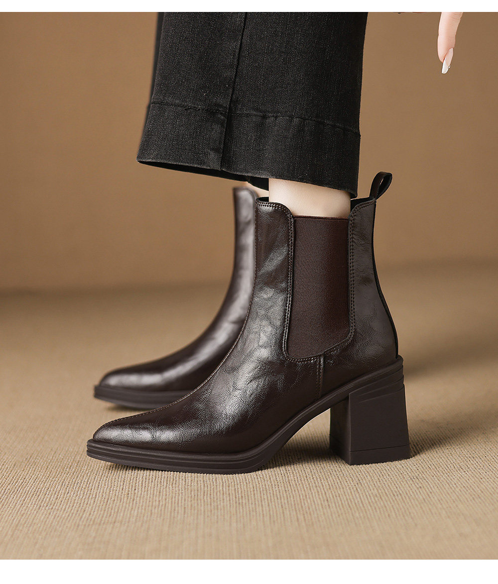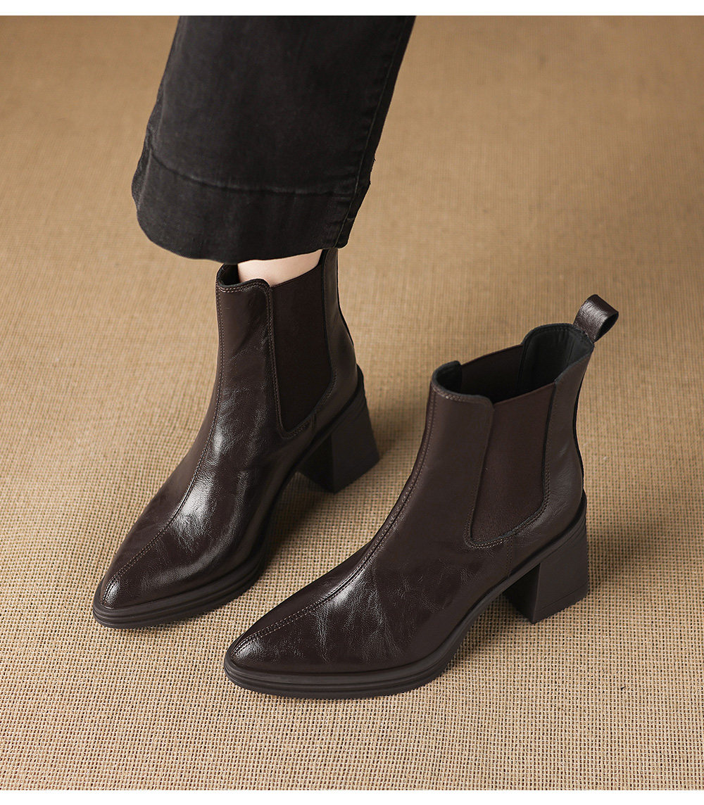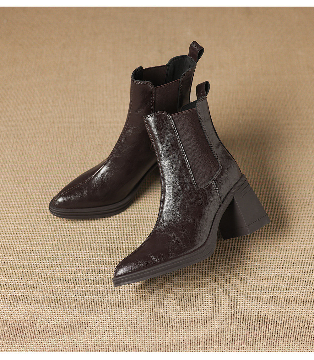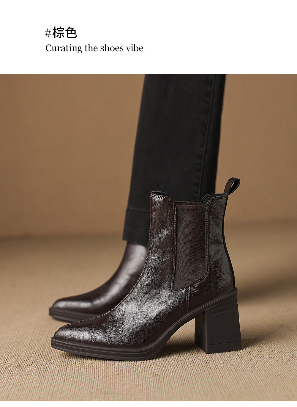 Genuine leather, good-looking, stylish, super popular, short boots for women, winter pointed-toe Chelsea coffee-colored thick-heeled high-heeled shoes