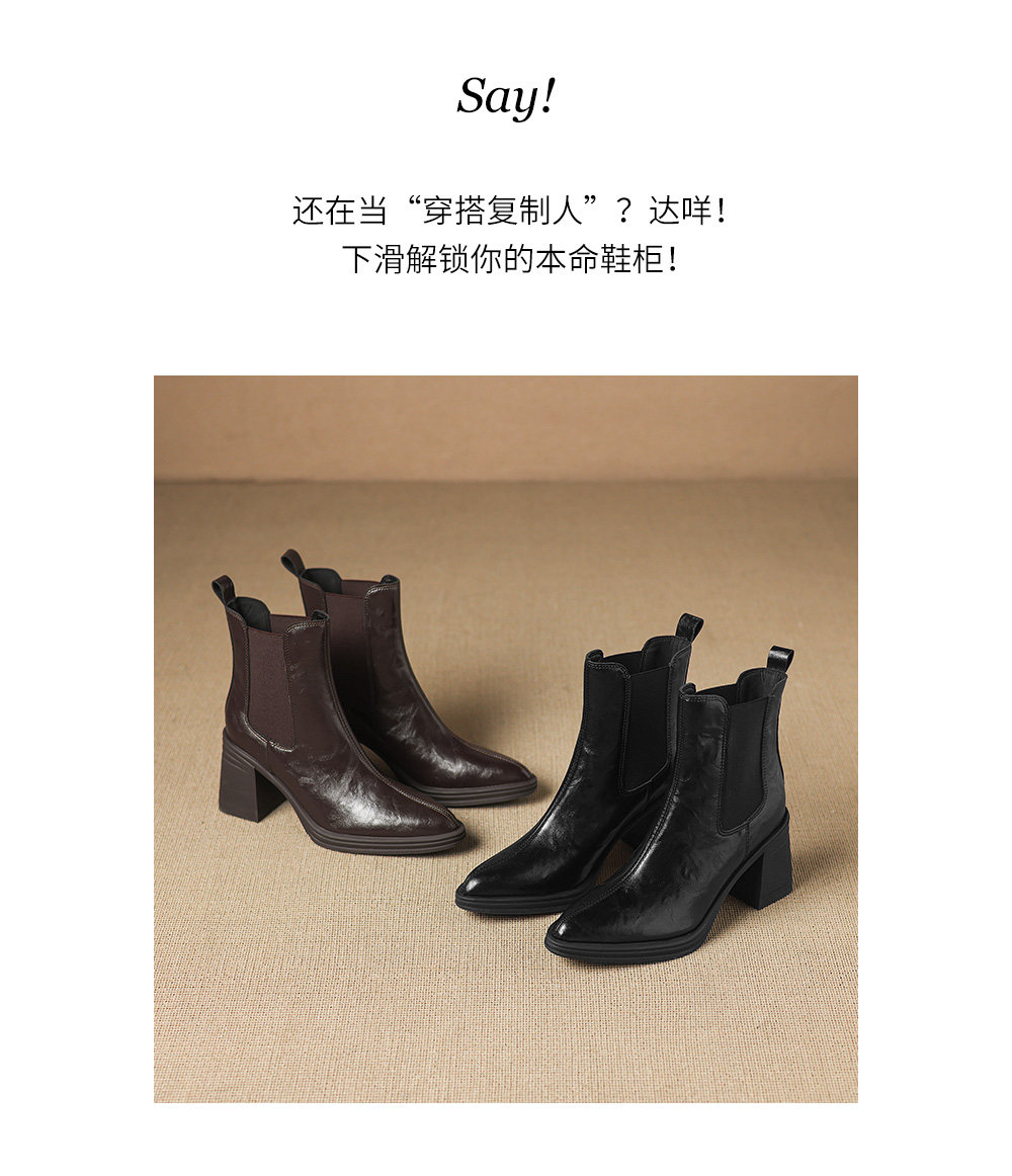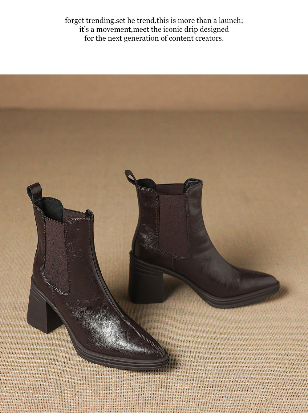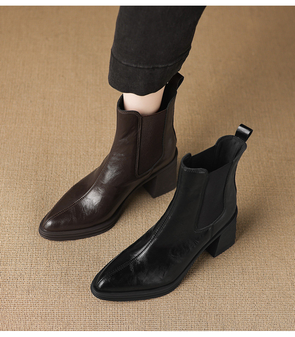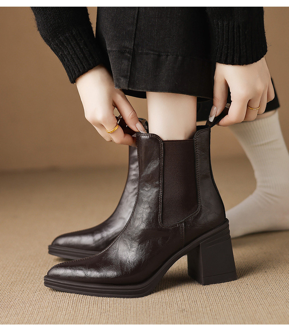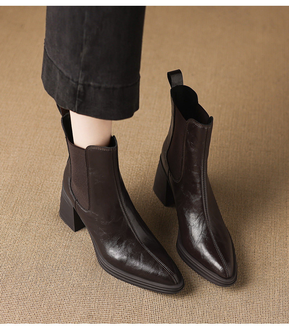 Genuine leather, good-looking, stylish, super popular, short boots for women, winter pointed-toe Chelsea coffee-colored thick-heeled high-heeled shoes