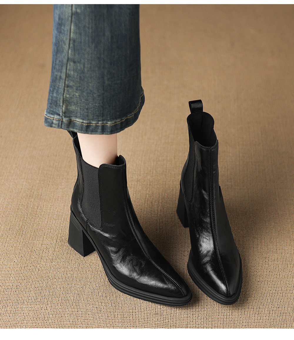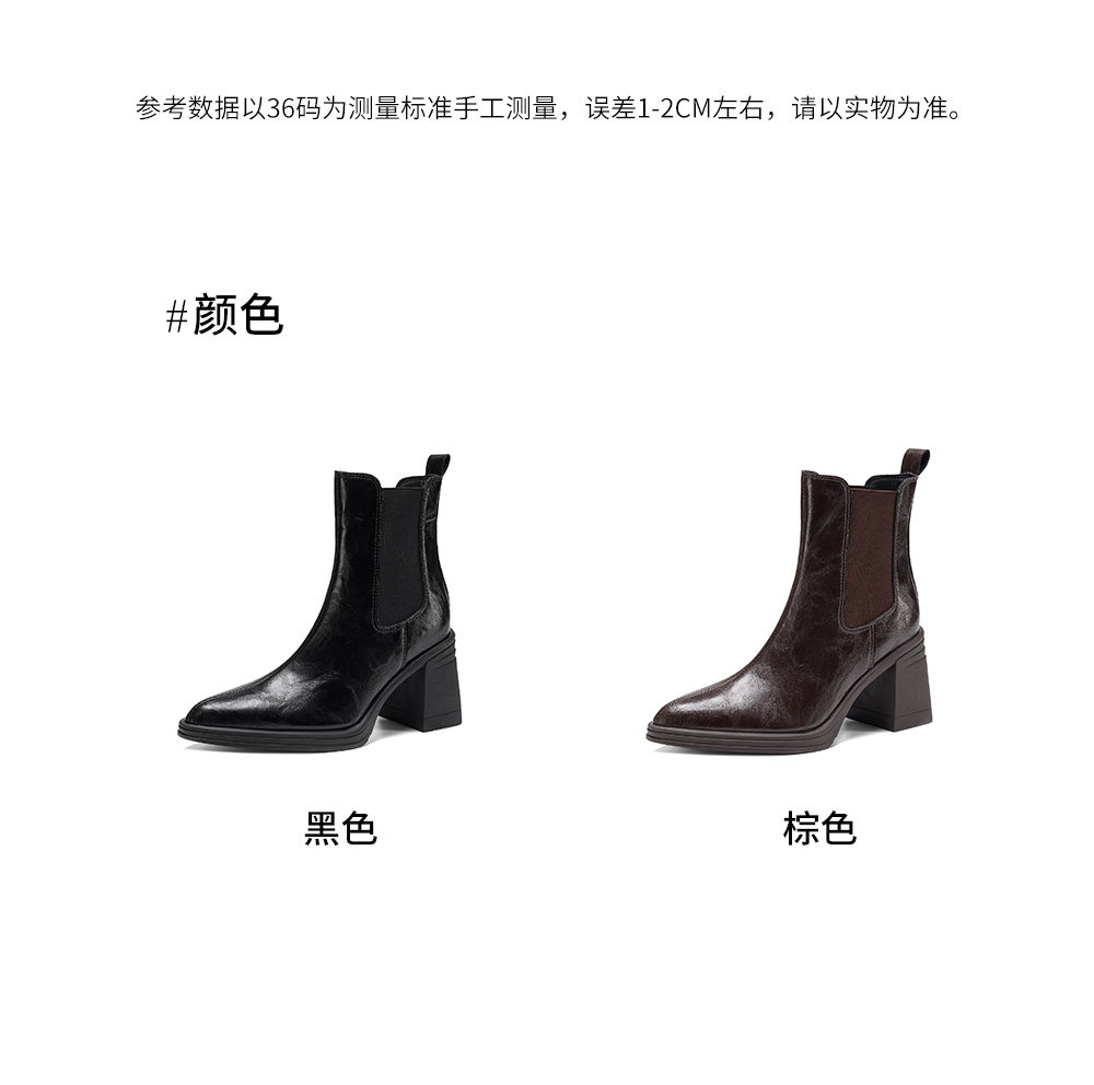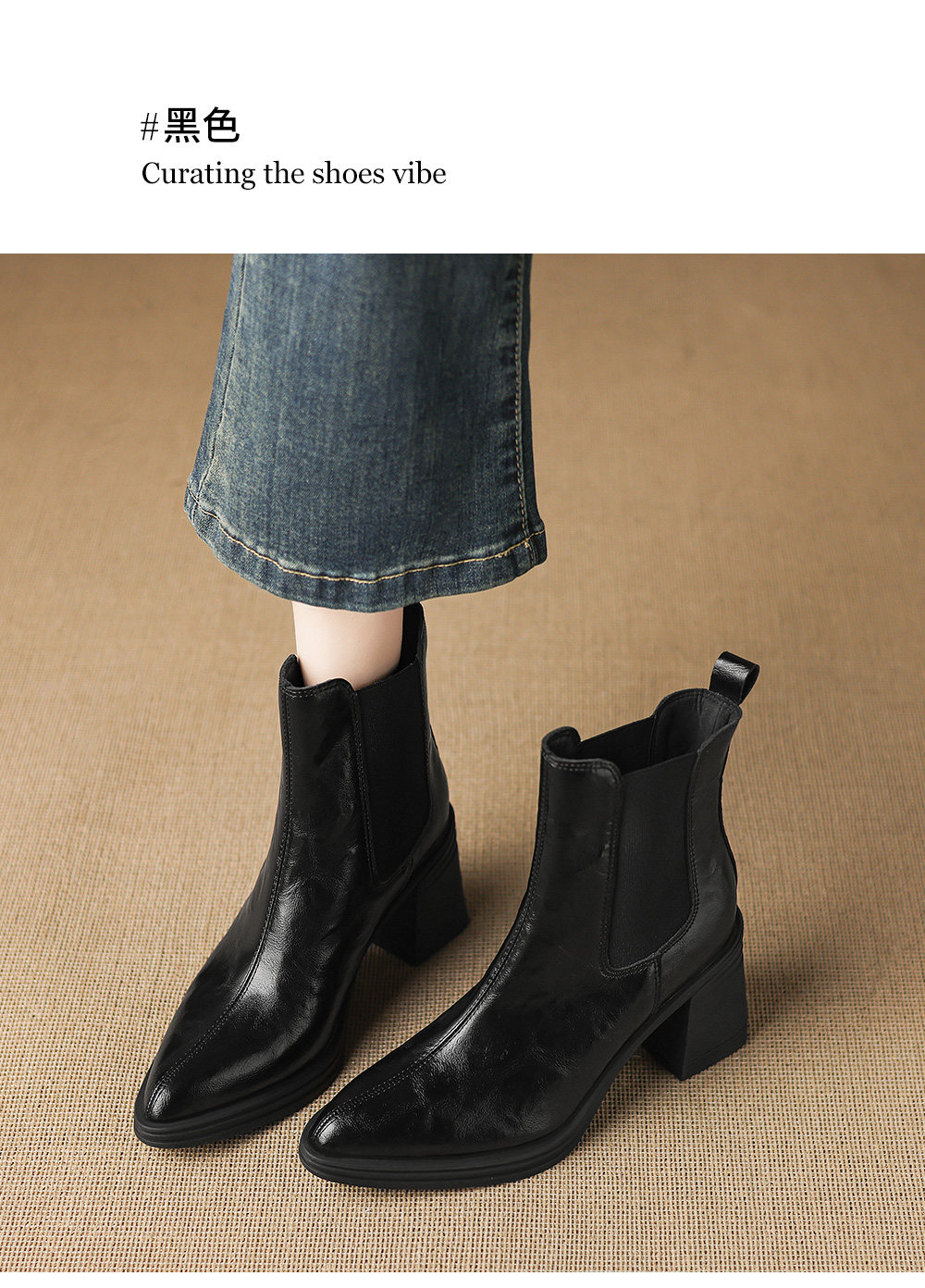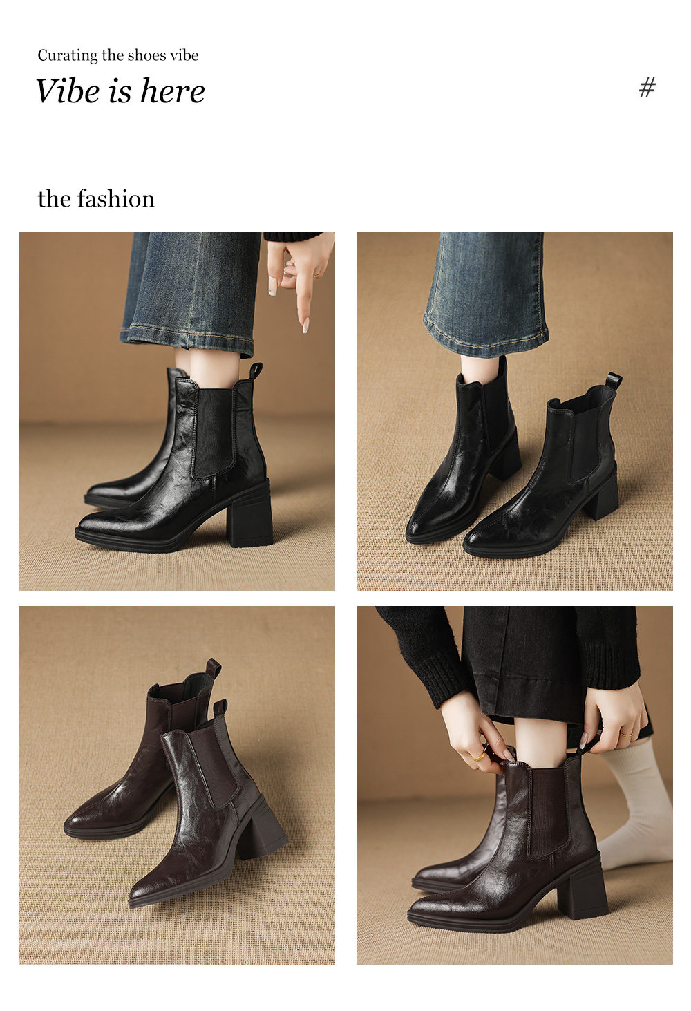 Genuine leather, good-looking, stylish, super popular, short boots for women, winter pointed-toe Chelsea coffee-colored thick-heeled high-heeled shoes