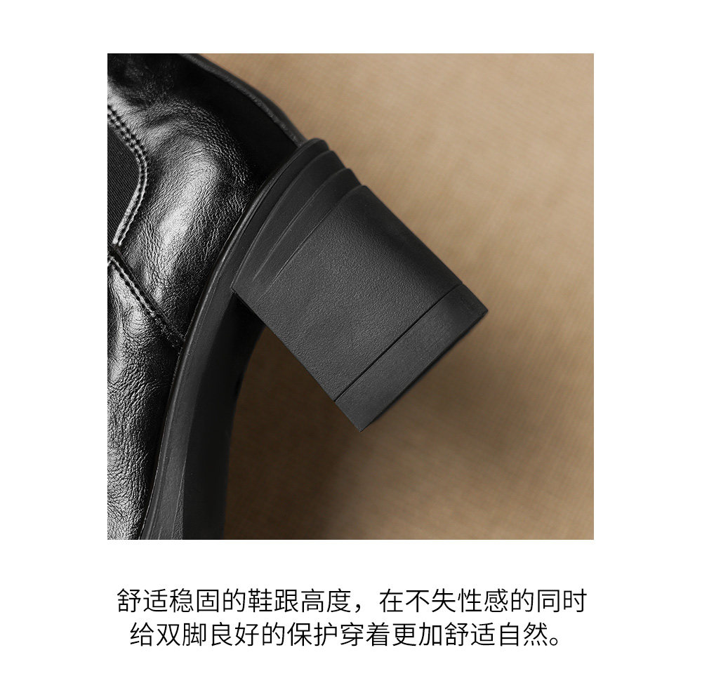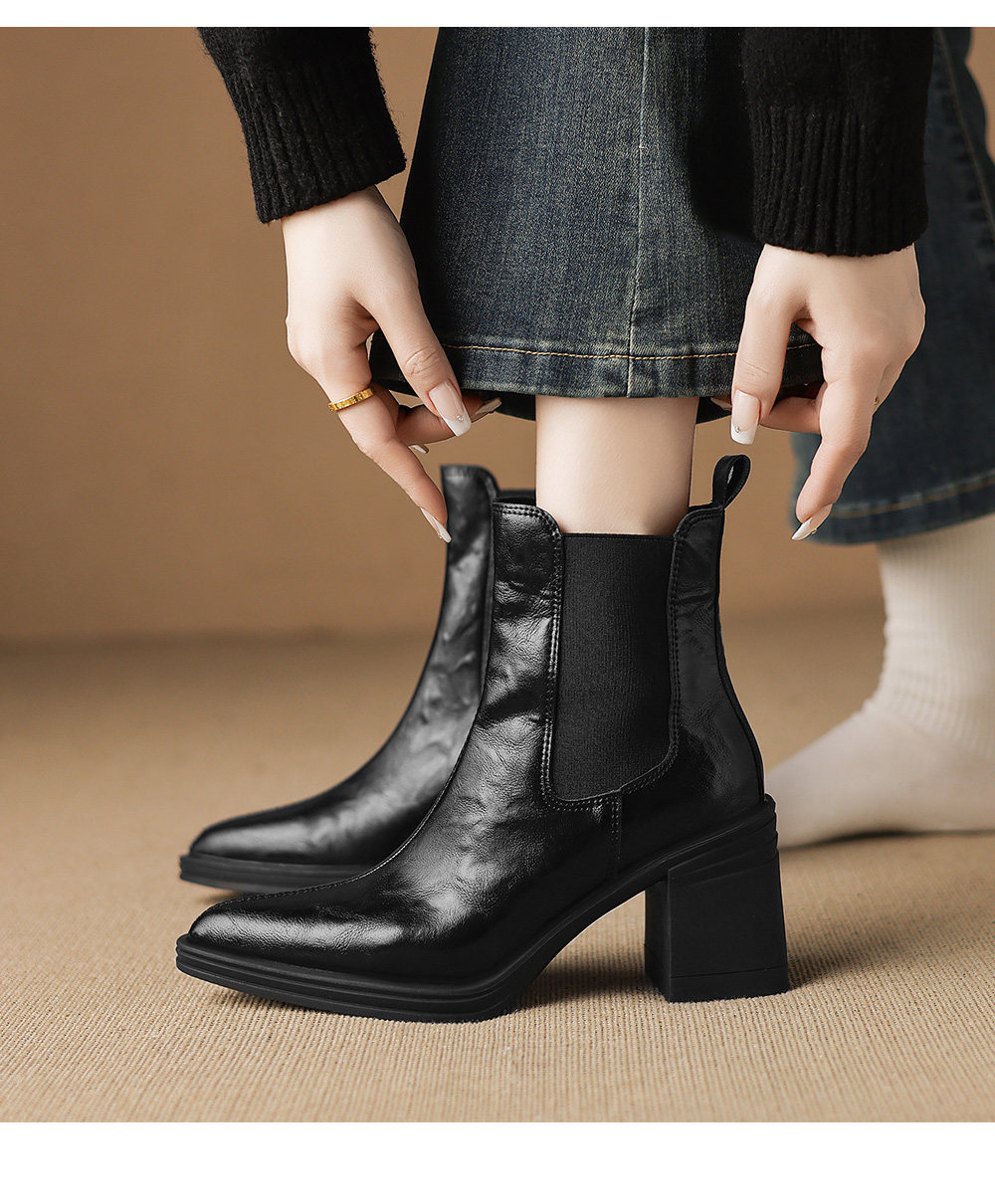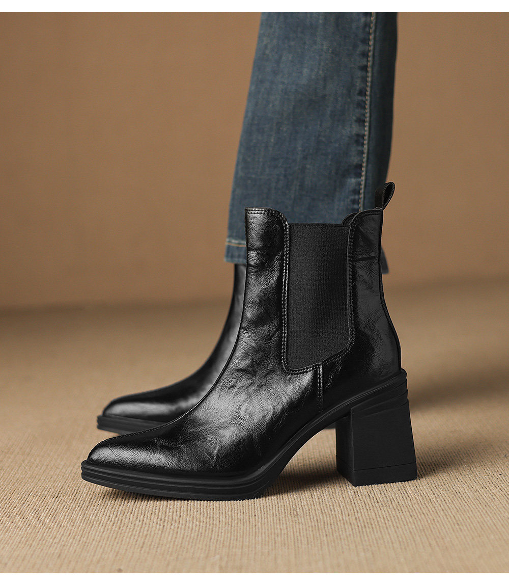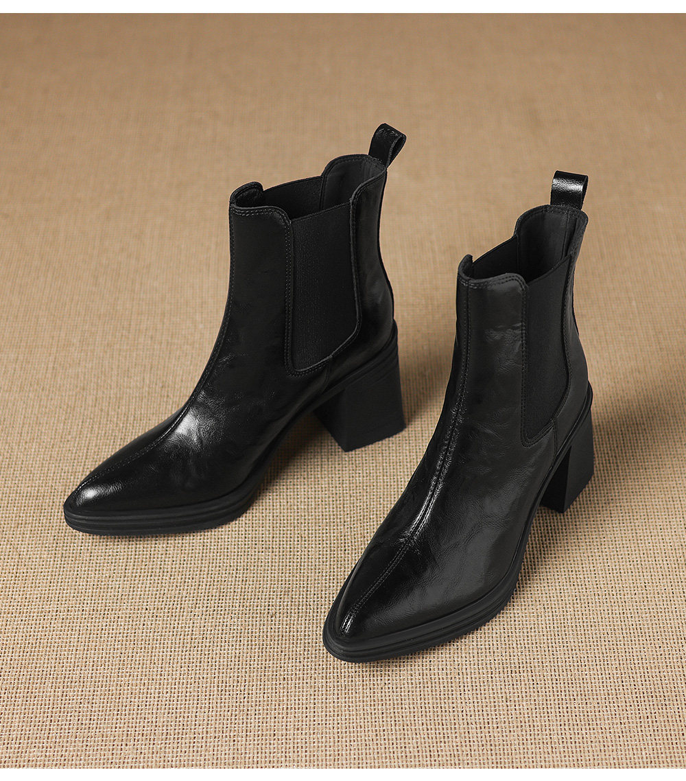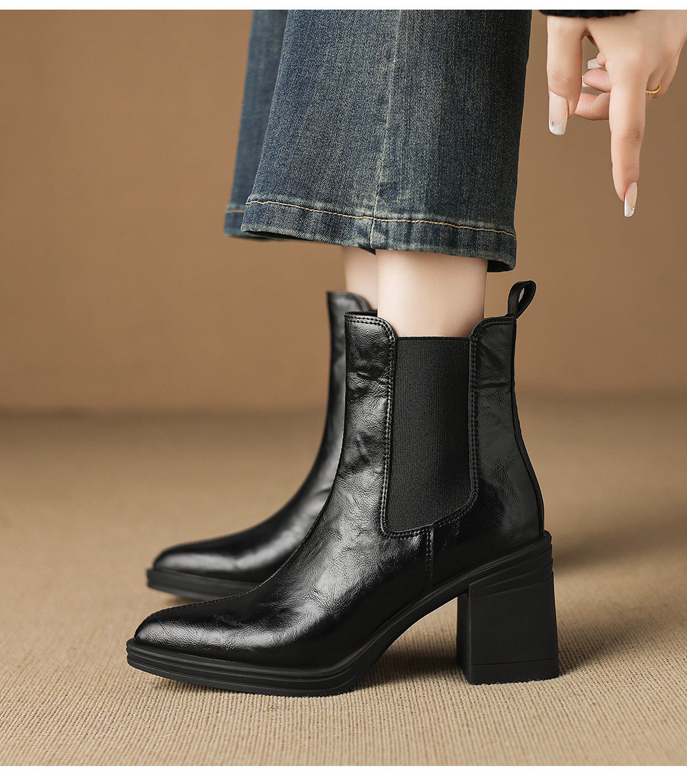 Genuine leather, good-looking, stylish, super popular, short boots for women, winter pointed-toe Chelsea coffee-colored thick-heeled high-heeled shoes