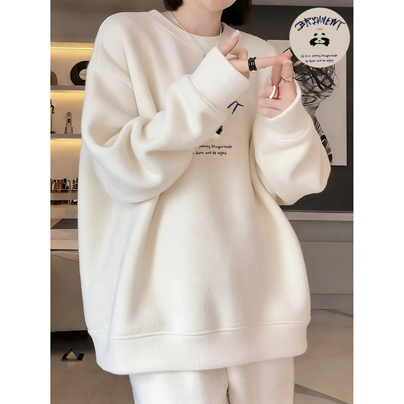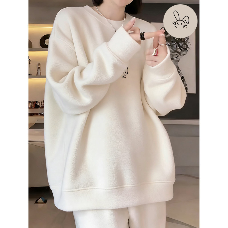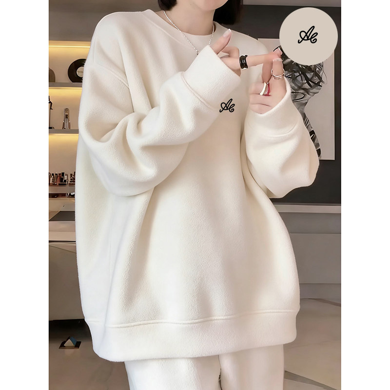 High-end round neck soft waxy German velvet beige sweatshirt for women autumn and winter fashion mid-length round neck long-sleeved warm jacket
