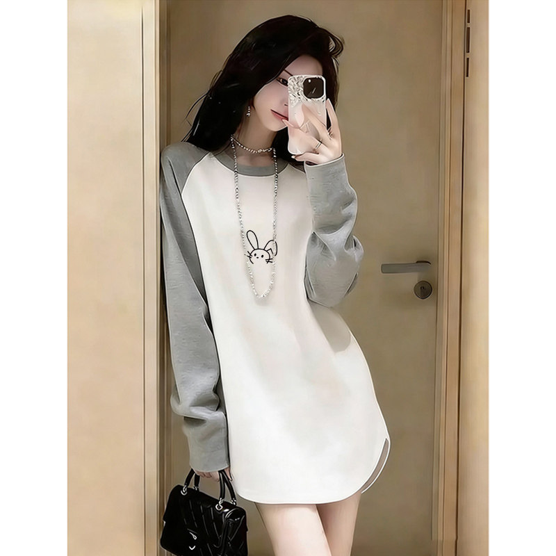 Raglan contrasting color thickened brushed long-sleeved T-shirt mid-length casual T-shirt over the hips thickened bottoming shirt with curved hem
