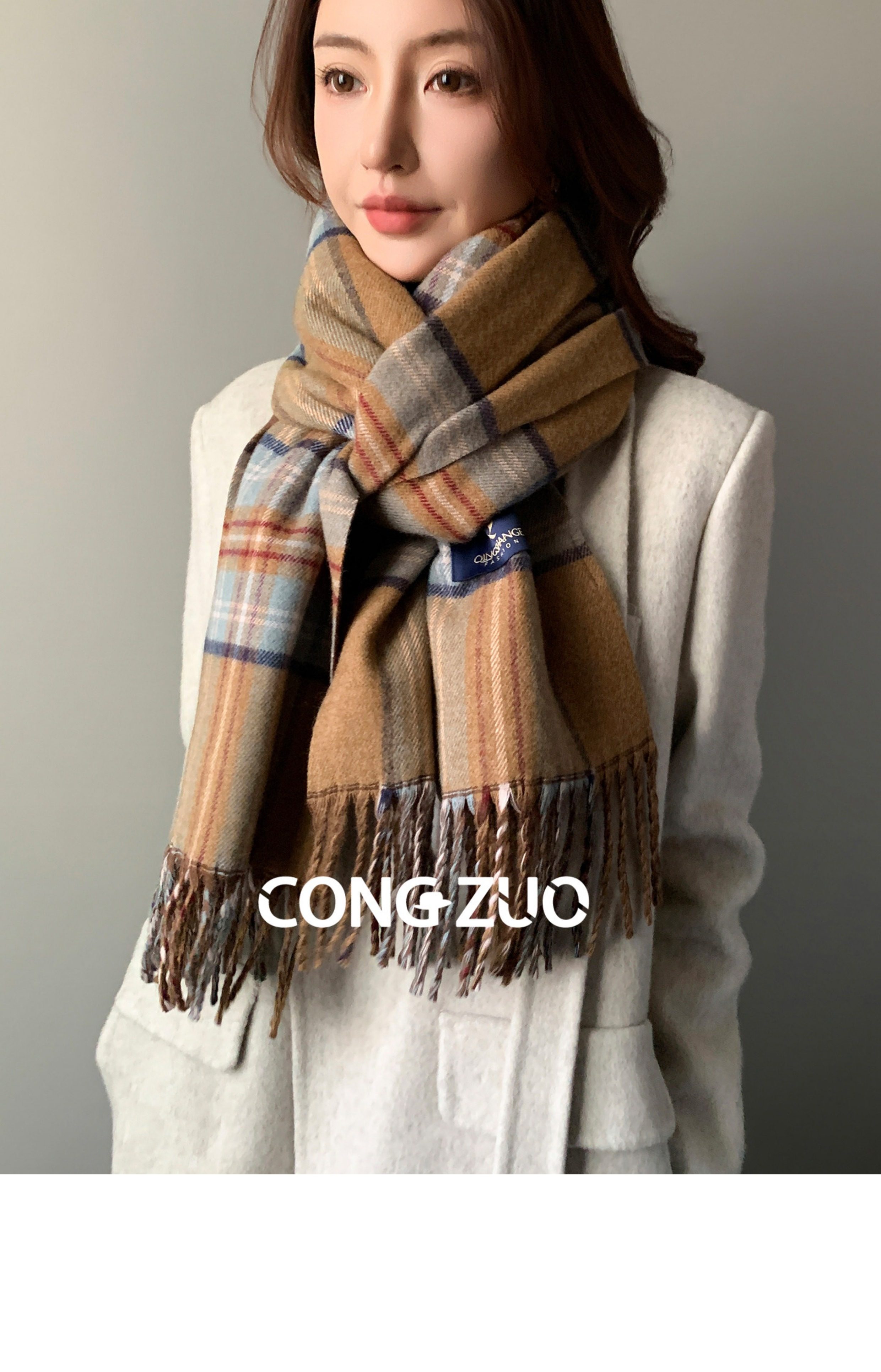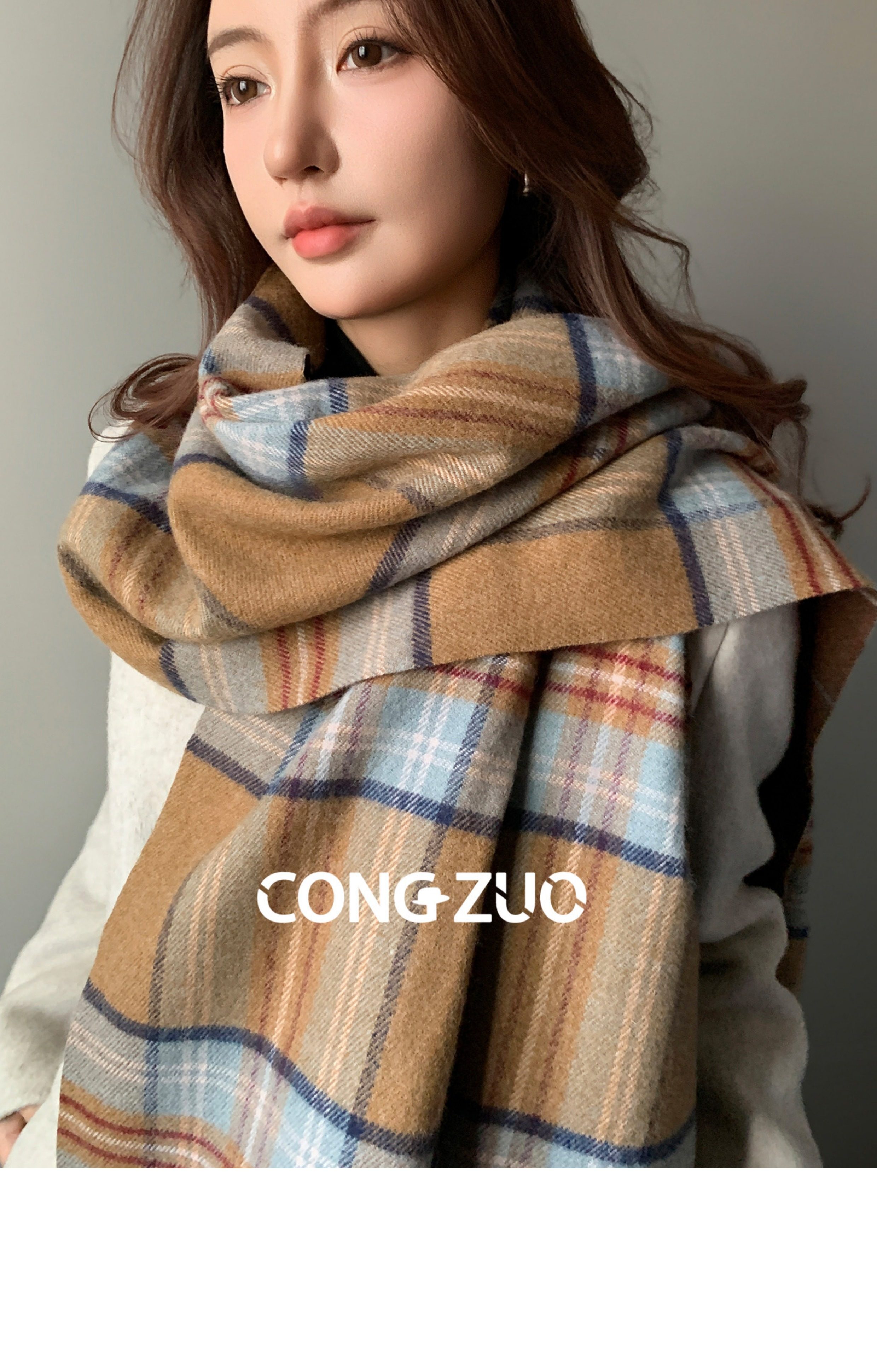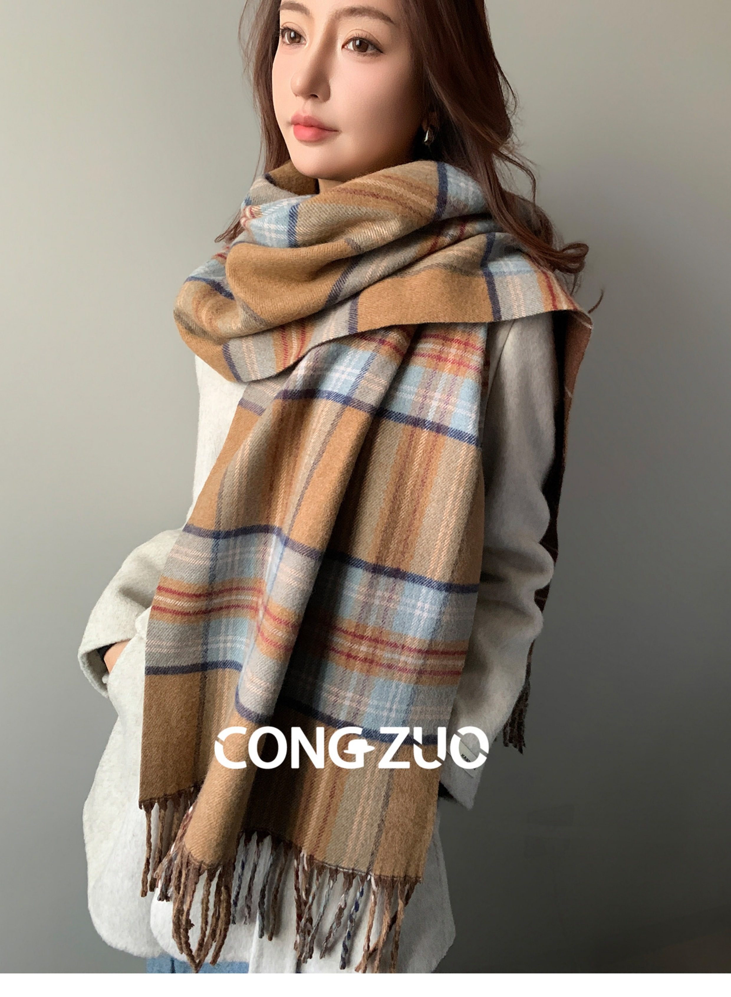 "From Zuo" Coffee-Colored Plaid Scarf for Women, New Winter Wool Blend Shawl, British Style, Warm and Thickened Neck Scarf for Autumn