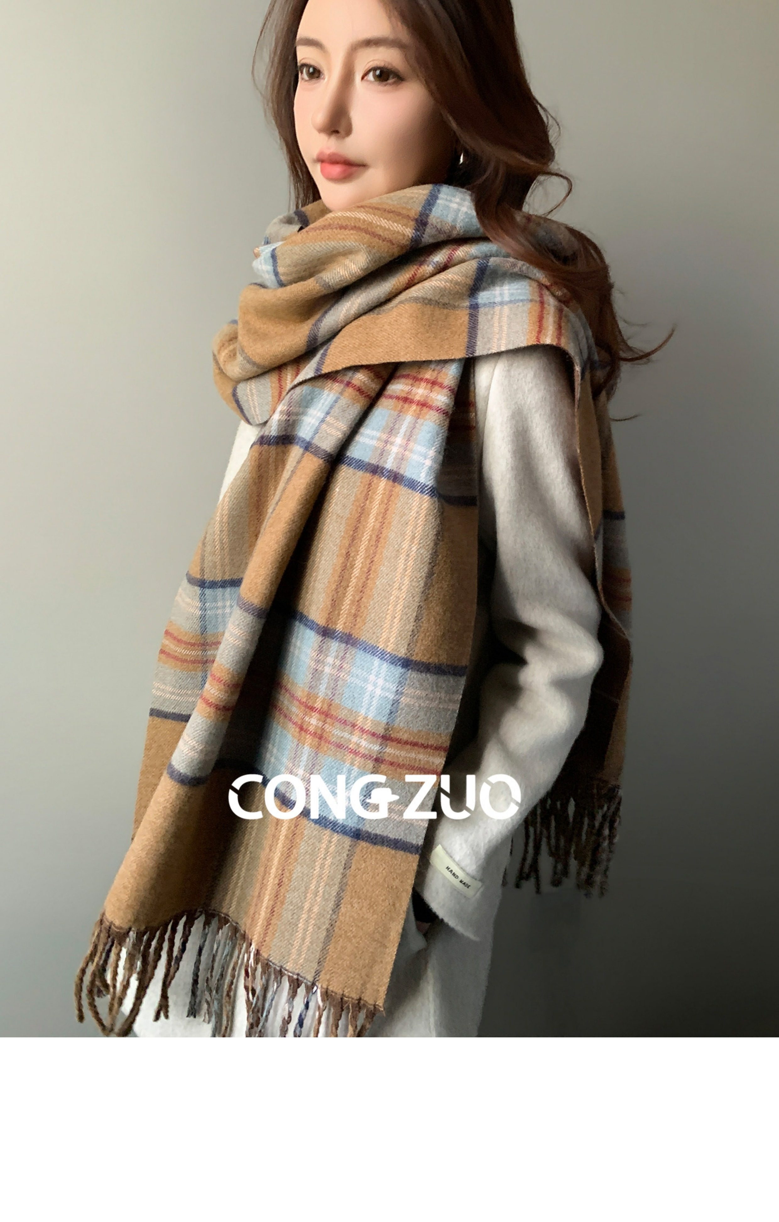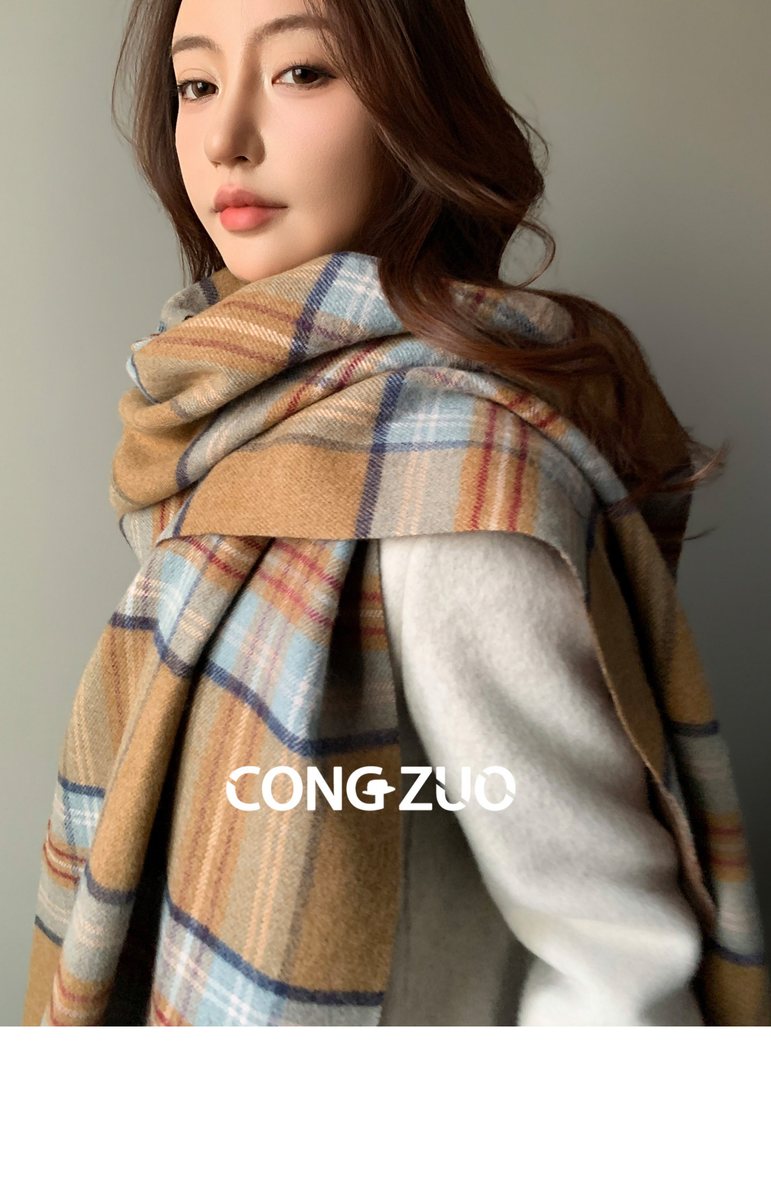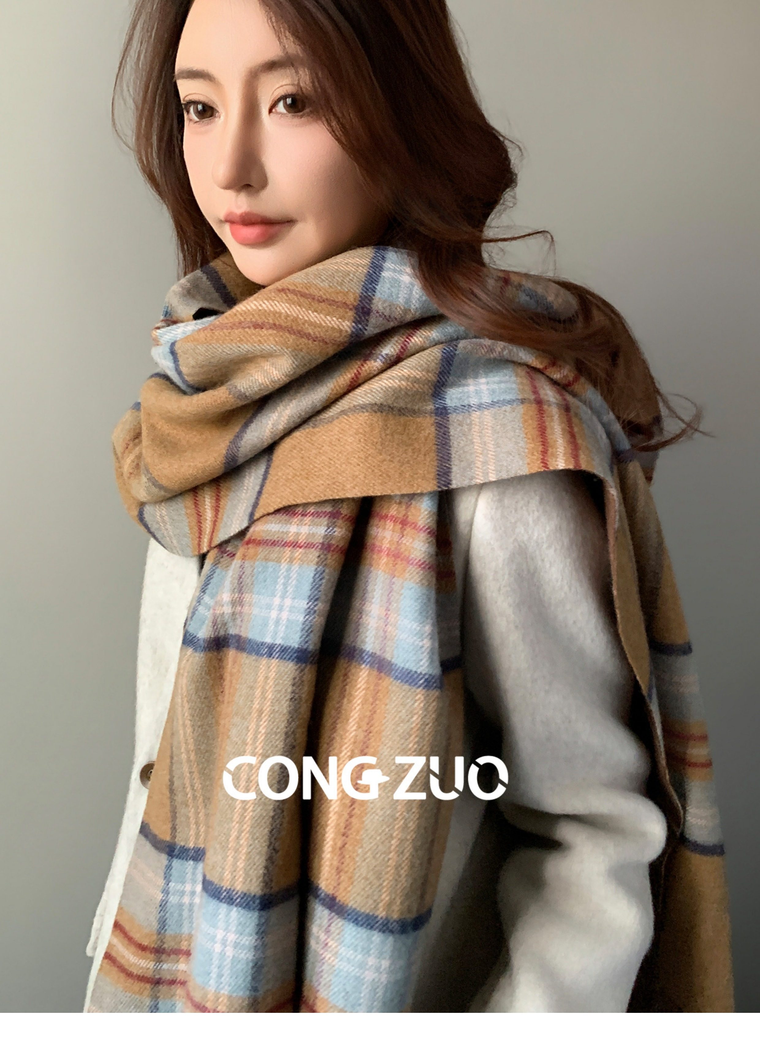 "From Zuo" Coffee-Colored Plaid Scarf for Women, New Winter Wool Blend Shawl, British Style, Warm and Thickened Neck Scarf for Autumn