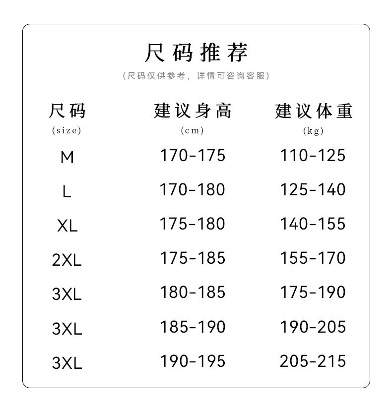 China (cm) 165 / 88-90 170 / 96-98 175 / 108-110 180 / 118-122 185 / 126-130