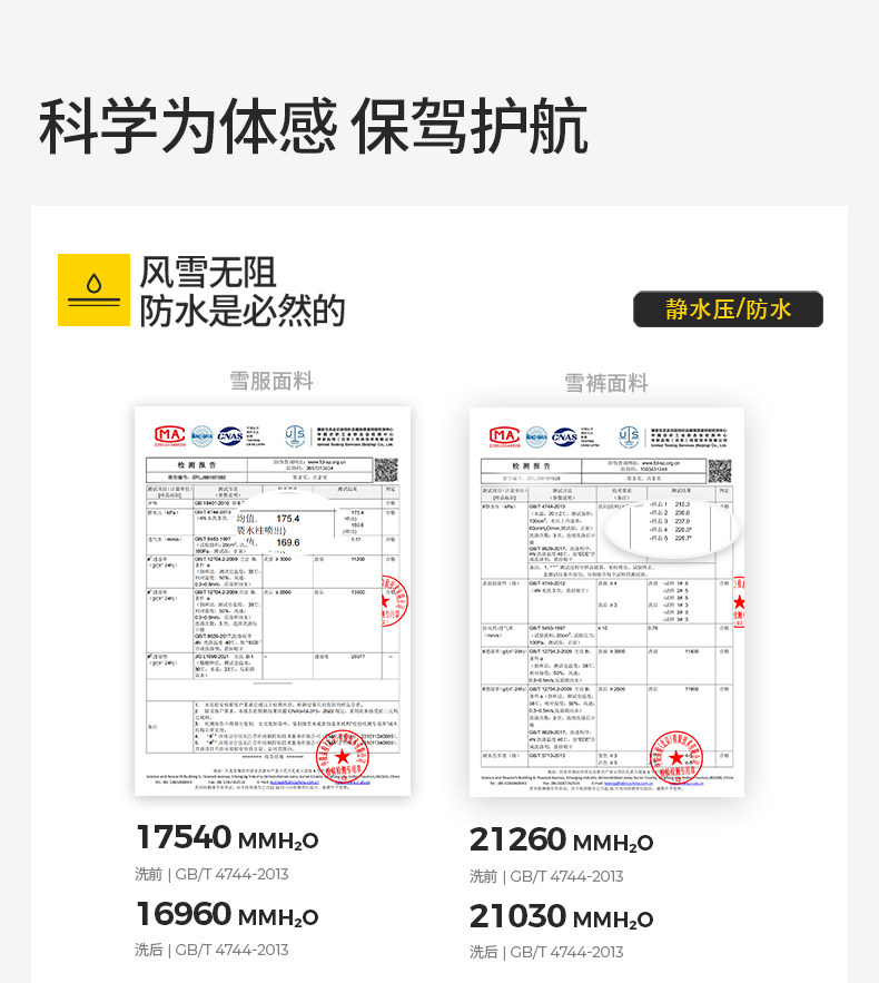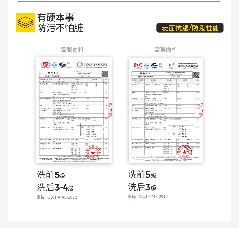 Waterproof Surface Moisture Resistance: ≥4-5 Levels before Washing, ≥3-4 Levels after Washing,Hydrostatic Pressure: before Washing - Fabric ≥ 50Kpa, Fabric Seams ≥ 40Kpa after Washing - Fabric ≥ 40Kpa, Fabric Seams ≥ 30Kpa
