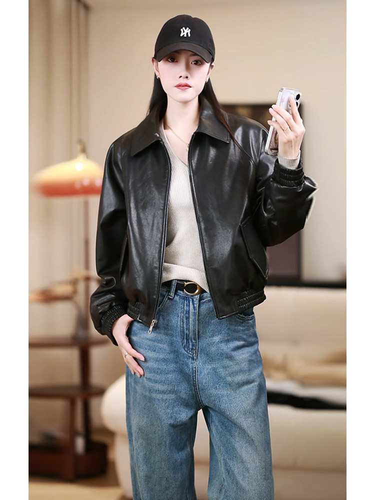 2026 Small Spring Genuine Leather Korean Style Women's Short Sheepskin Leather Jacket Women's Square Collar Casual Jacket
