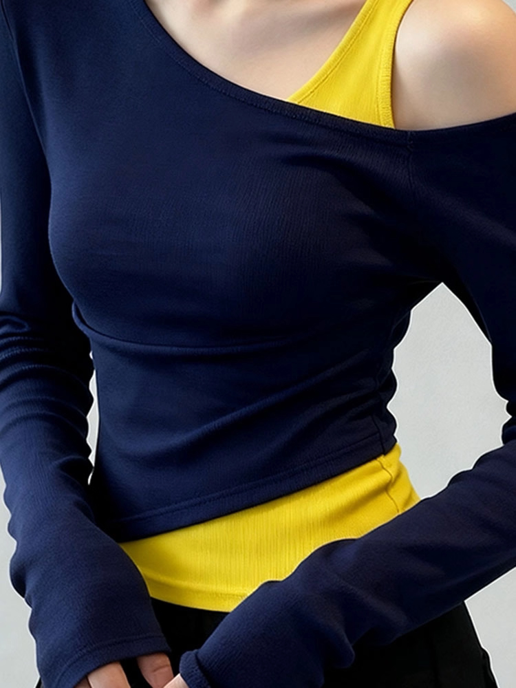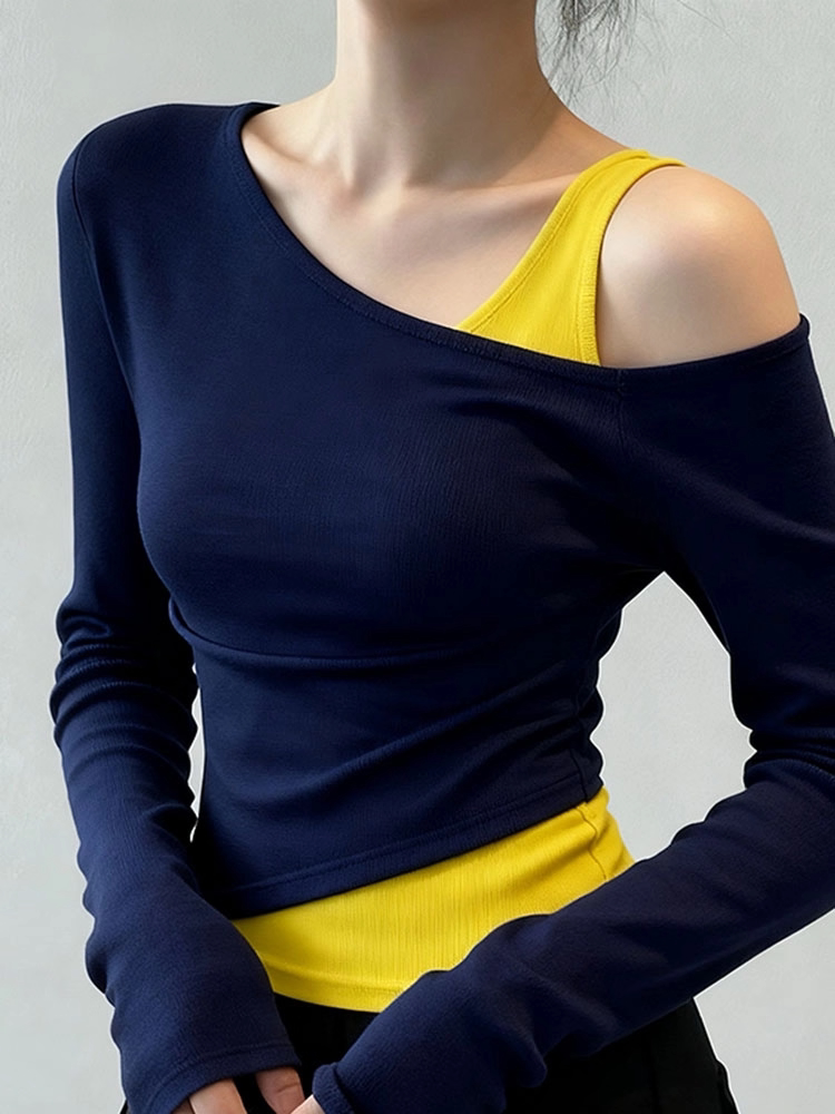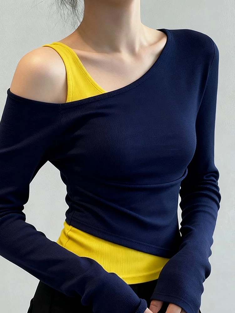 Fake two-piece slanted shoulder long-sleeved T-shirt for women 2026 spring new style waist slim fit with navy blue bottoming shirt top