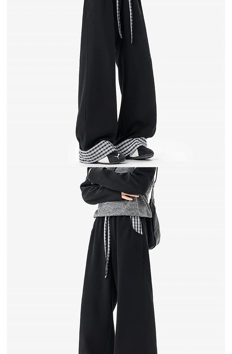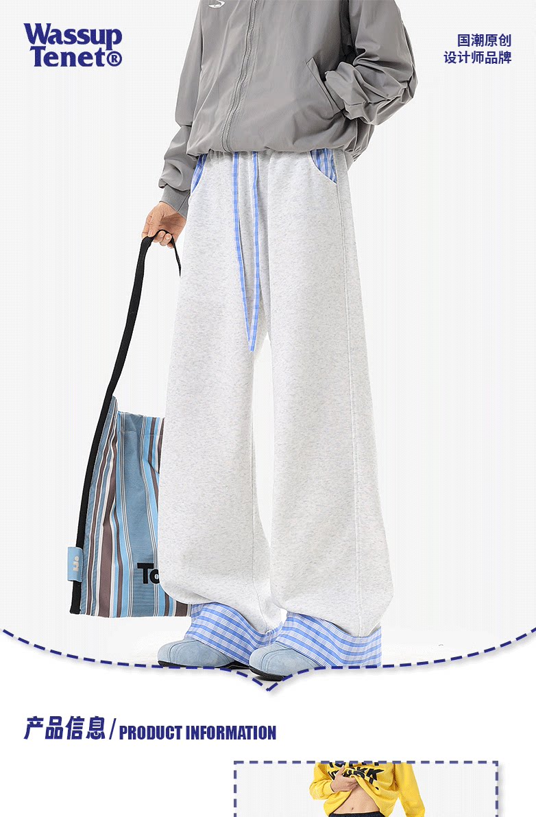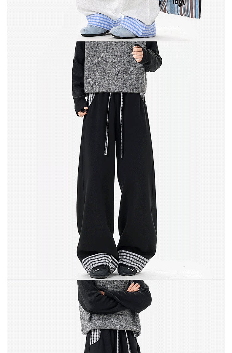Wassup Tenet American-Style Plaid Color-Blocked Curved Hem Sweatpants for Men, Spring Casual Drapey Long Pants with a Relaxed Fit
