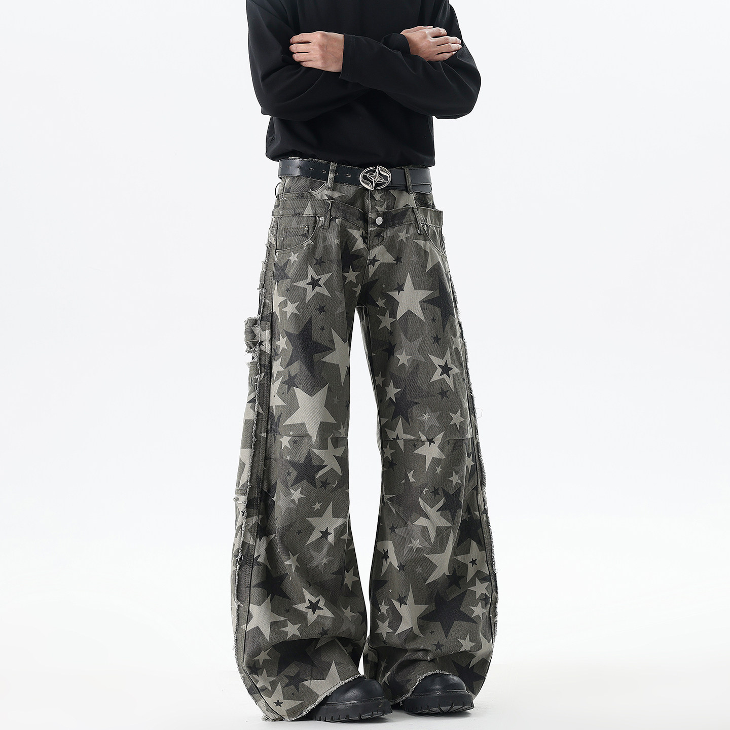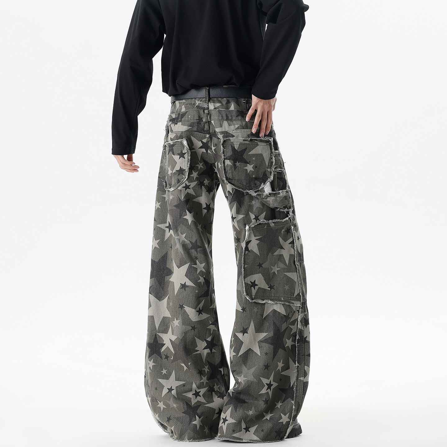 American Retro Star-Patterned Distressed Camouflage Cargo Pants for Men and Women, Spring Trendy Brand Loose Double-Waist Banana-Shaped Long Pants