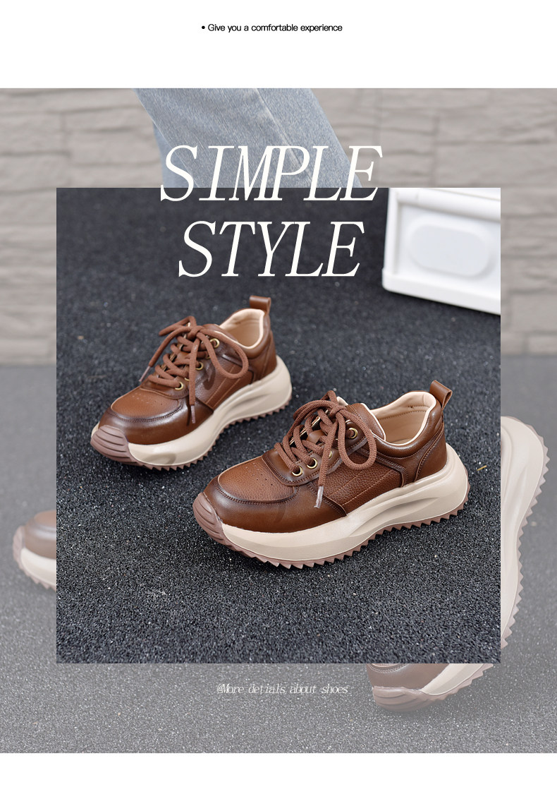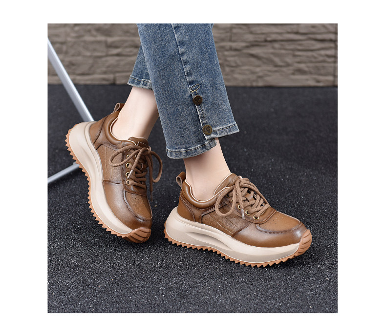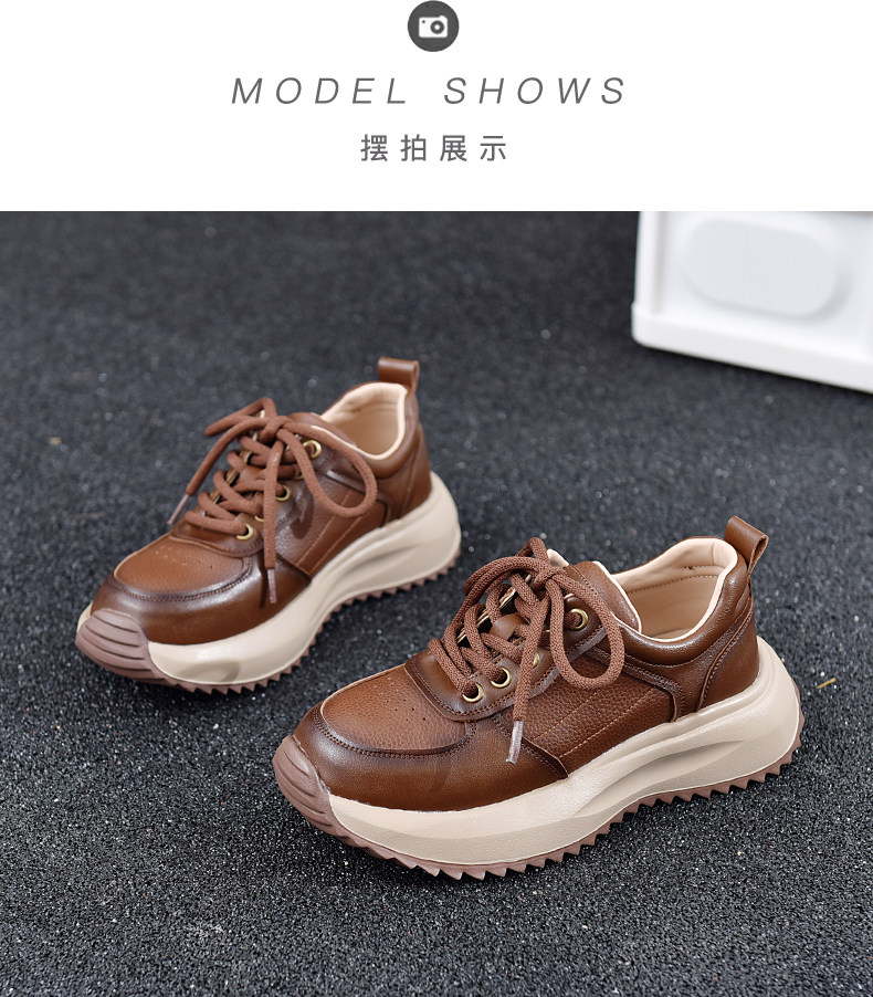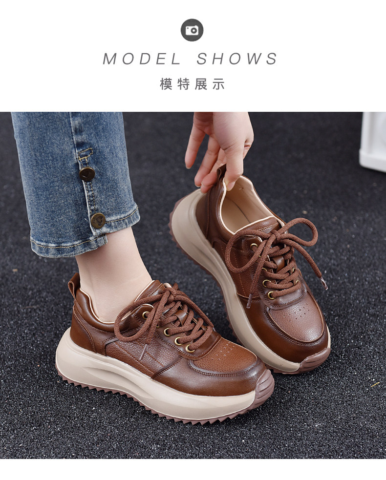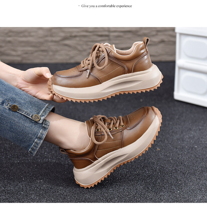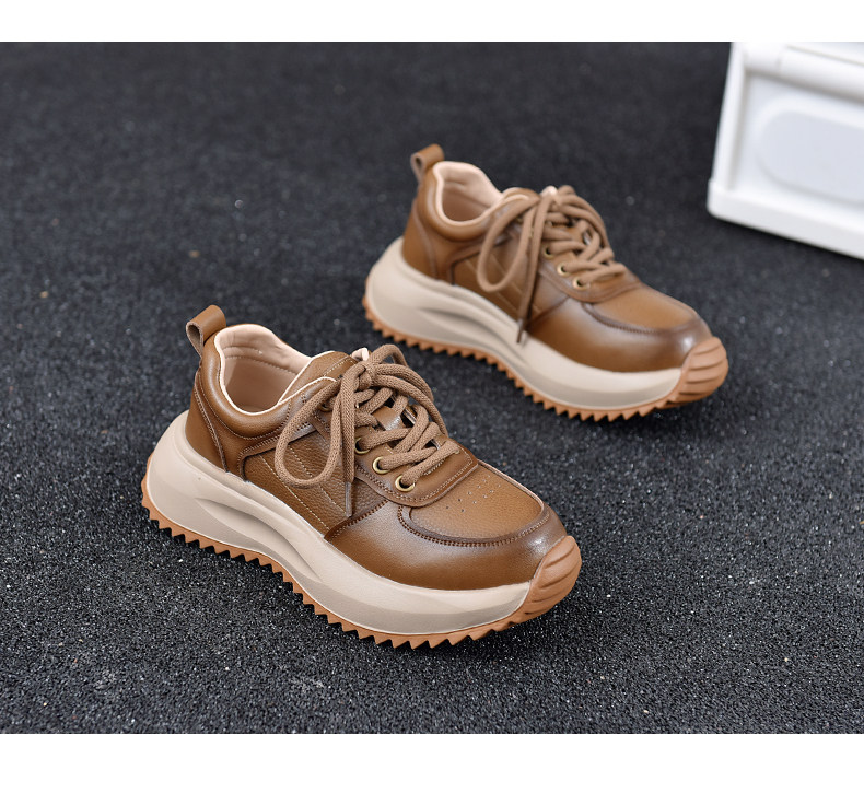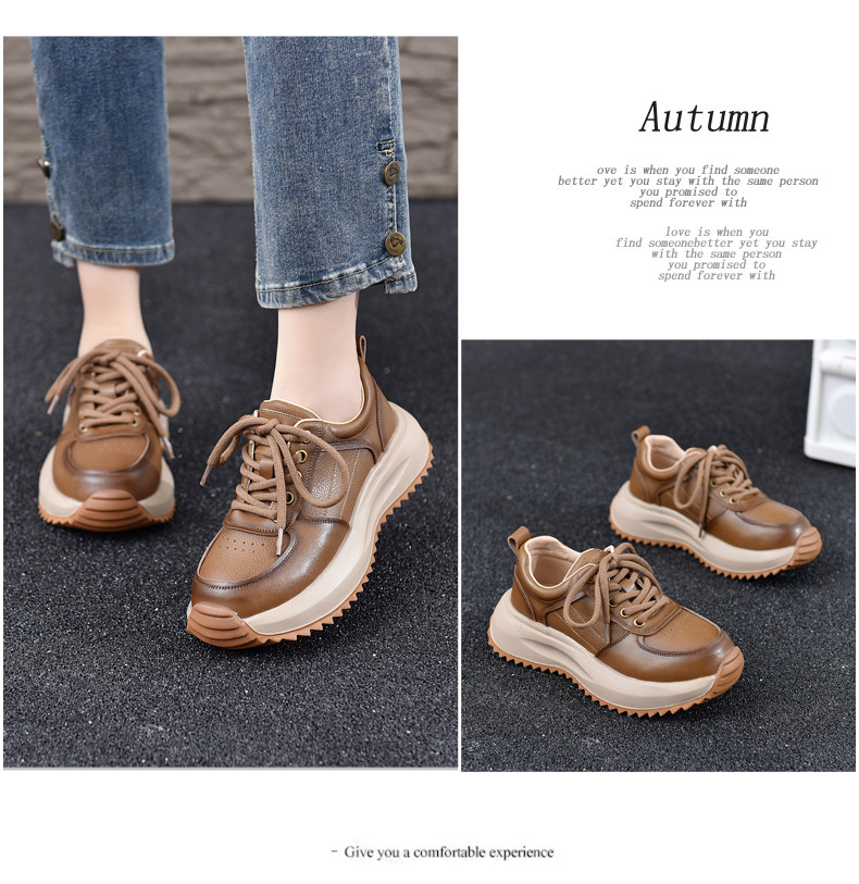 Genuine Leather Women's Shoes 2026 Spring and Autumn Thick-Soled Dad Shoes for Women in Khaki Color, Height-Increasing Versatile Sports Casual Shoes